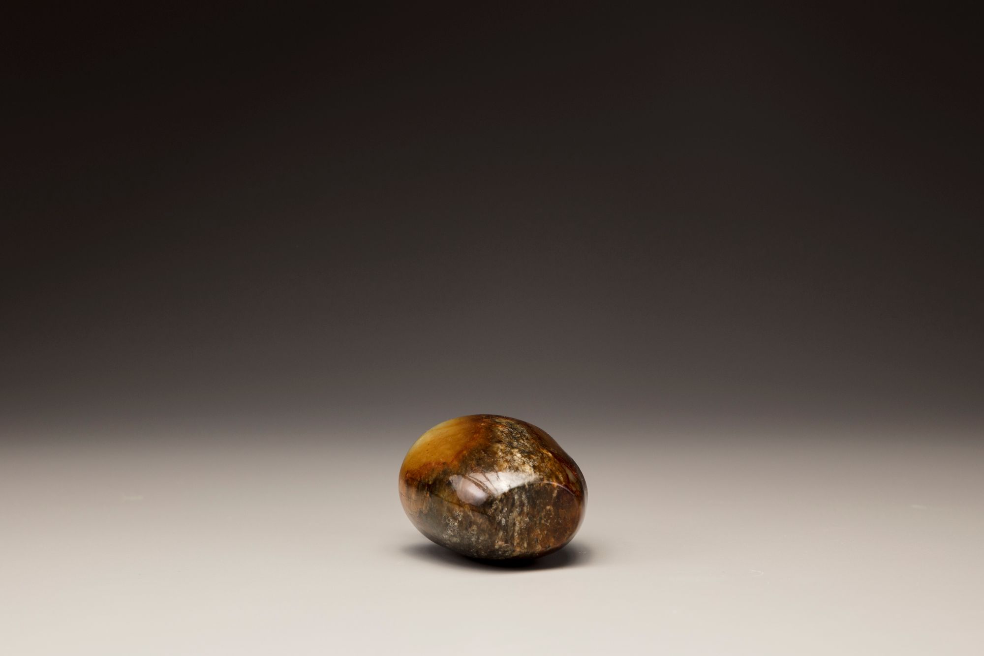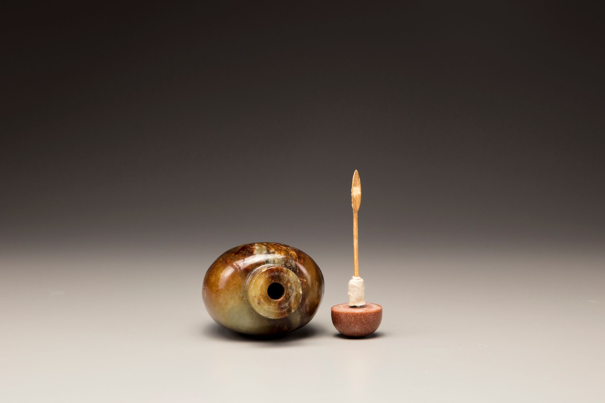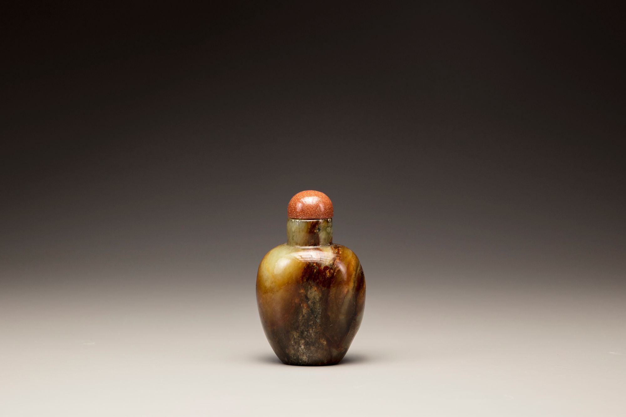 The large jade snuff bottle is simply decorated with rounded shoulders. The stone is of a celadon tone with russet and grey inclusions. With a goldstone stopper.
