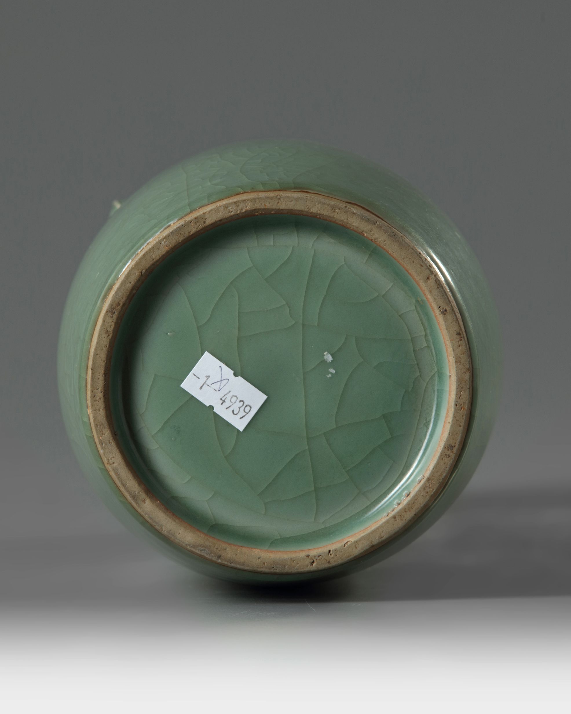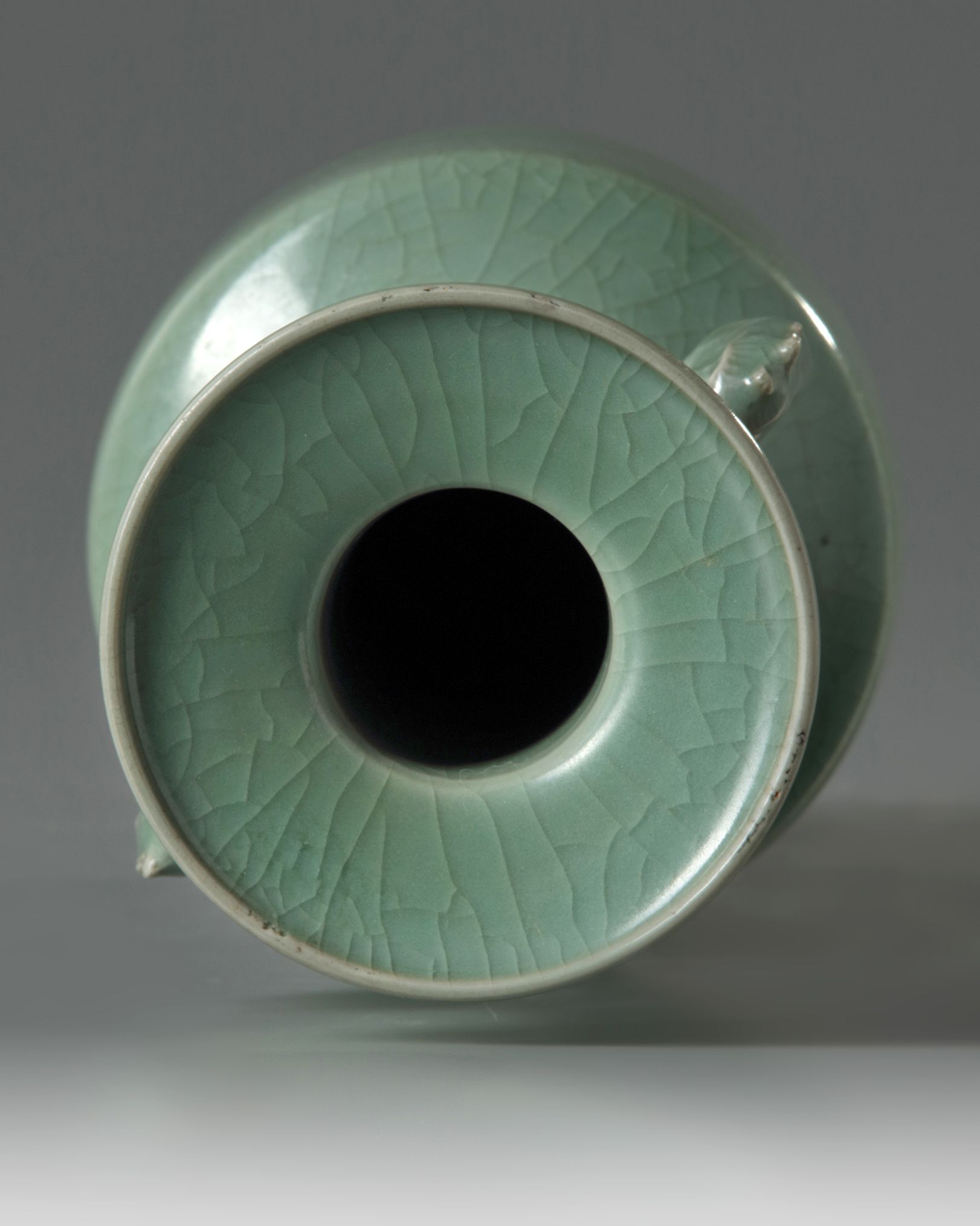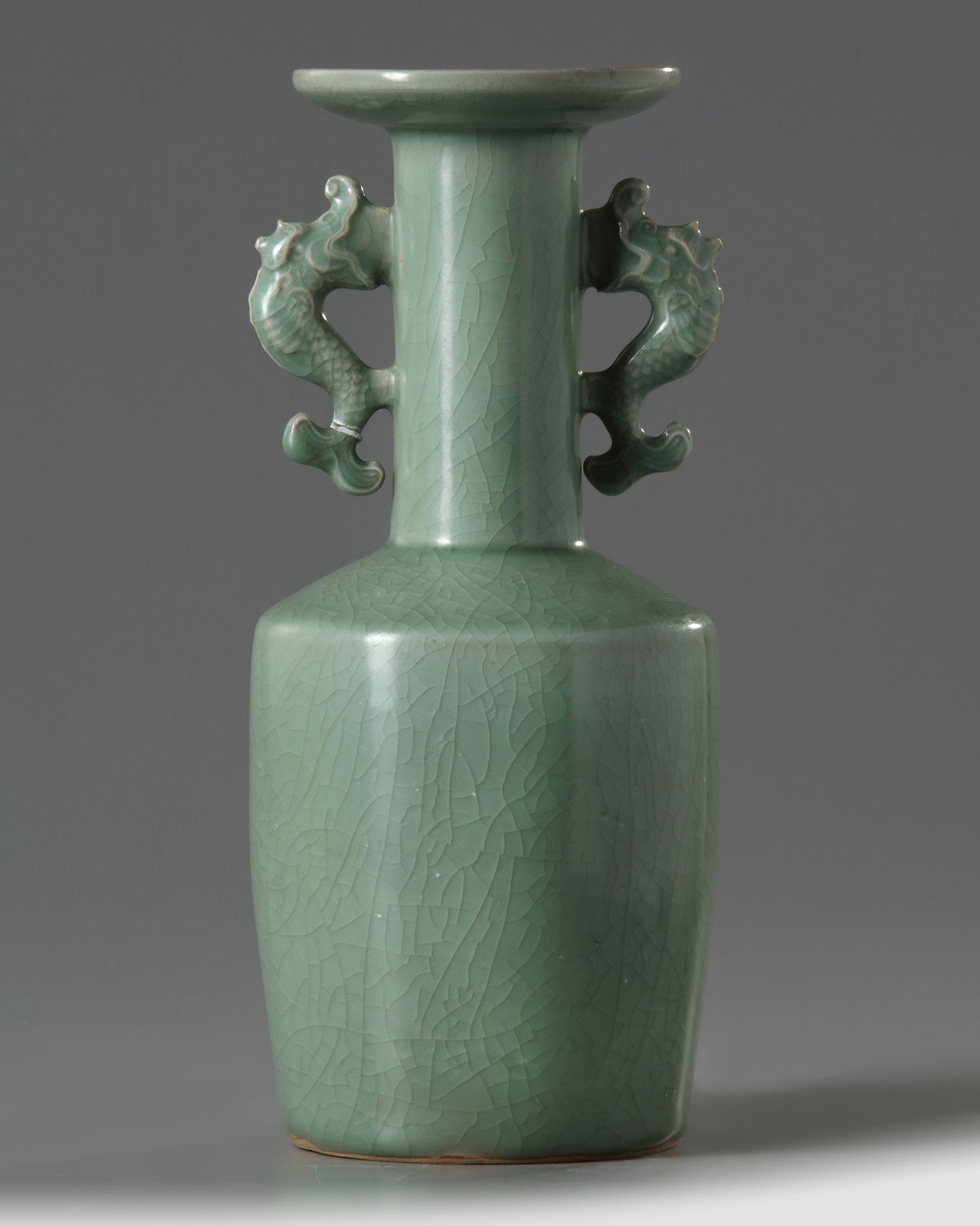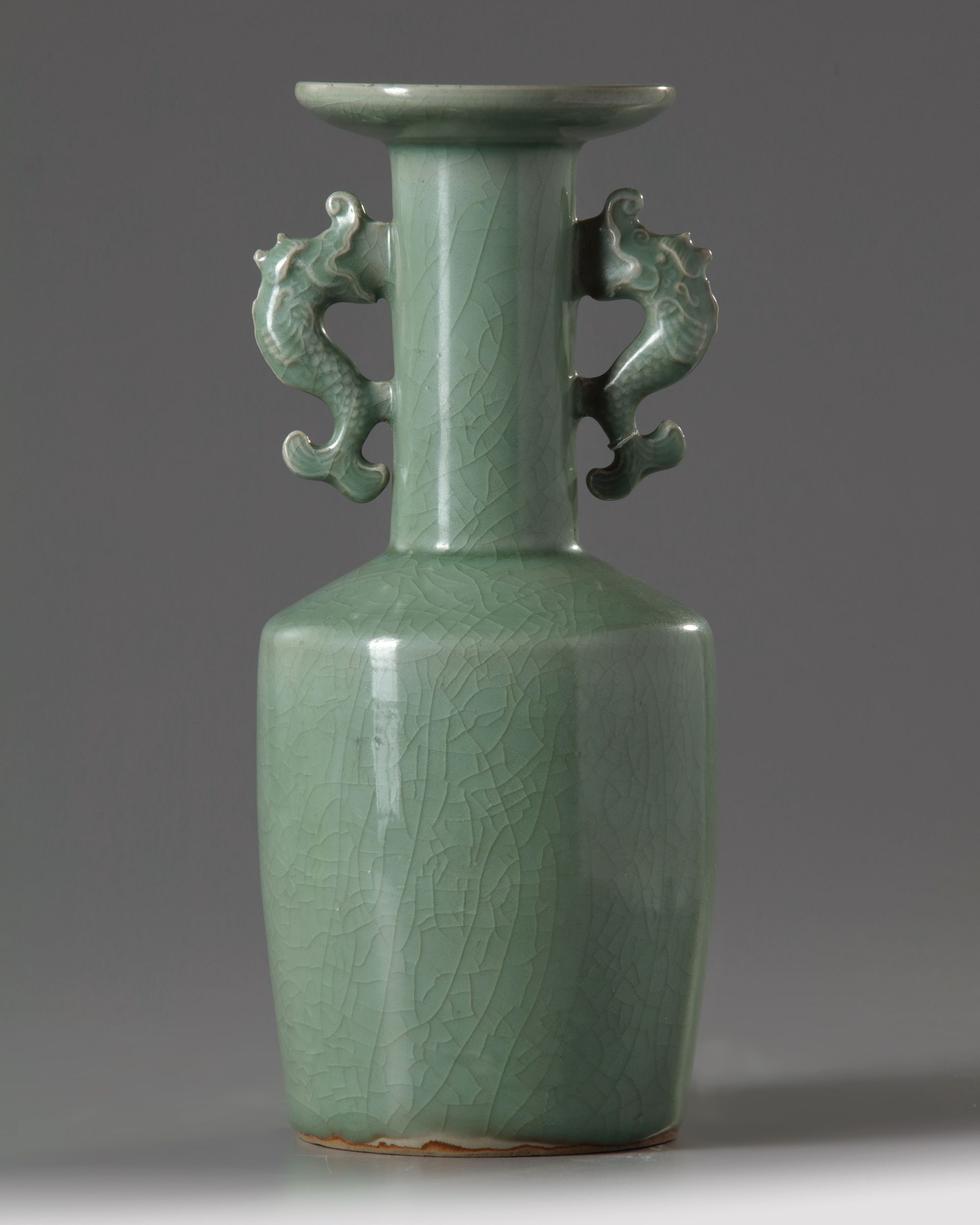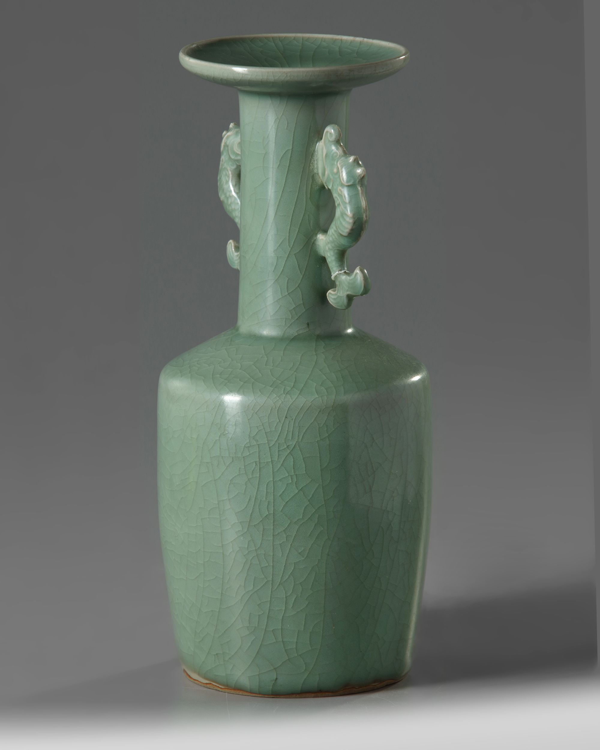 The mallet-shaped vase flanked at the neck by a pair of dragon-fish handles just under the flared mouth and galleried rim. It is covered overall with an even glaze of olive-green tone which is finely crackled.