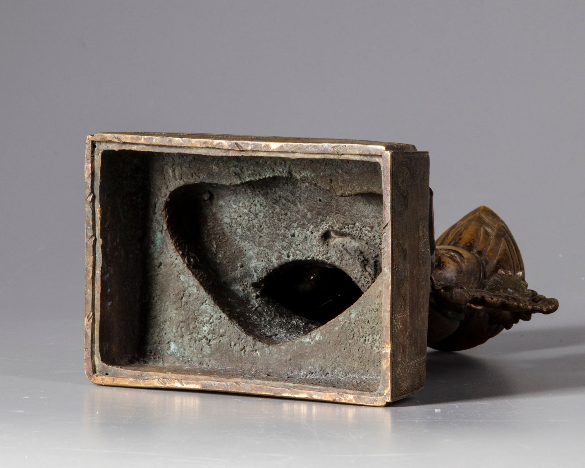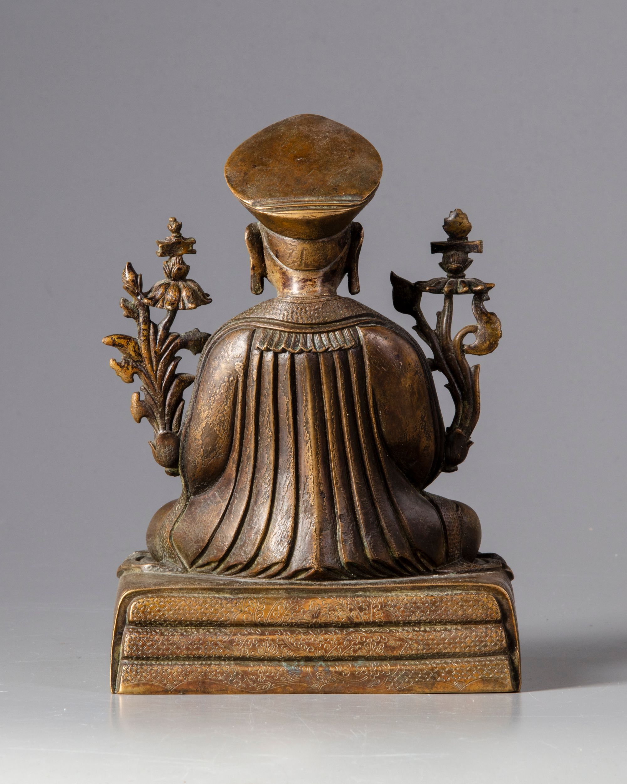The figure is seated in dhyanasana with his hands held in vitarka mudra, on a lotus incised stand, dressed in loose, flowing robes. The face is serene, with gentle smile, elongated ears, downcast eyes, flanked by two lotus stems.