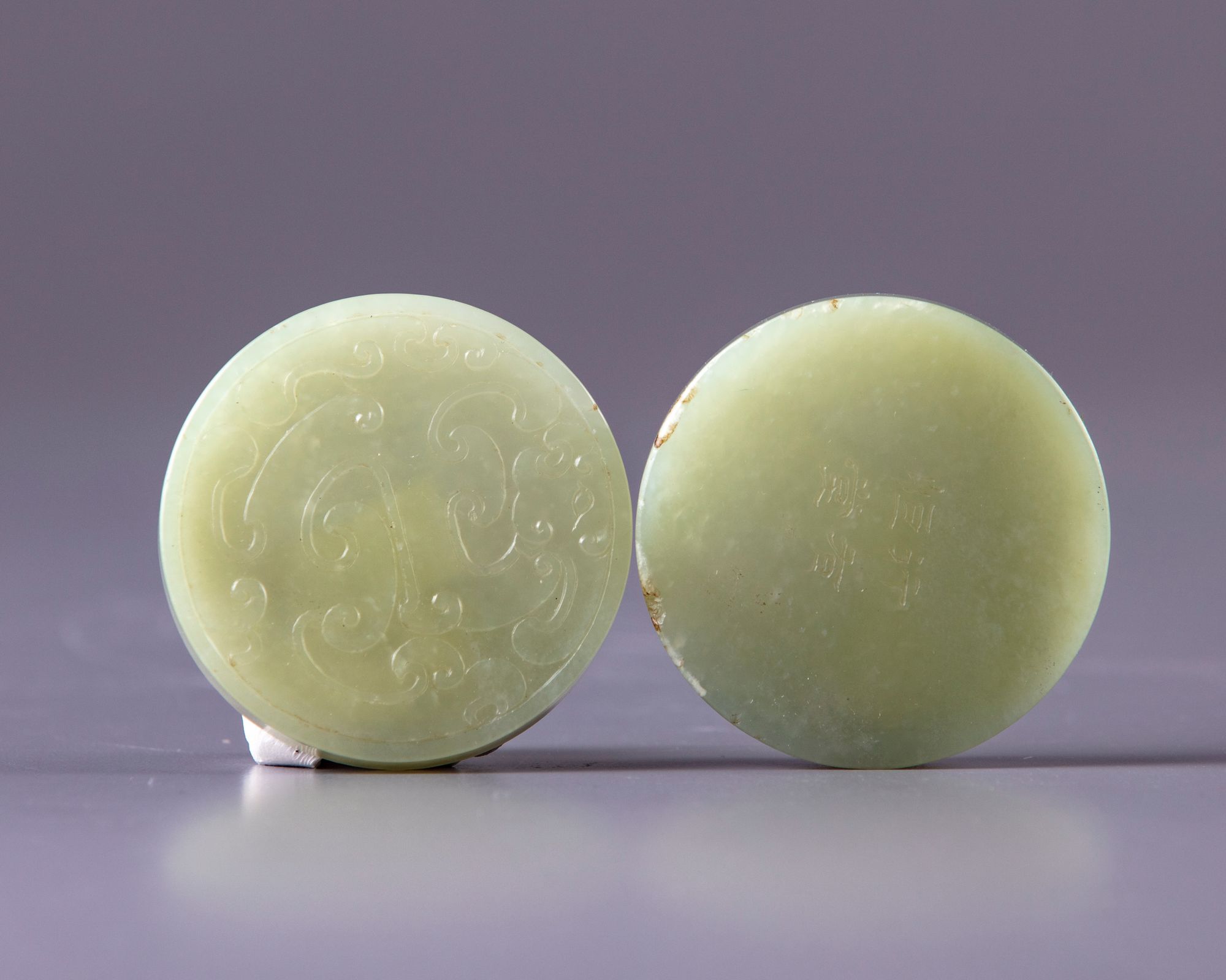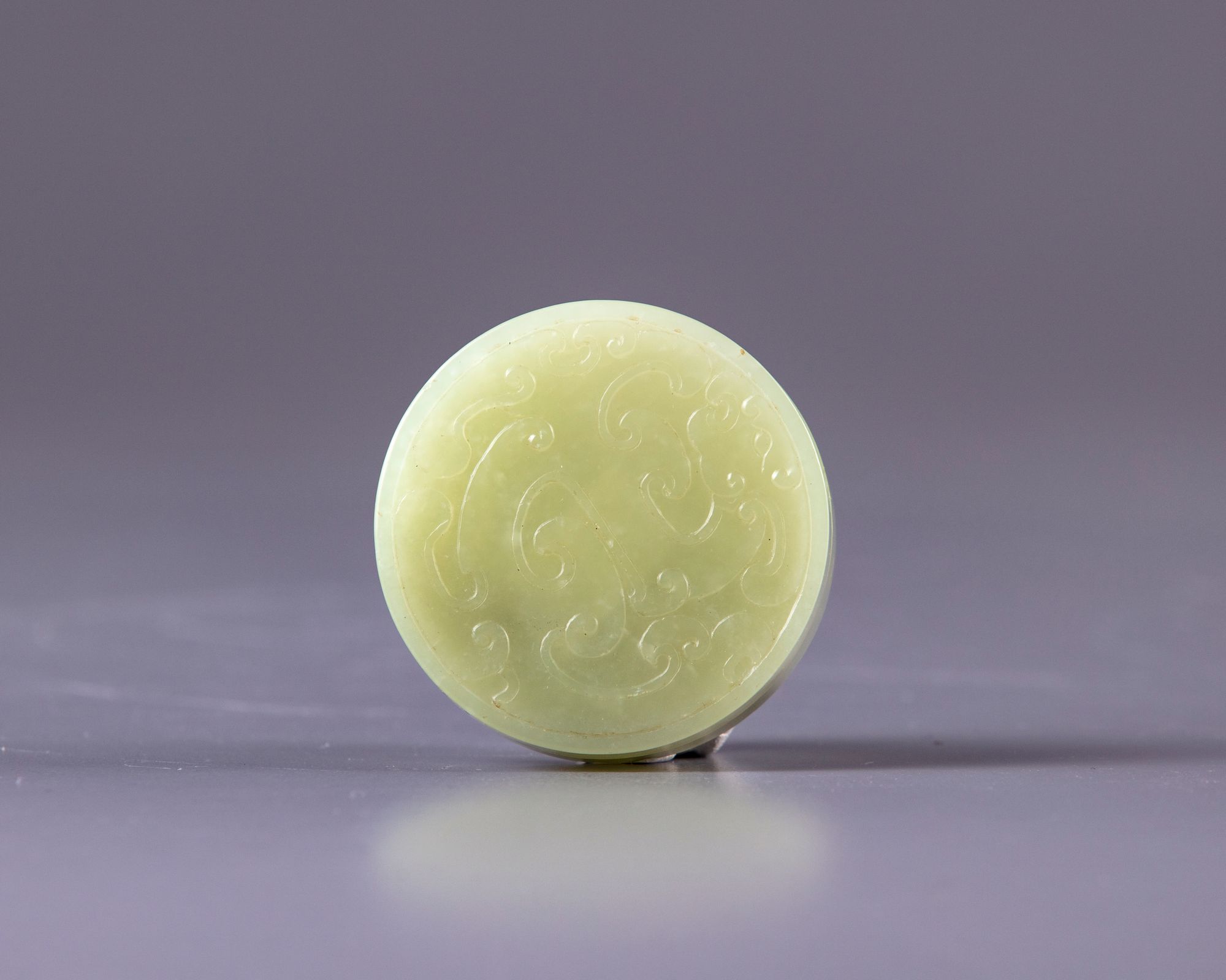 A Chinese light celadon paste-box with a cover, carved to the cover with a phoenix roundel. The bottom with a four Chinese character mark.