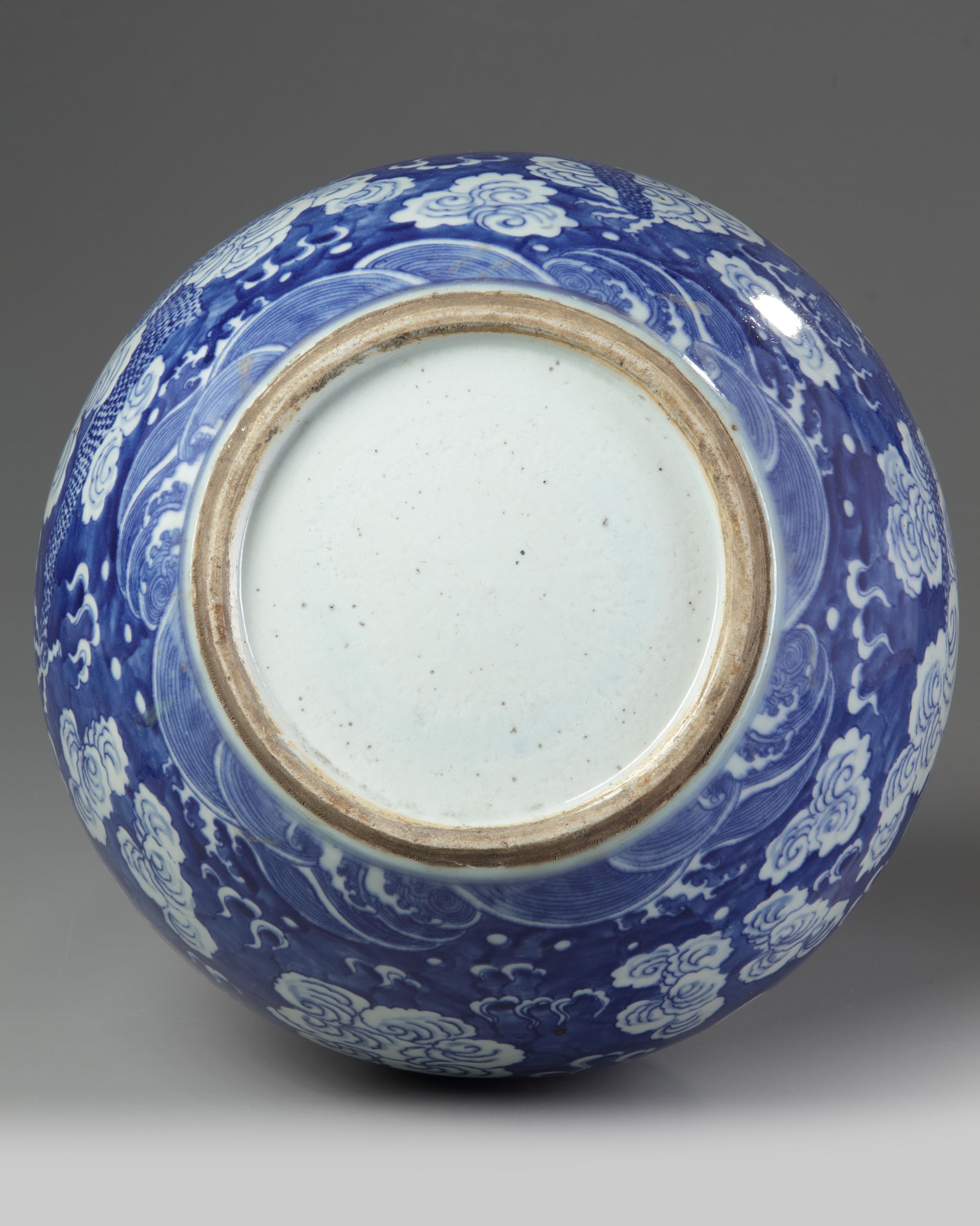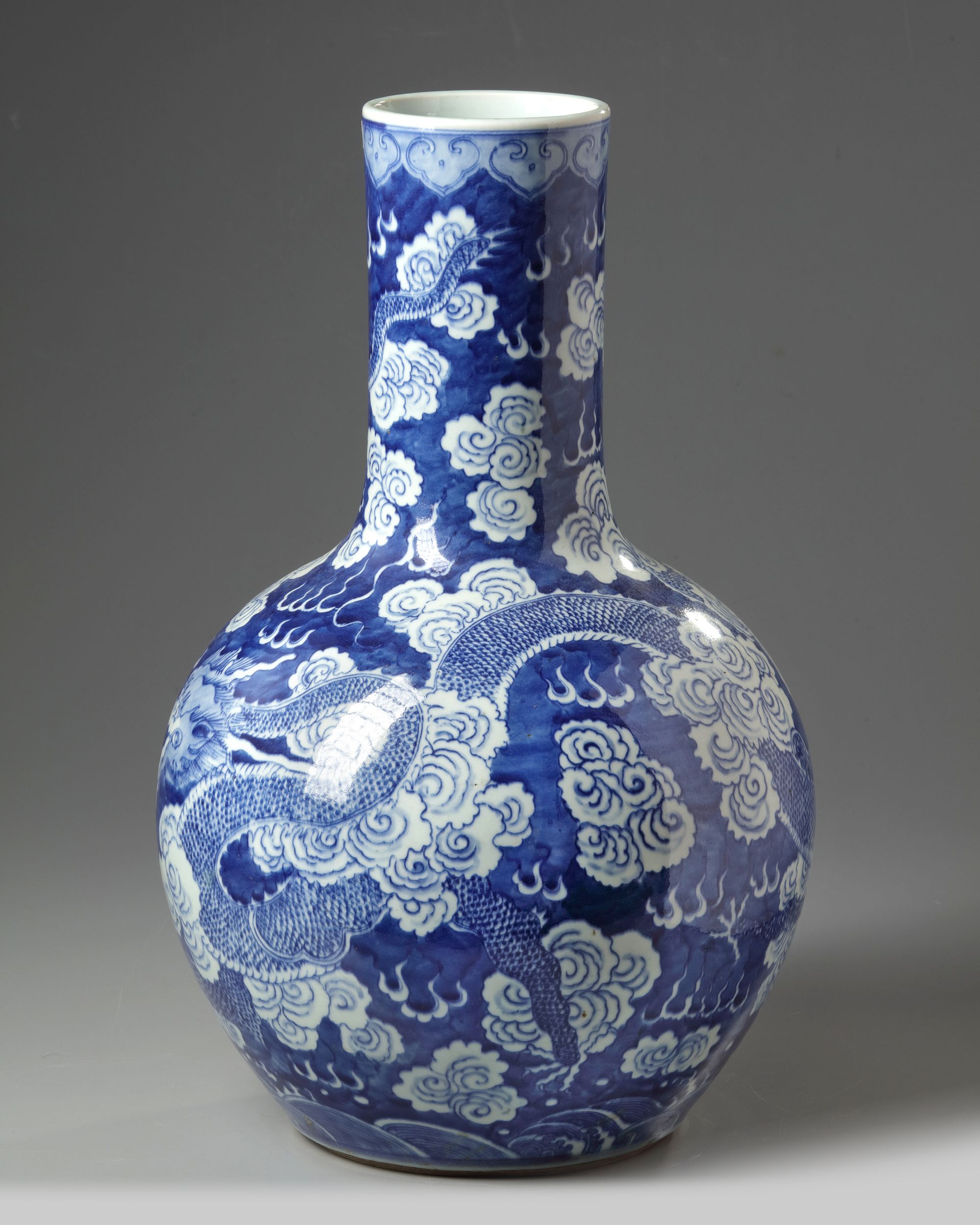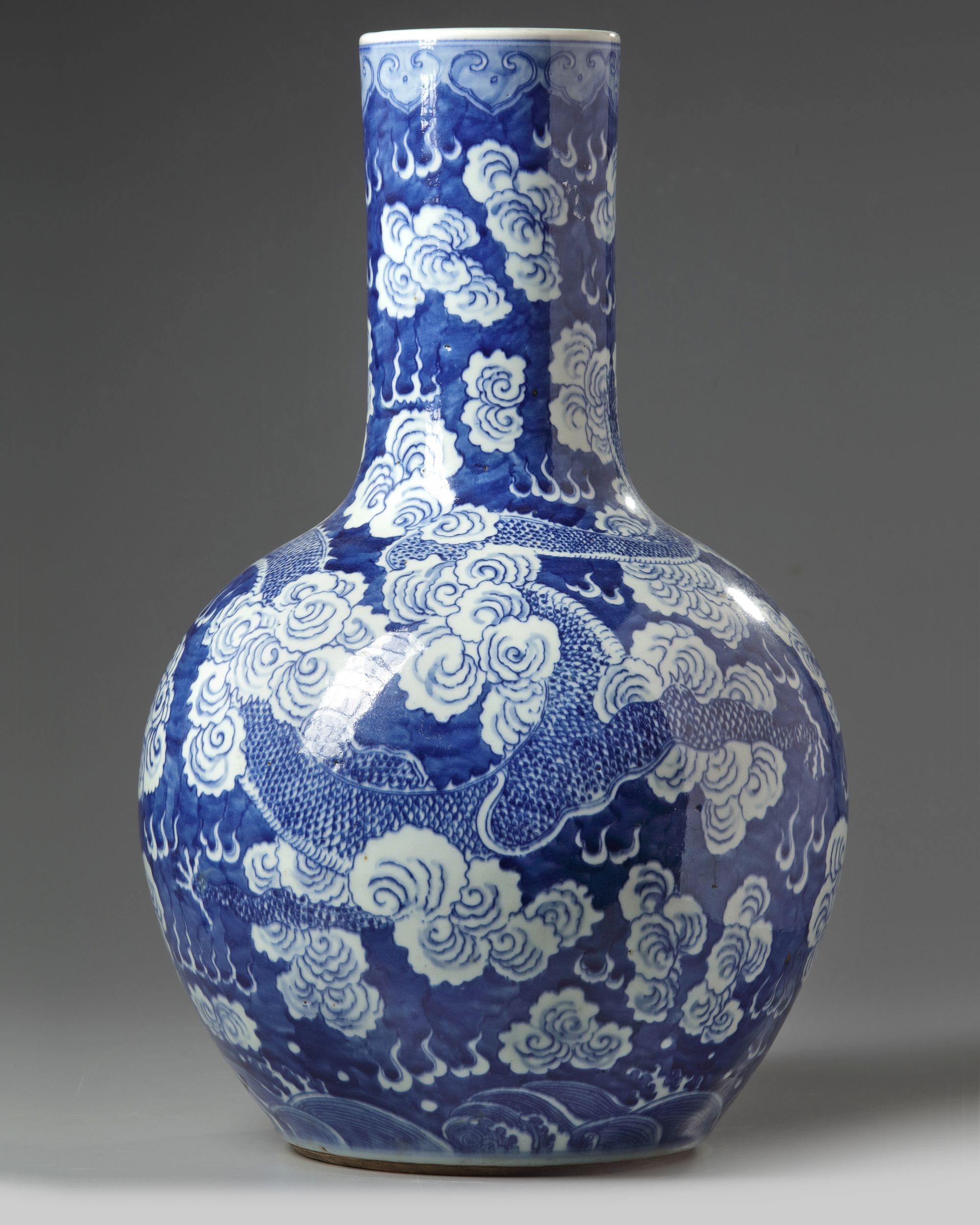 The bottle vase is decorated to the body and the neck with a dragon chasing a flaming pearl amidst clouds on a band of sea waves. The rim with a band of ruyi heads. All on a blue glazed ground.