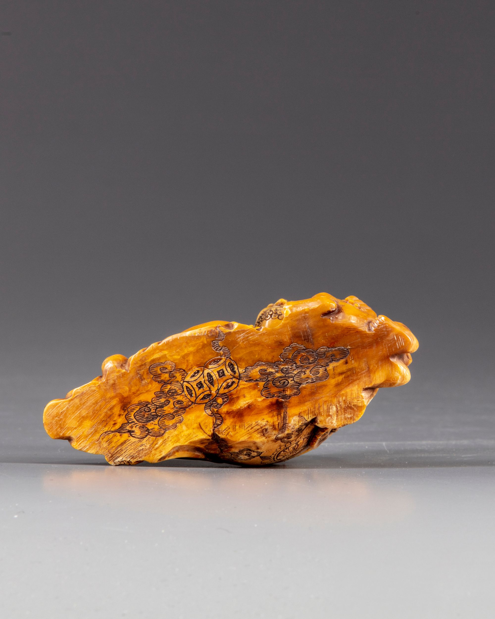 The figure is carved with a serene expression on his face, and wearing long monks robes decorated with lotus heads and stone inlays. He is seated and holding a sceptre in his hands while the other hand on a small Fu lion.