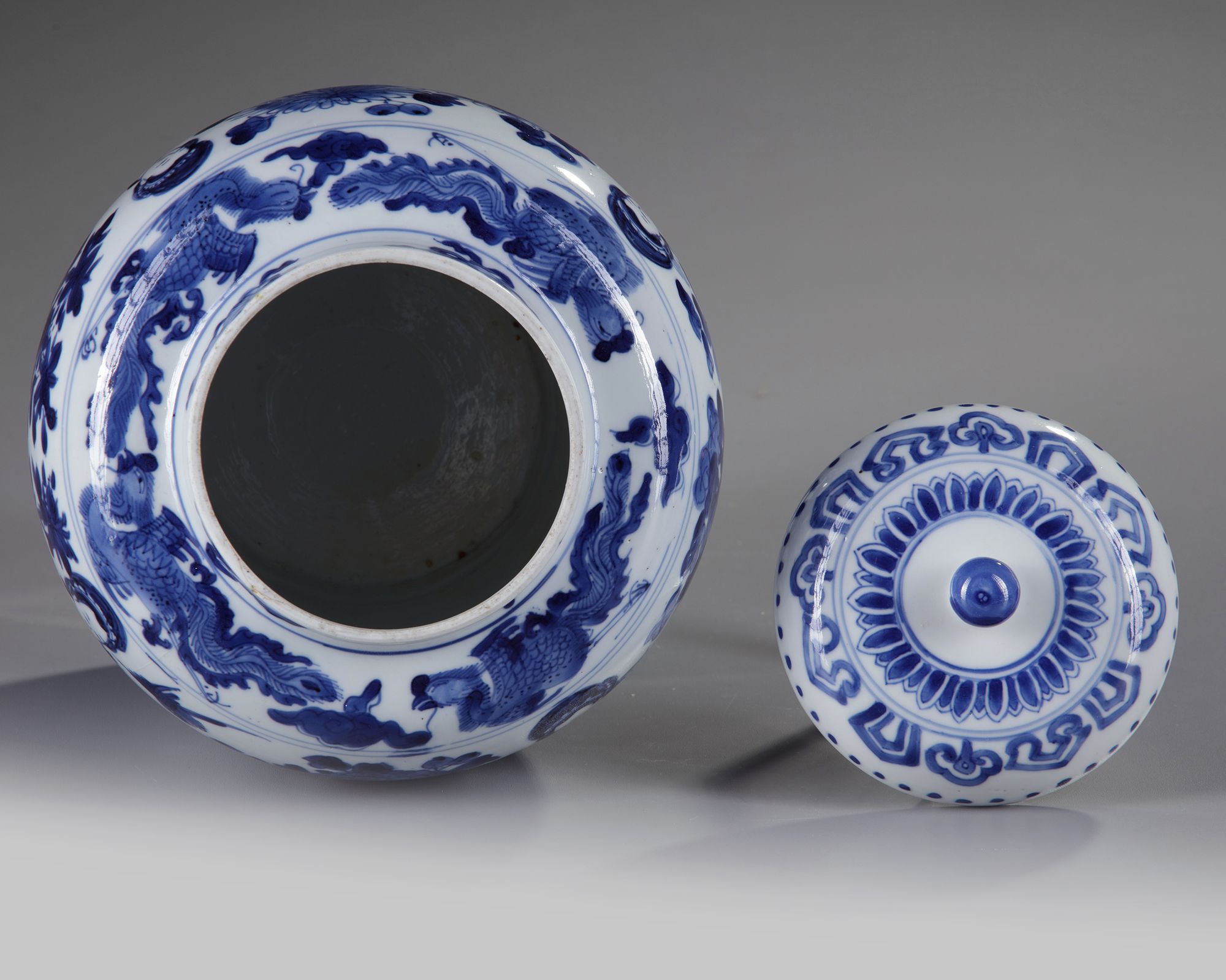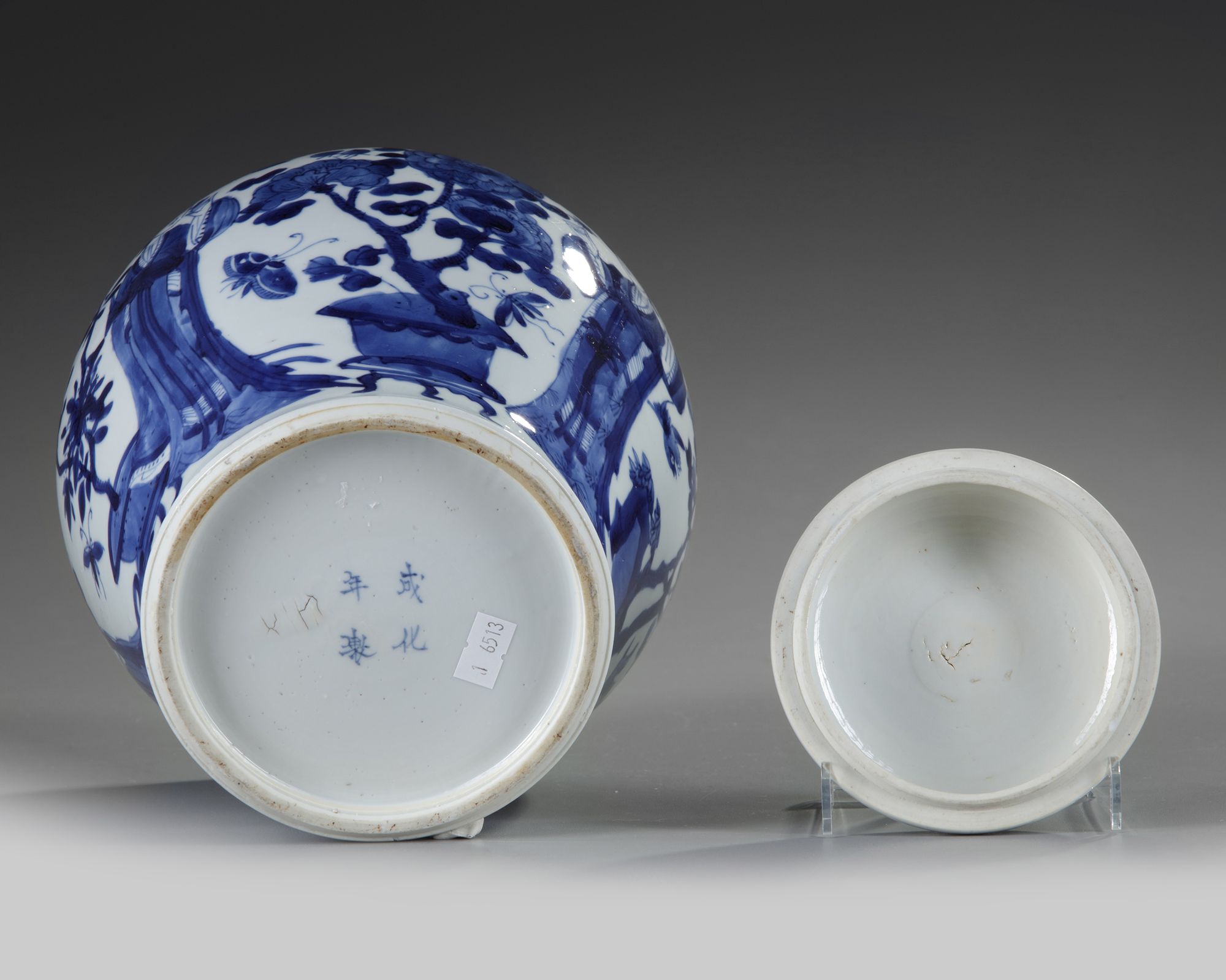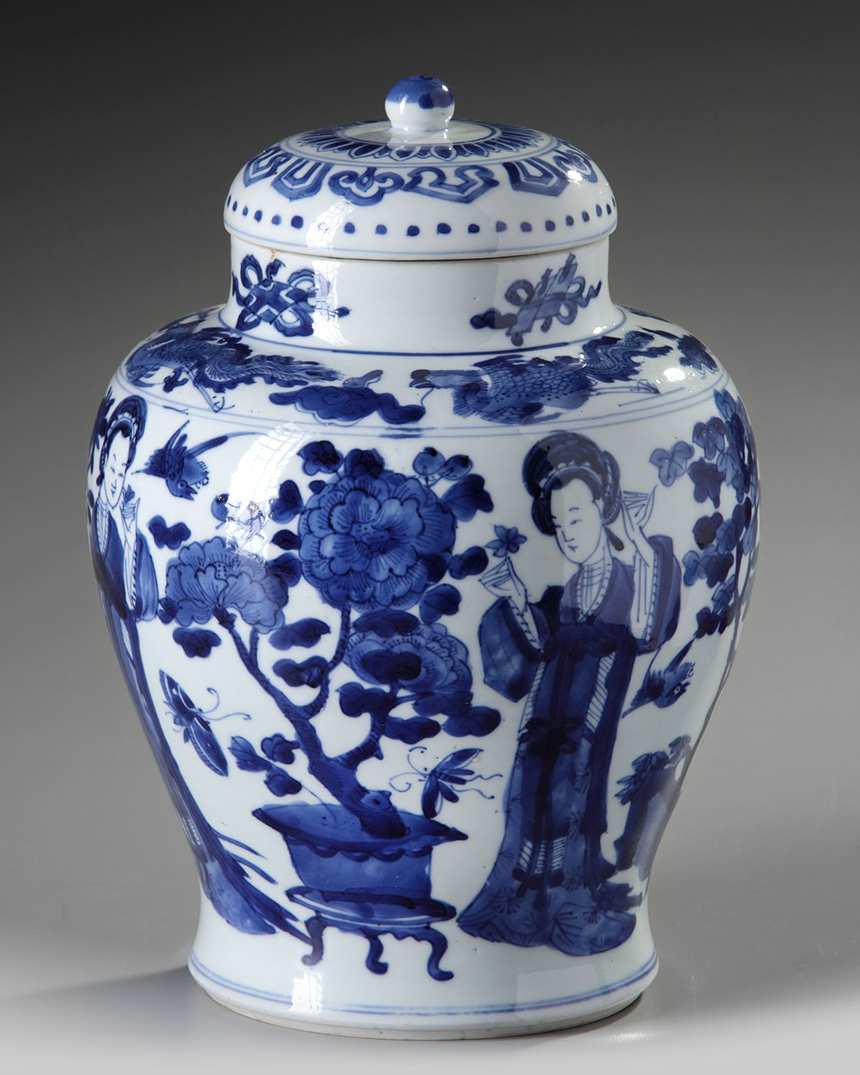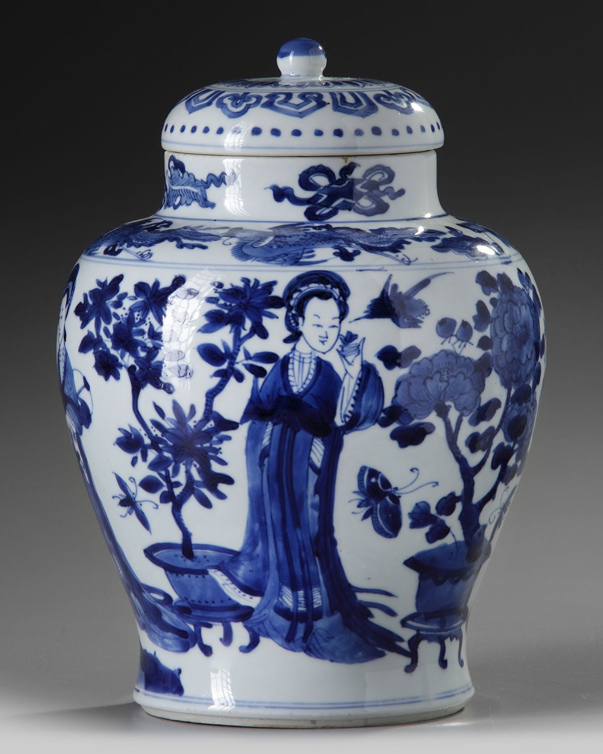 The jar is decorated to the exterior with elegant ladies holding osmathus branches amongst flowers in jardinieres. The shoulder is decorated with phoenix in flight, and the neck is decorated with beribonned precious objects. The base bears an apocryphal Chenghua mark. The domed cover is surmounted by a ball finial. Overall height: 22.5 cm.