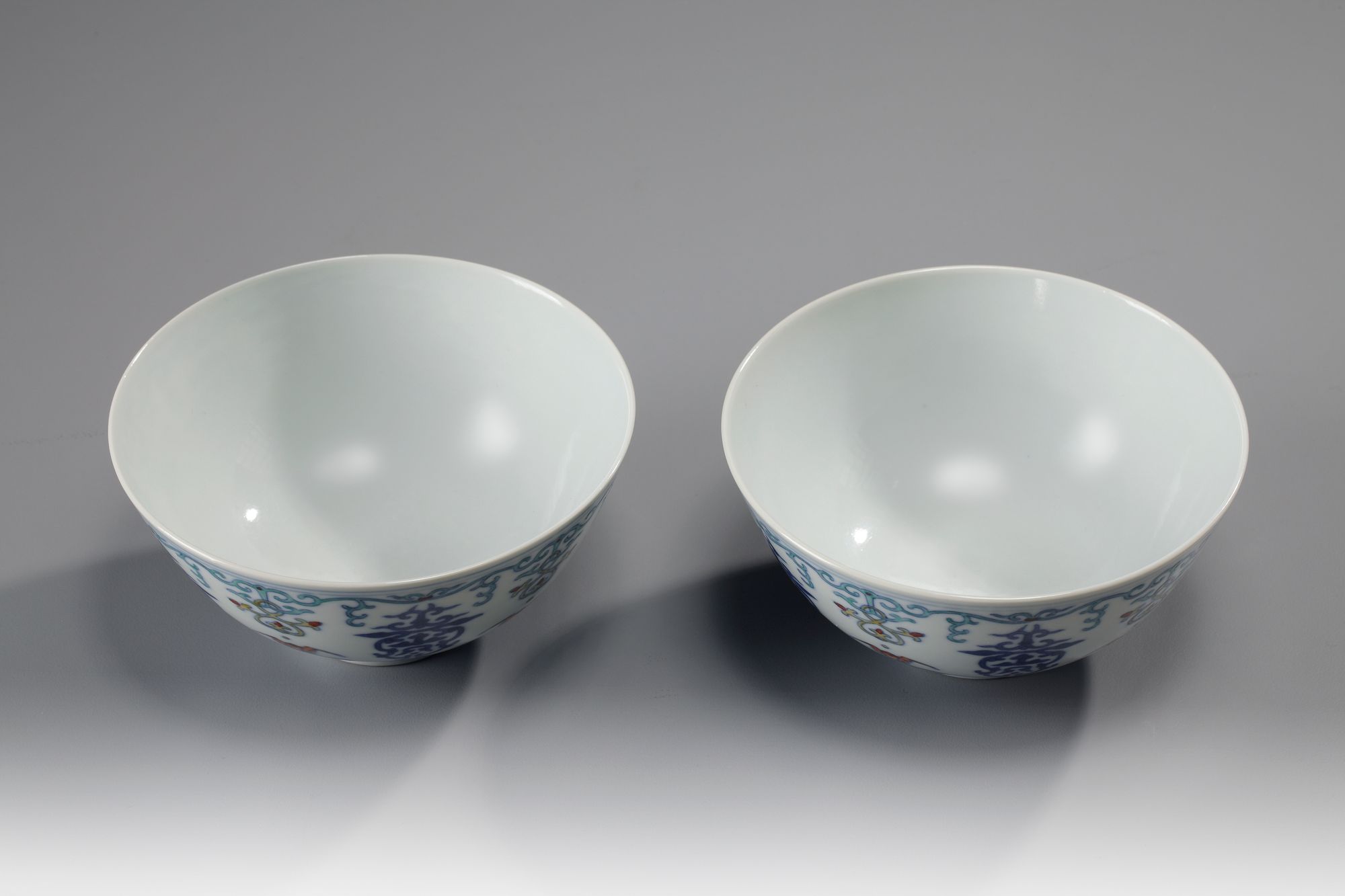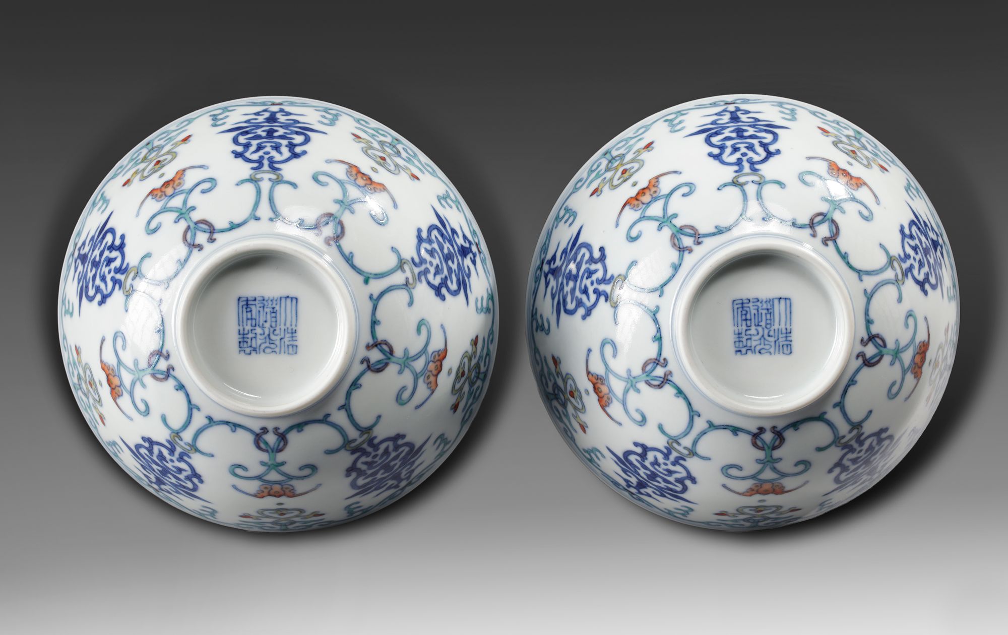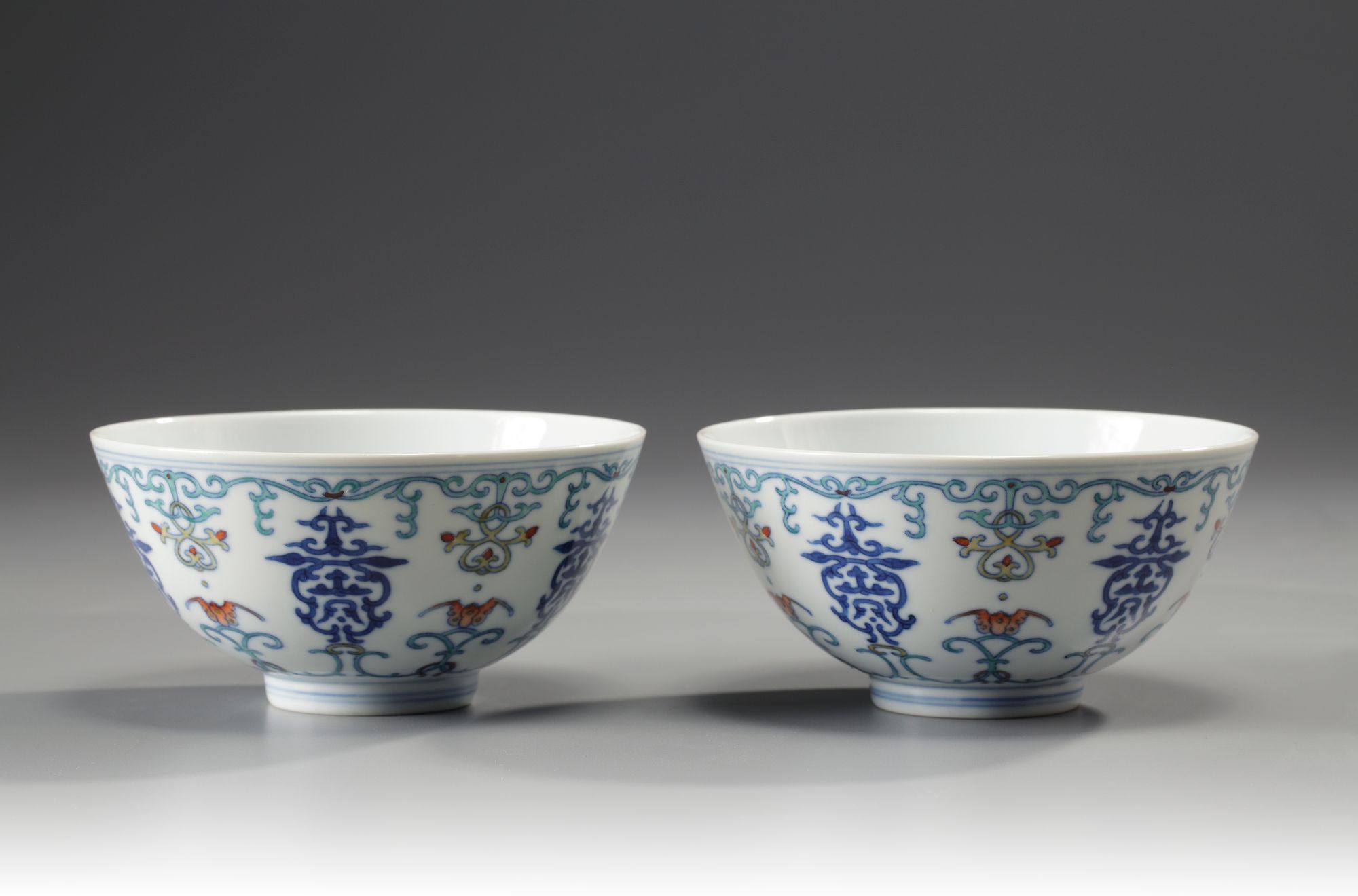 The bowls potted with steep sides, and decorated on the exterior with a continuous design of bats and stylized shou characters between decorative bands of interlocked leafy scroll. Daoguang six-character seal mark in underglaze blue and of the period (1821-1850). A similar single bowl from the Lai Family Collection sold at Christies, 17 September 2015, New York, Rockefeller Plaza.