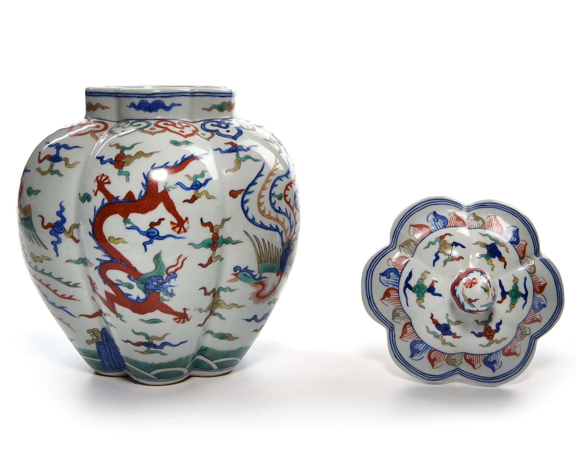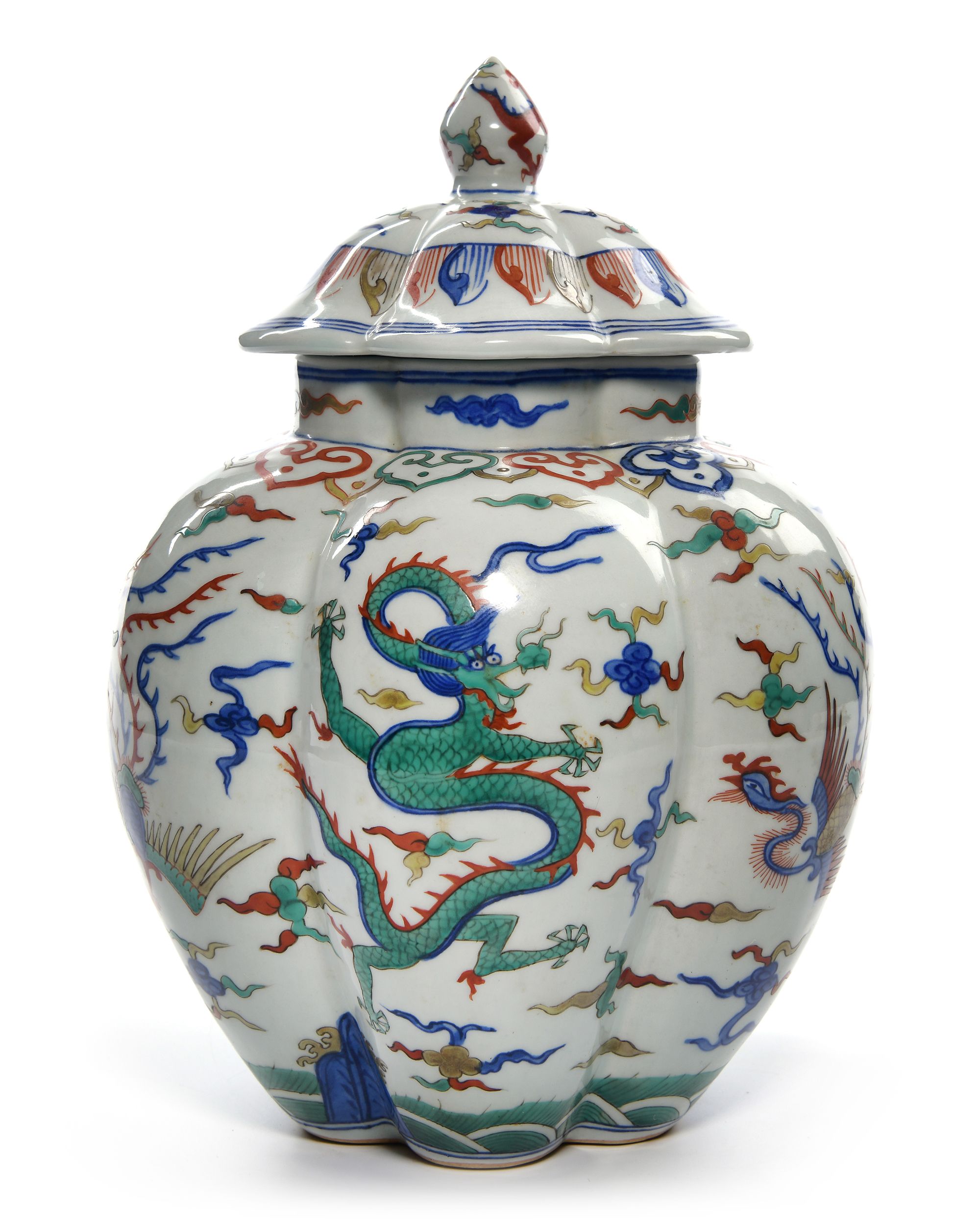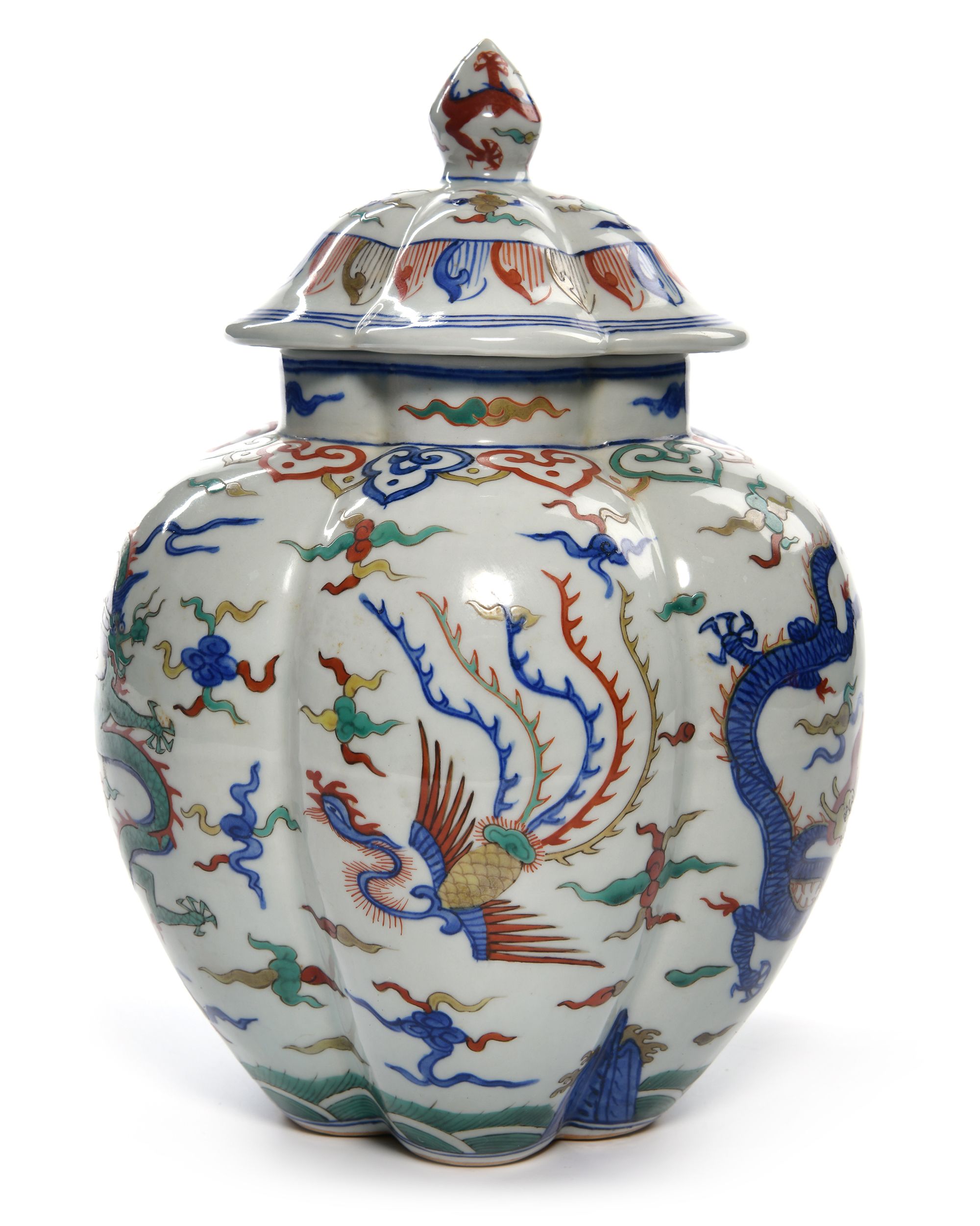 A Chinese porcelain six-lobbed jar decorated with dragons and phoenix chasing flaming pearls amongst clouds above seawaves and below a band of ryi heads. The bottom with a Chinese Wanli six character mark.