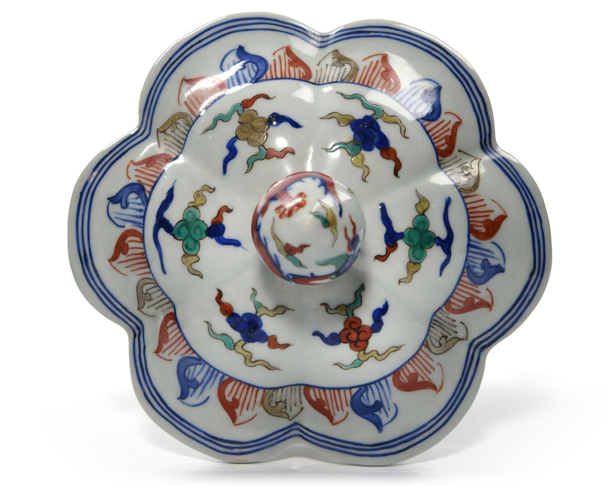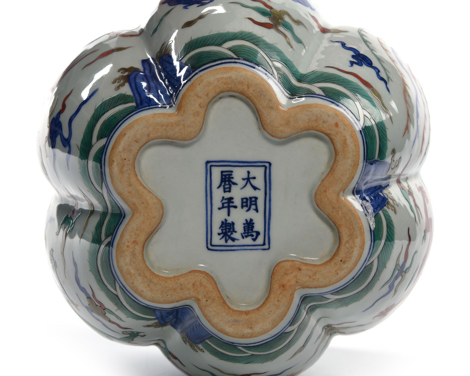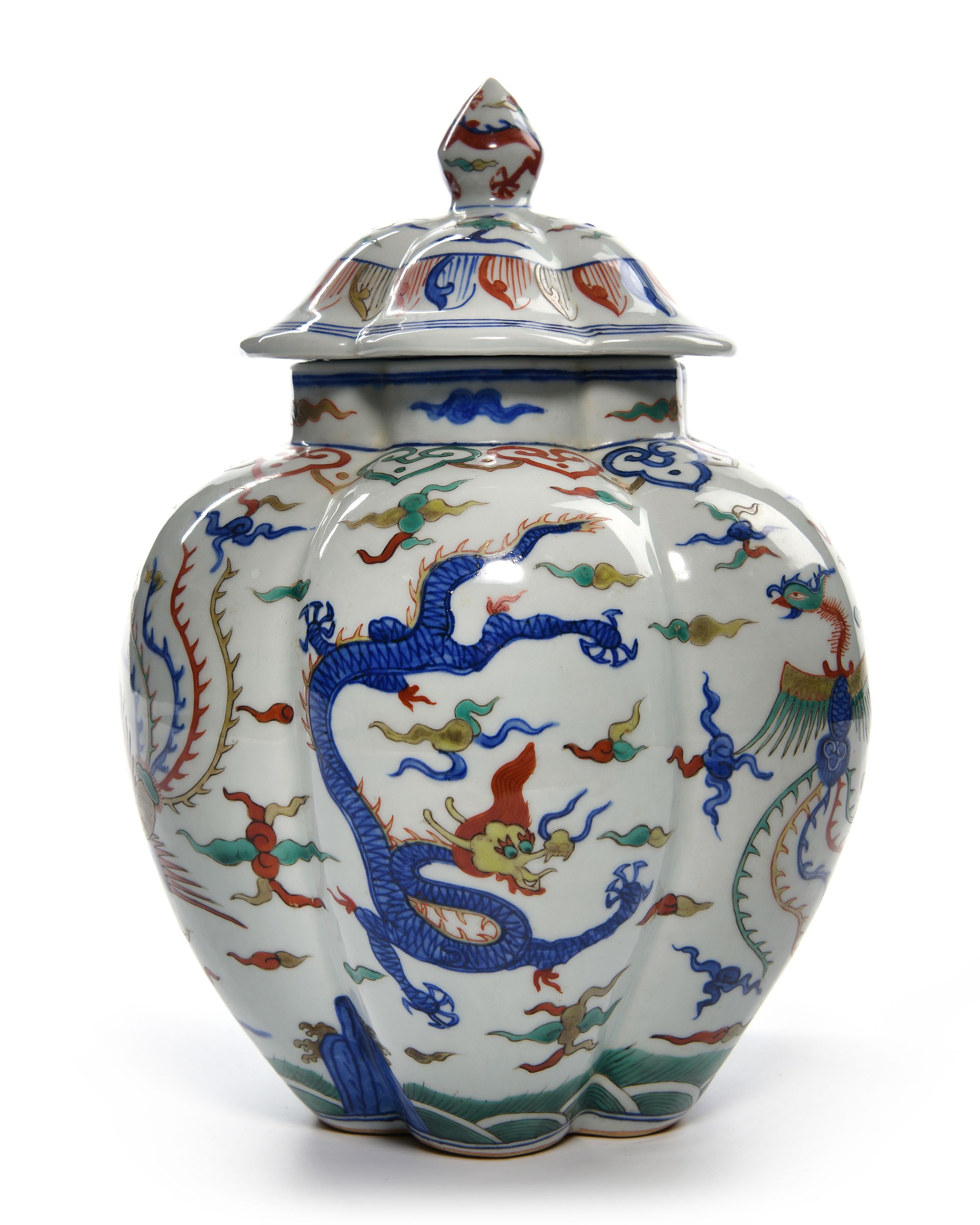 A Chinese porcelain six-lobbed jar decorated with dragons and phoenix chasing flaming pearls amongst clouds above seawaves and below a band of ryi heads. The bottom with a Chinese Wanli six character mark.
