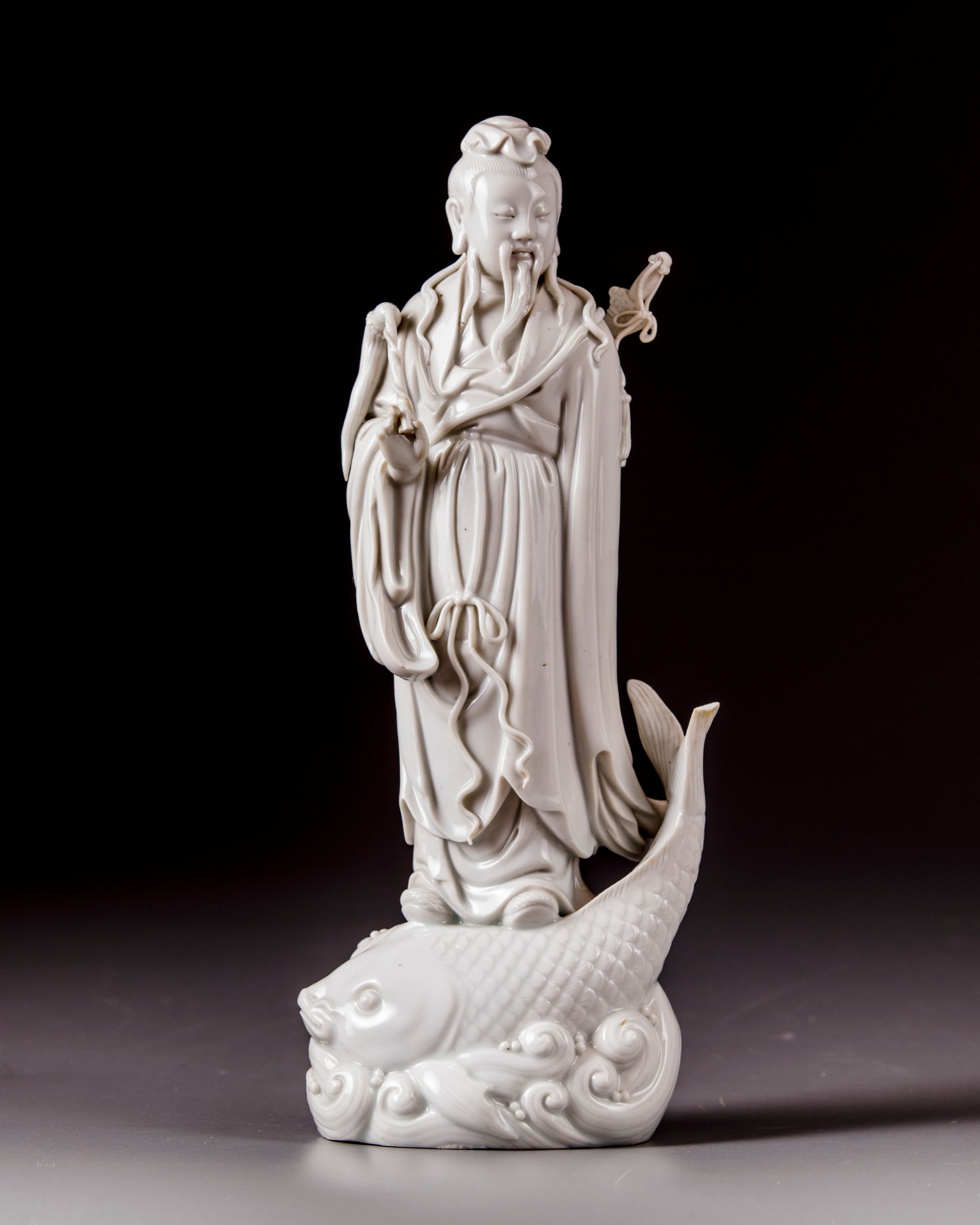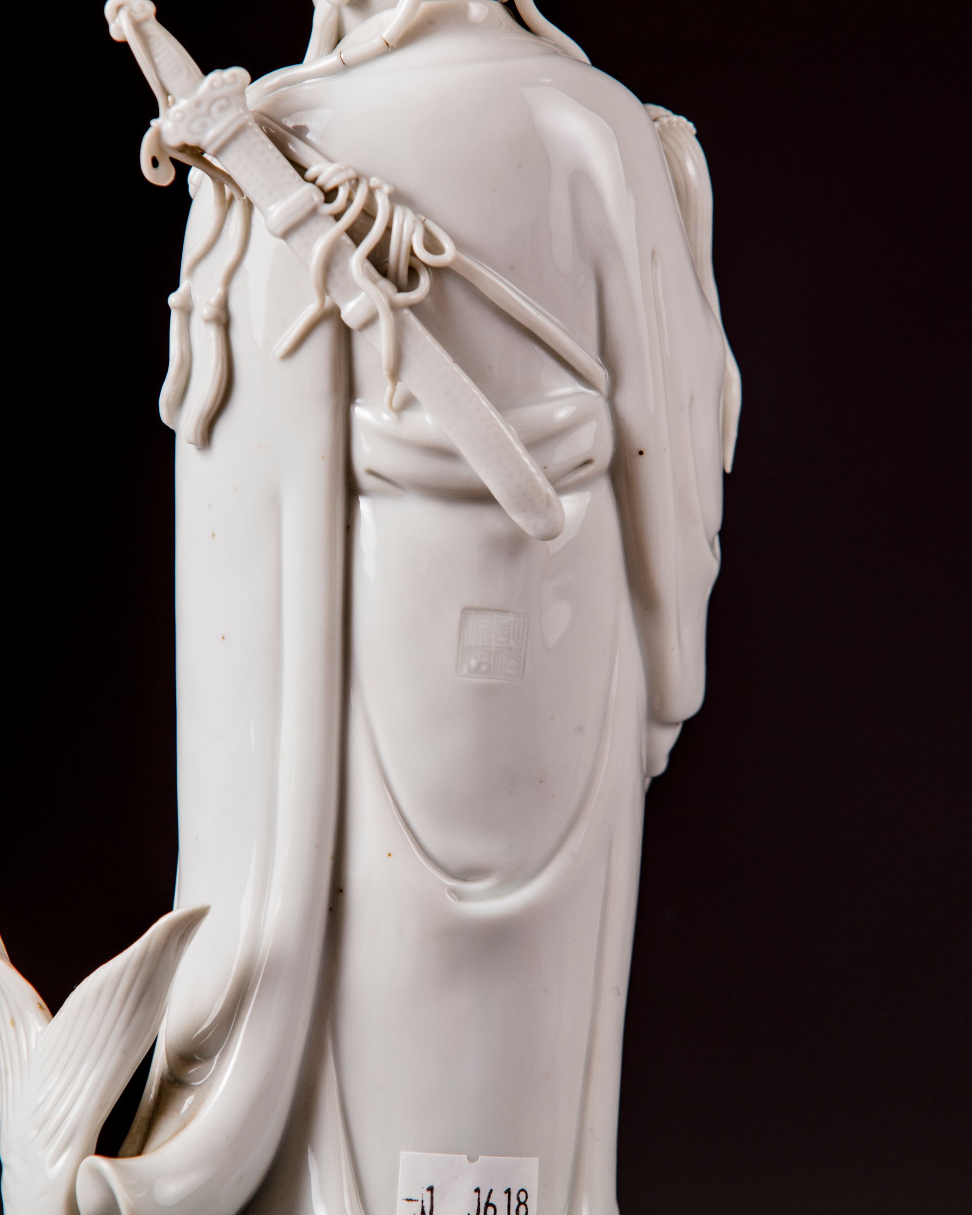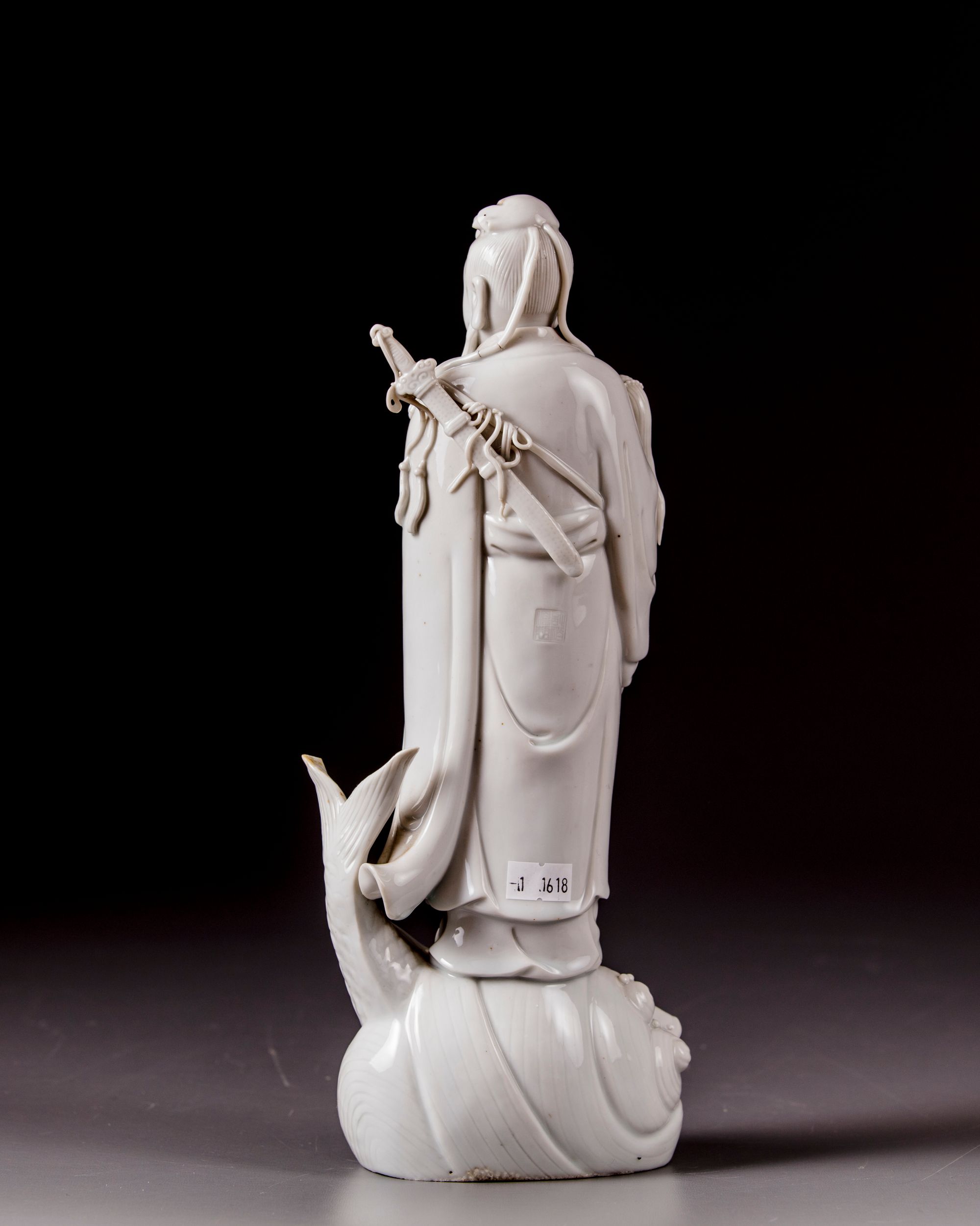 A blanc de chine figure wearing voluminous robes and standing on a fish shaped stand, wearing a sword on his back while holding a stick in his right hand.