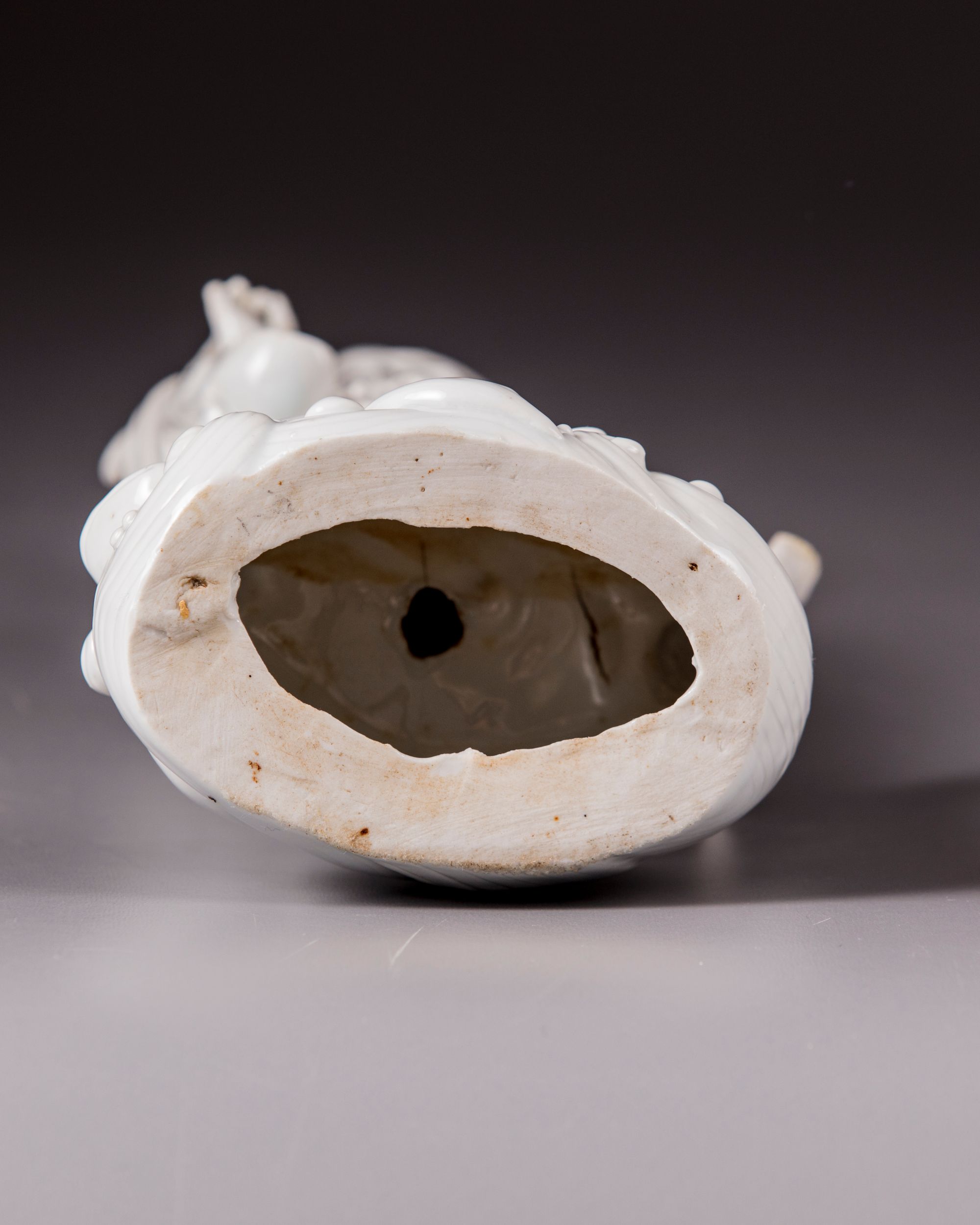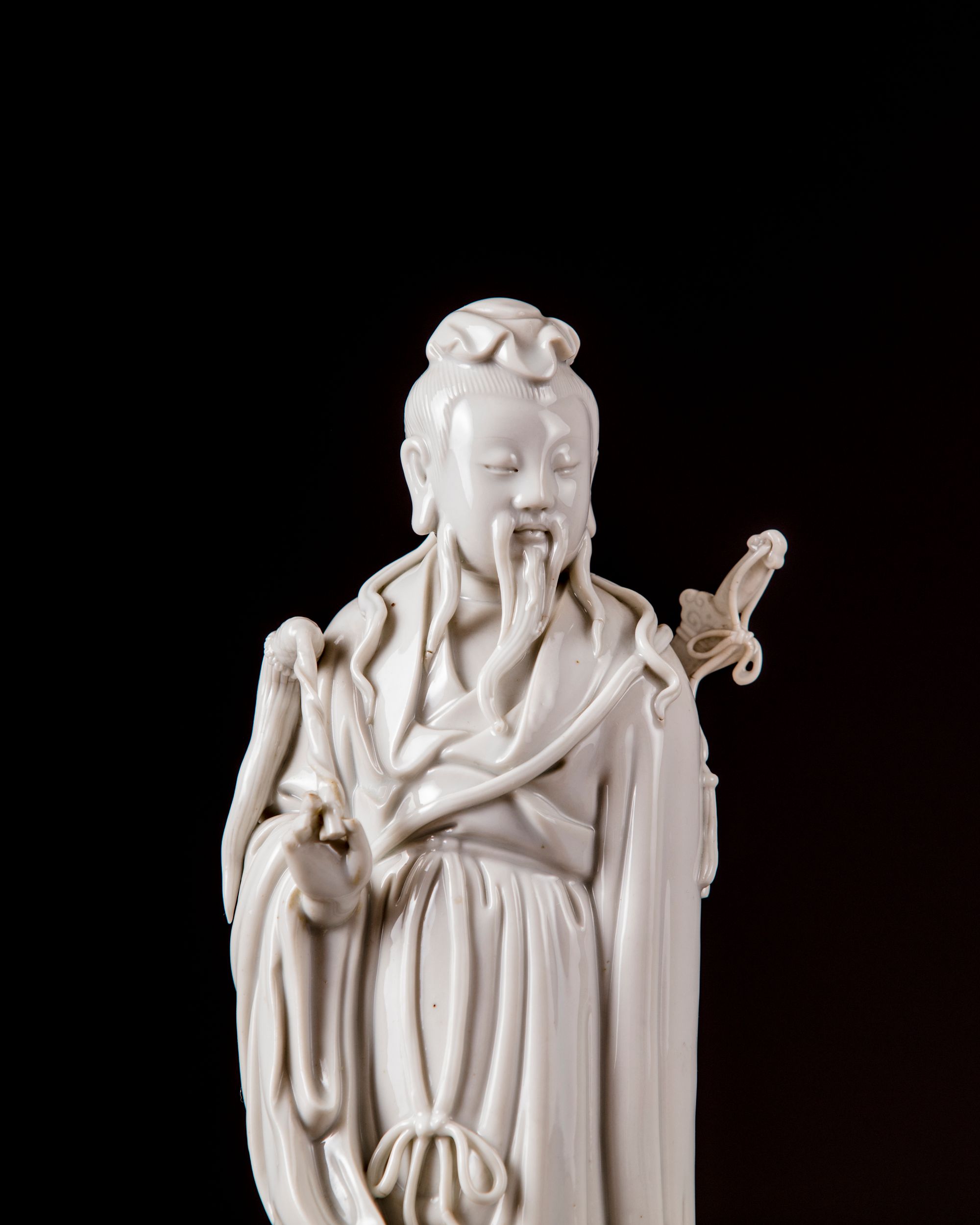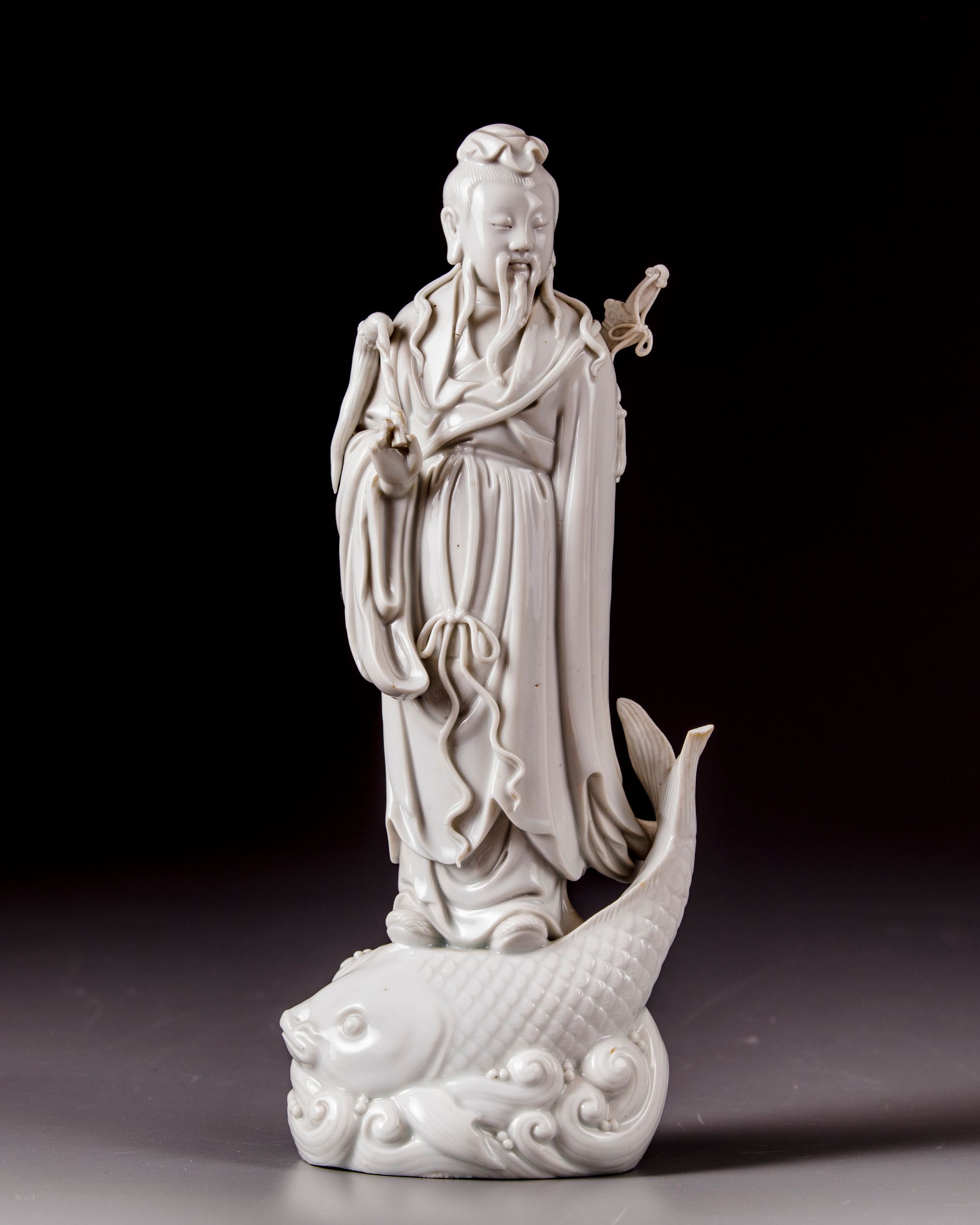A blanc de chine figure wearing voluminous robes and standing on a fish shaped stand, wearing a sword on his back while holding a stick in his right hand.