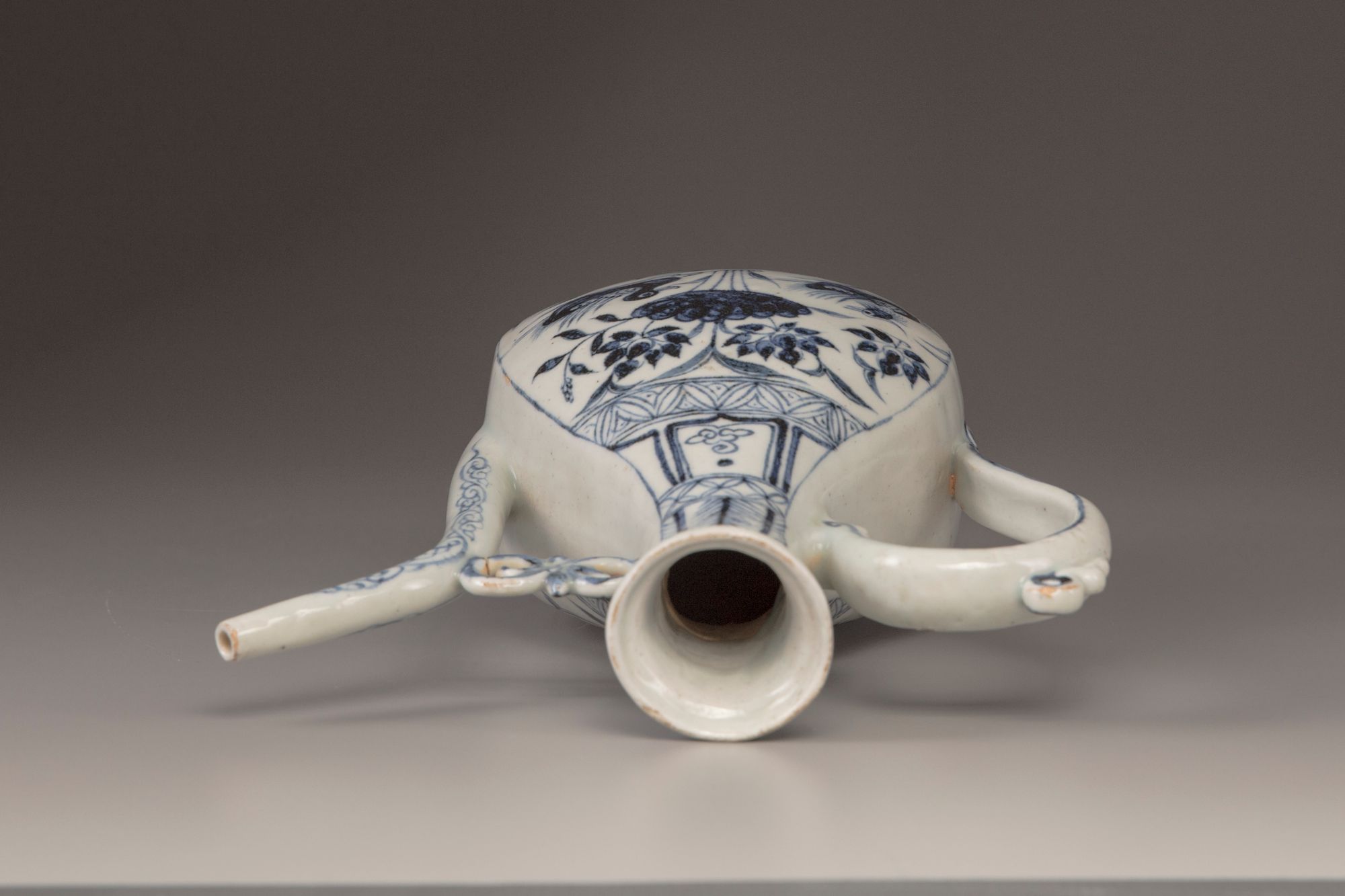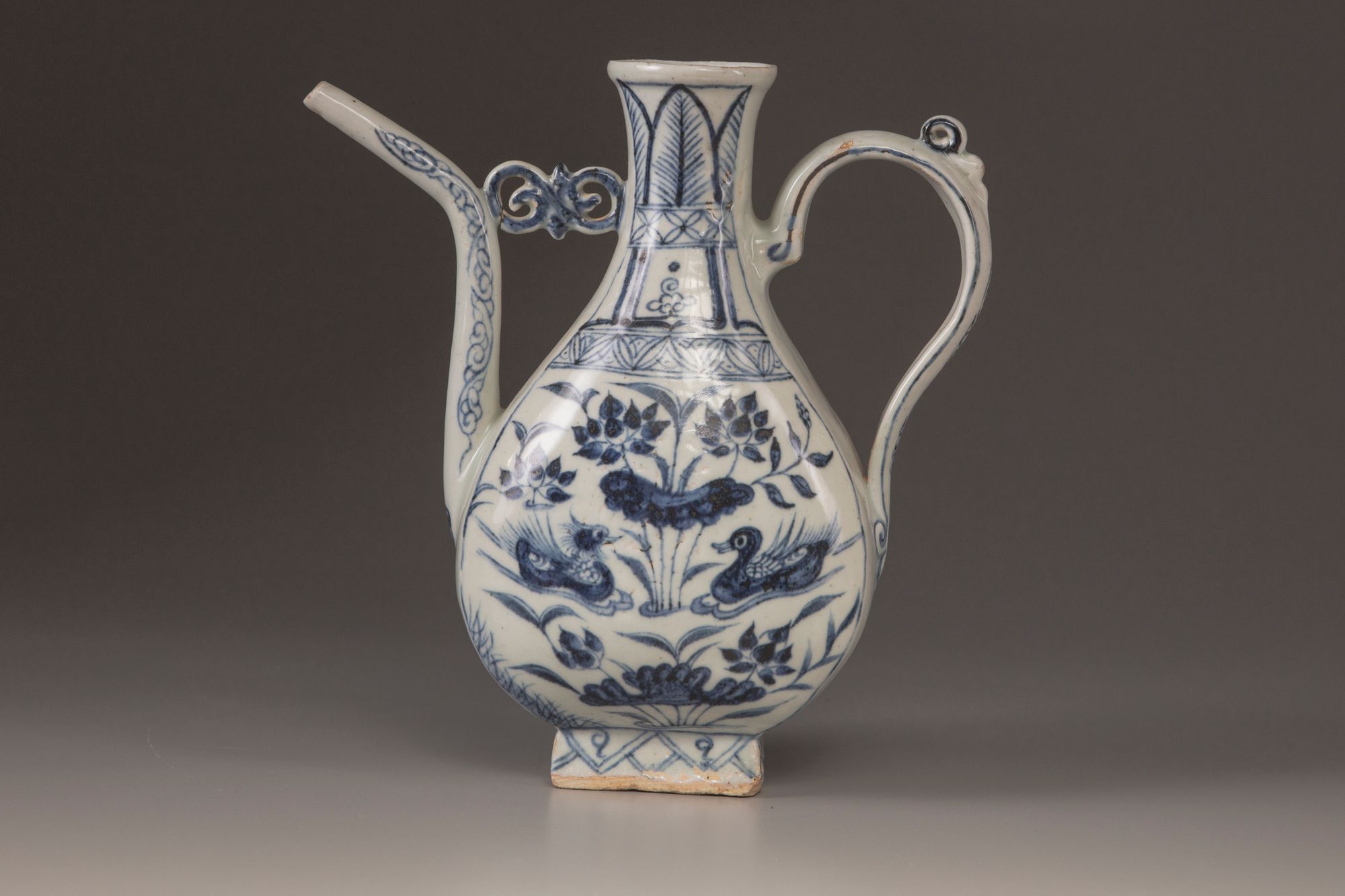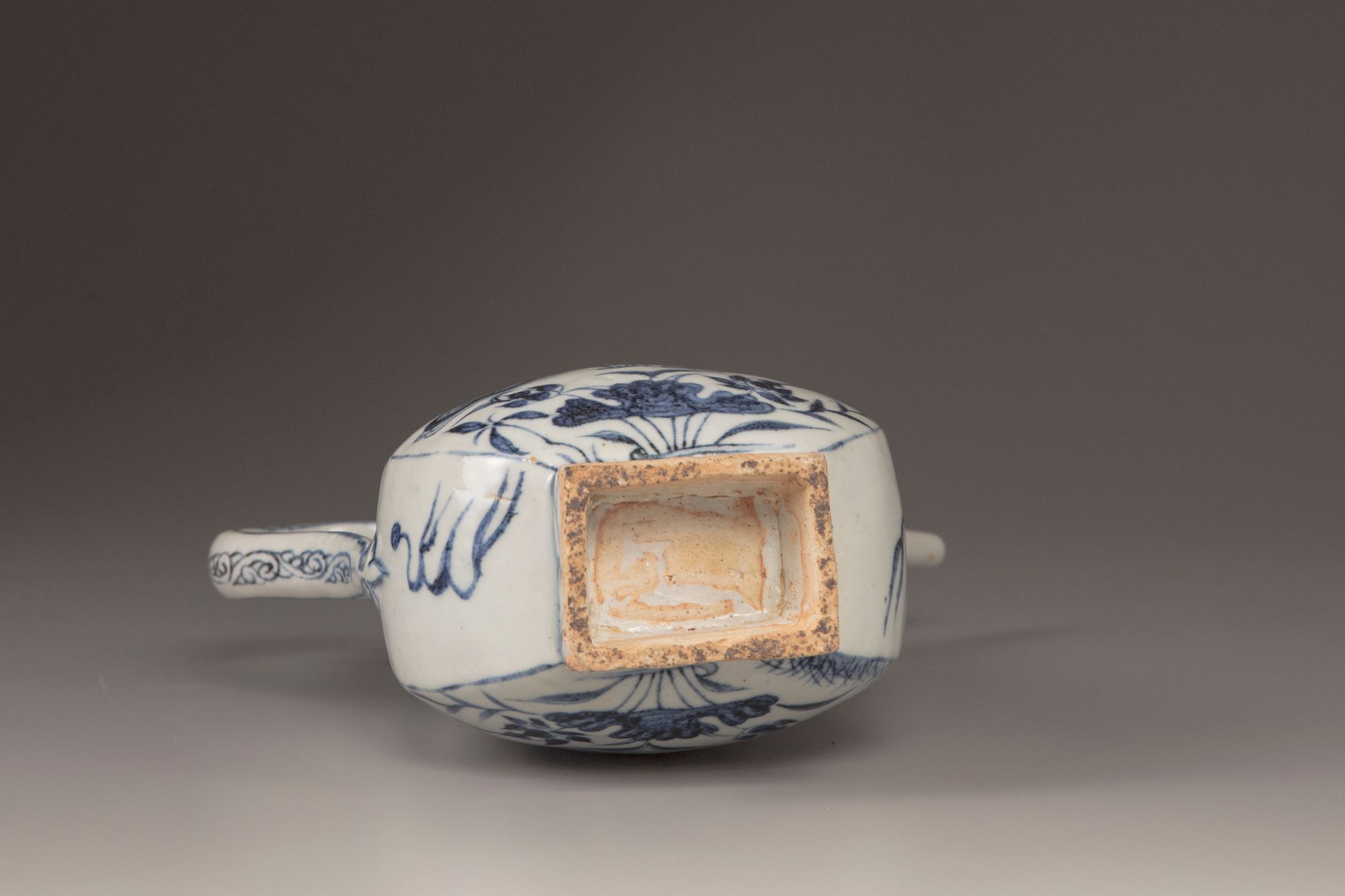 Decorated in underglaze blue with a pond scene with two ducks and lotus.
