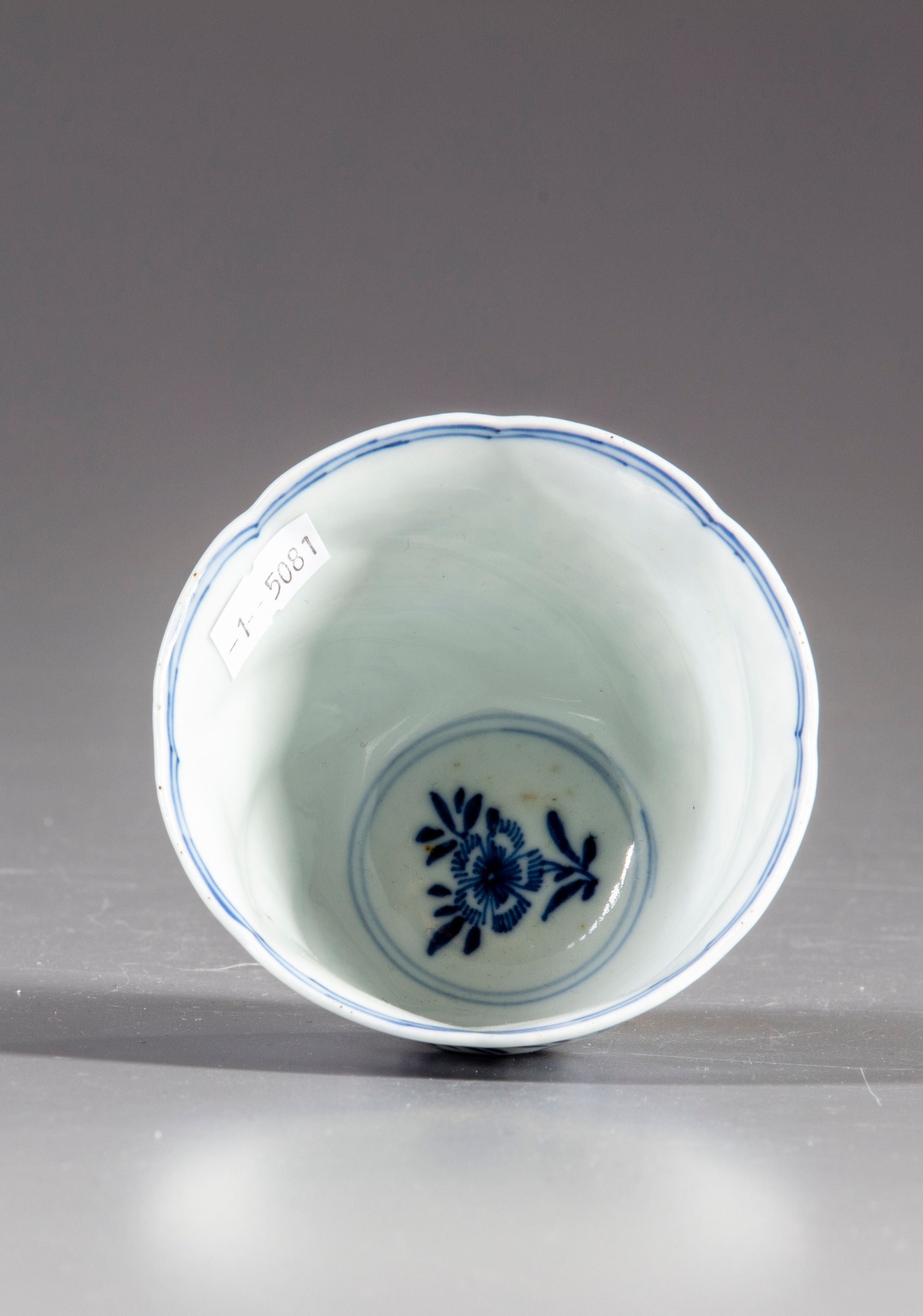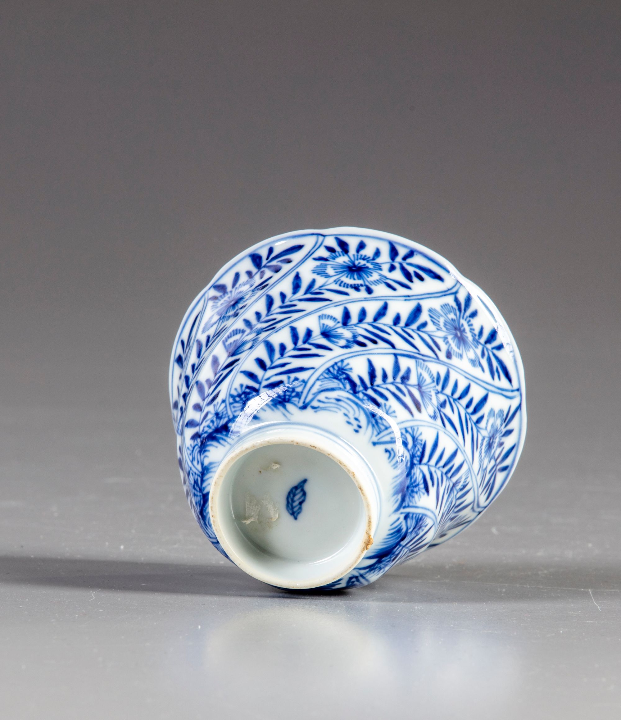 A Chinese blue and white cup decorated with panels enclosing a flower with a artemisia leaf to the bottom