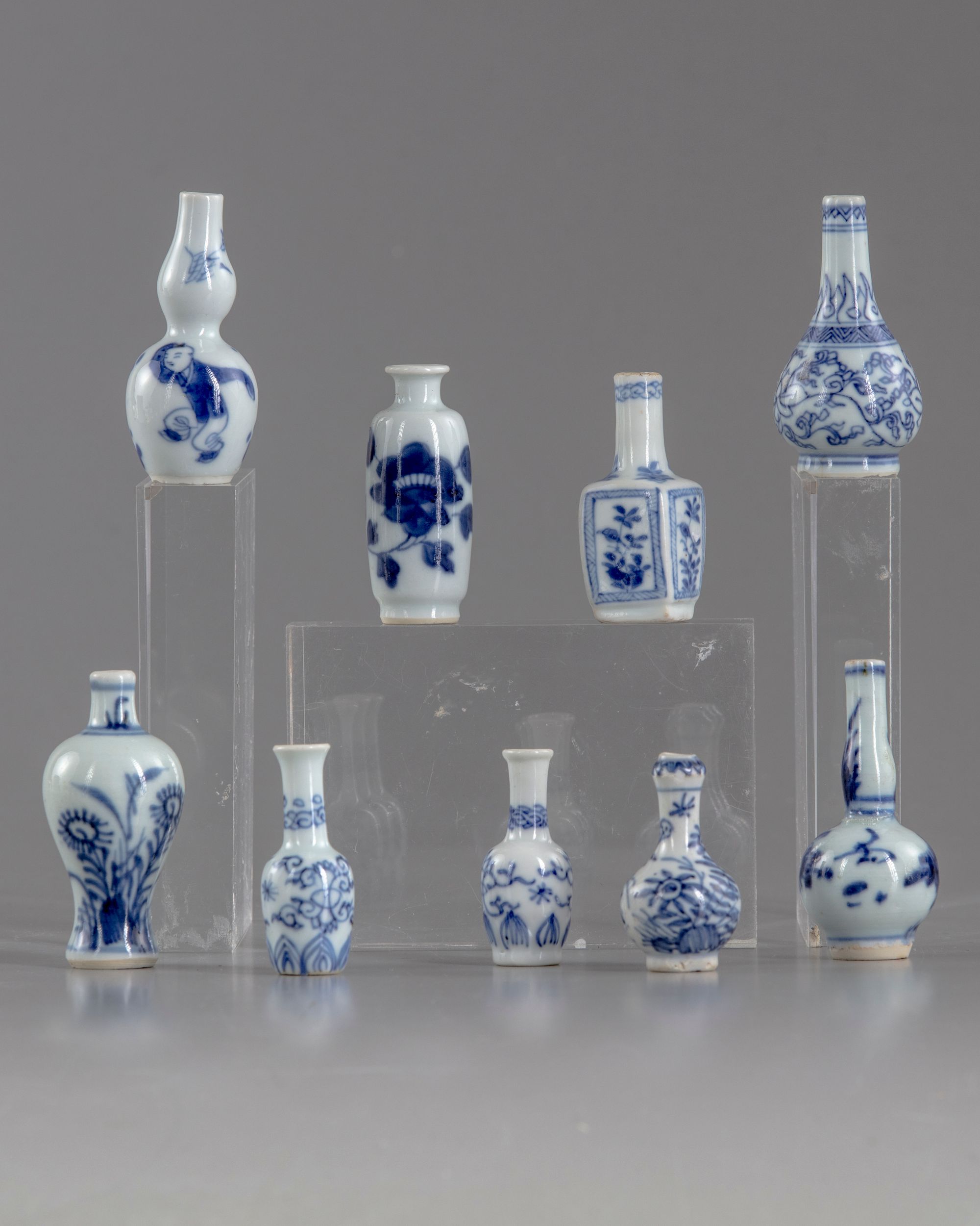 Nine miniature porcelain vases, decorated with flower, figures and flowering branches, ranging from 4.7 cm to 6.7 cm.