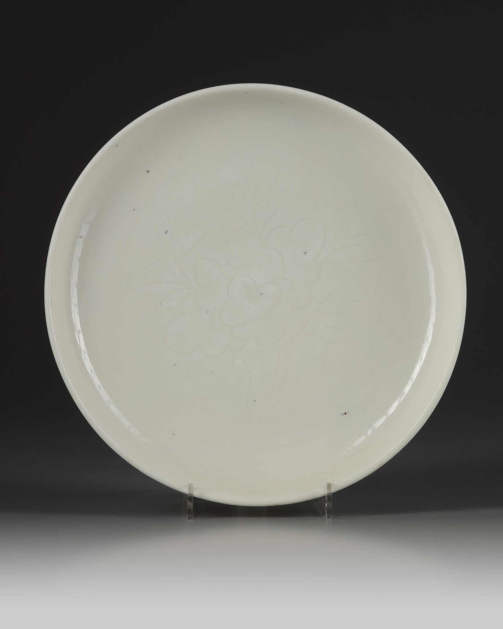 The interior is decorated with a large, freely-incised peony to the centre. The porcelain is covered overall with an ivory glaze.
