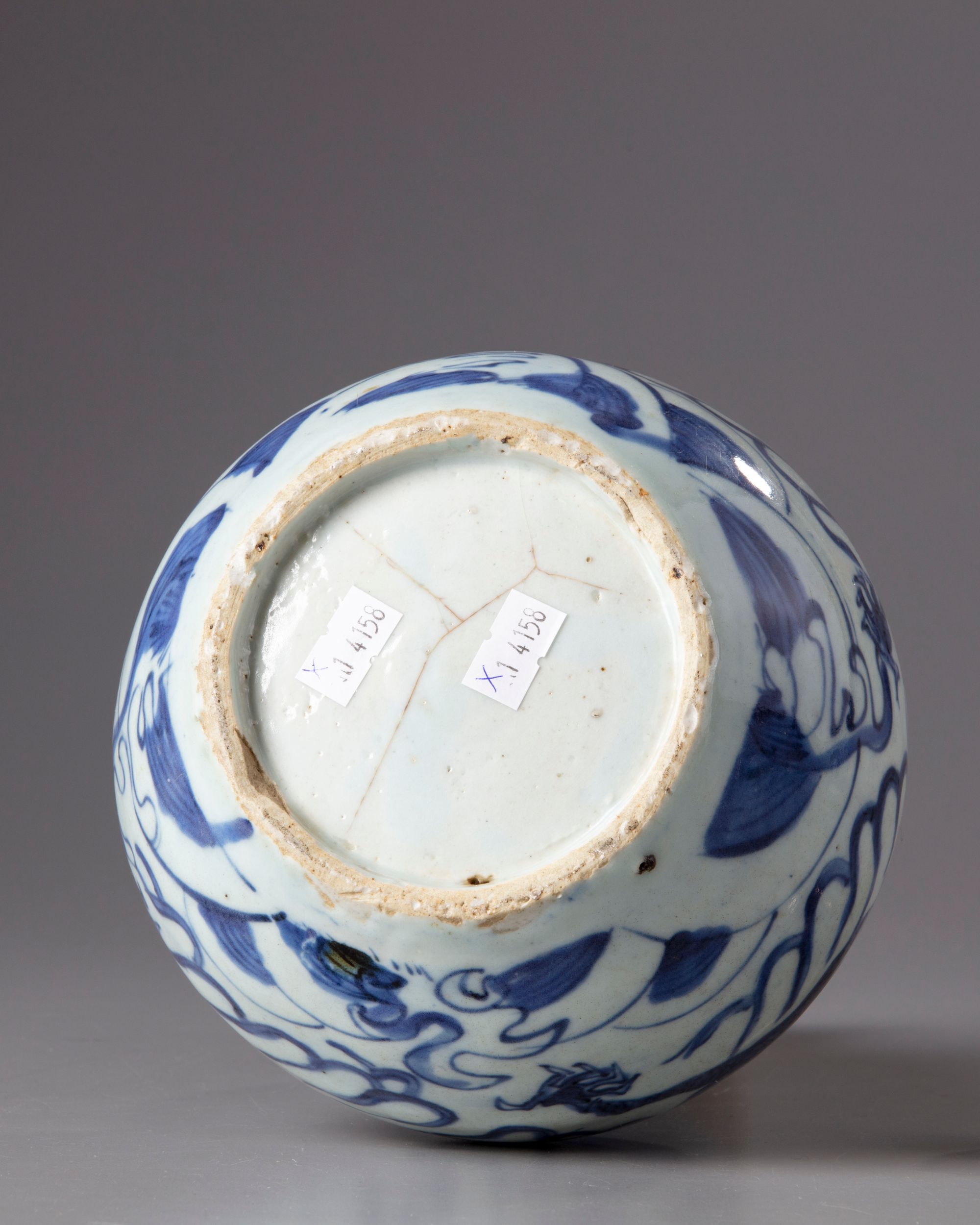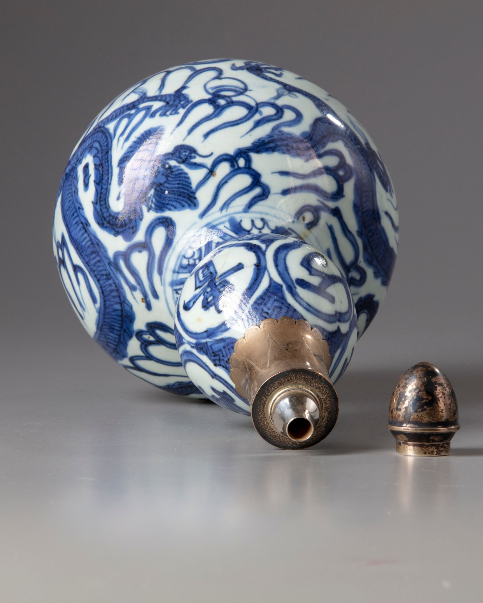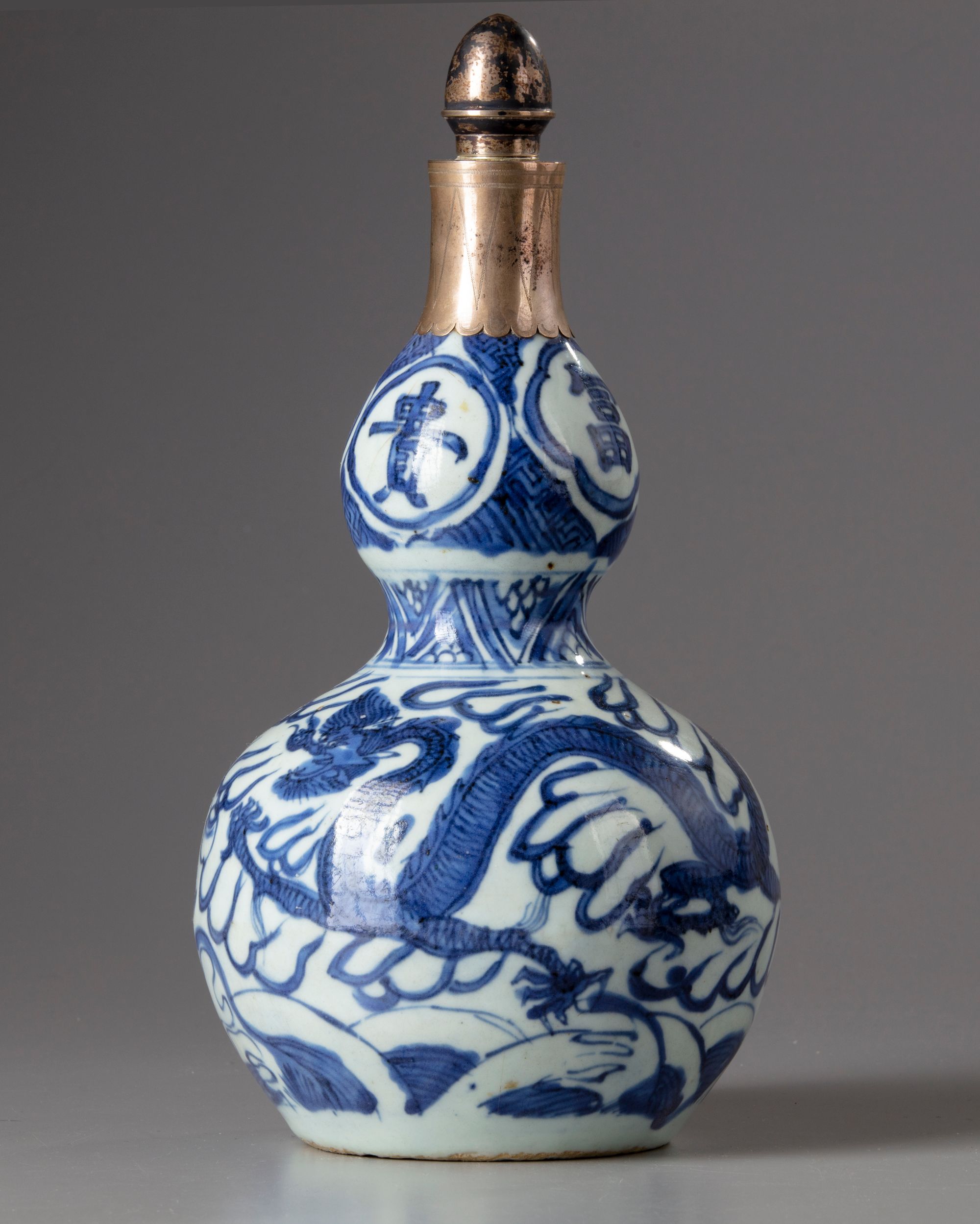 The lower body is decorated with two striding five-clawed dragons chasing the flaming pearl amongst flame scrolls above a wave band, the upper bulbous section is decorated with four cartouches enclosing the characters ‘wan nian fu gui’ on a brocade ground. The rim is mounted with a silver with a cover.