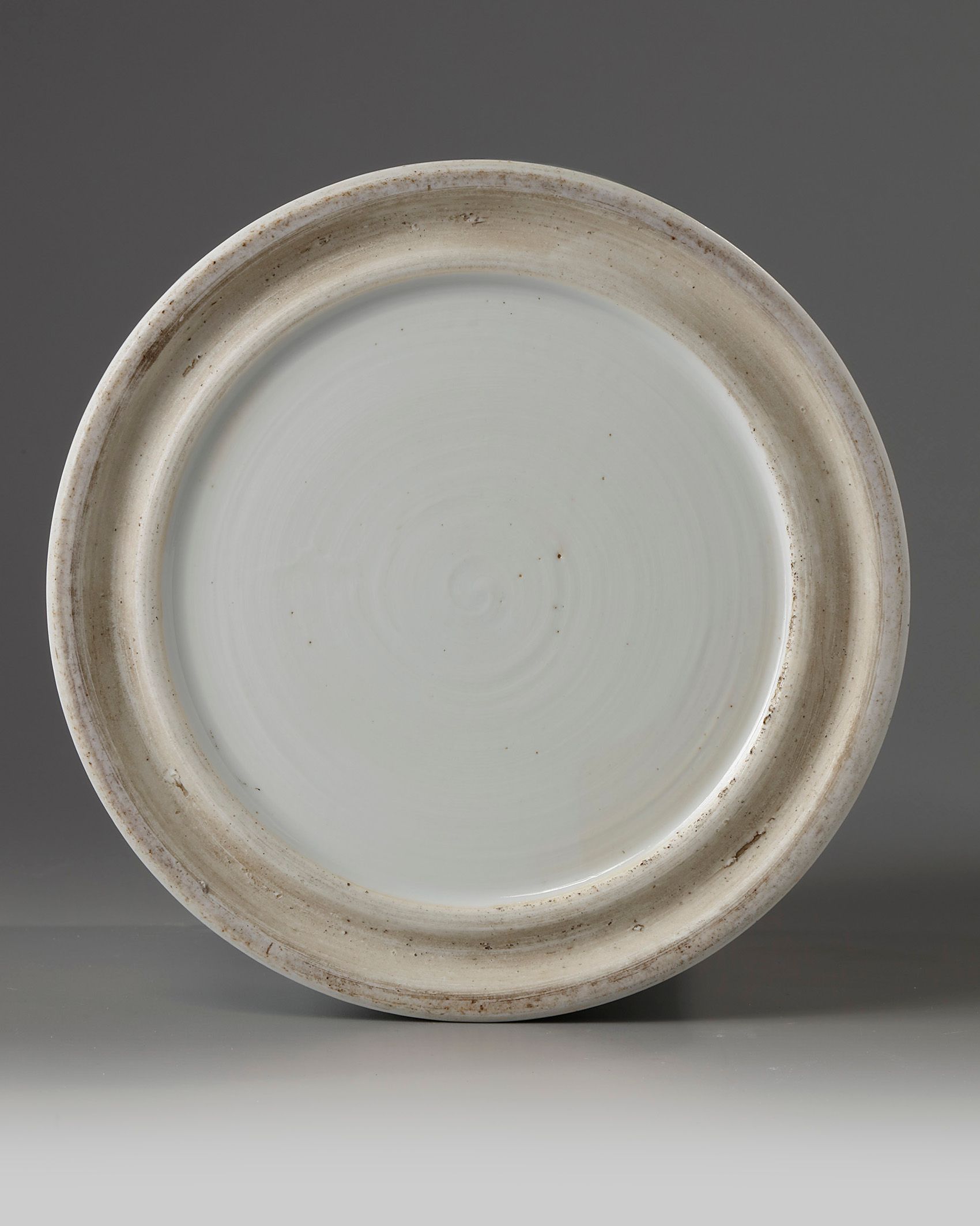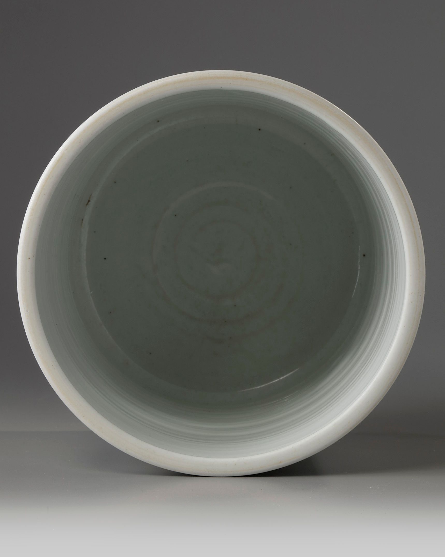 The cylindrical brush pot is decorated with a continuous scene of Luohan at leisure in a landscape, set between two bands of geometric design to the base and the rim.