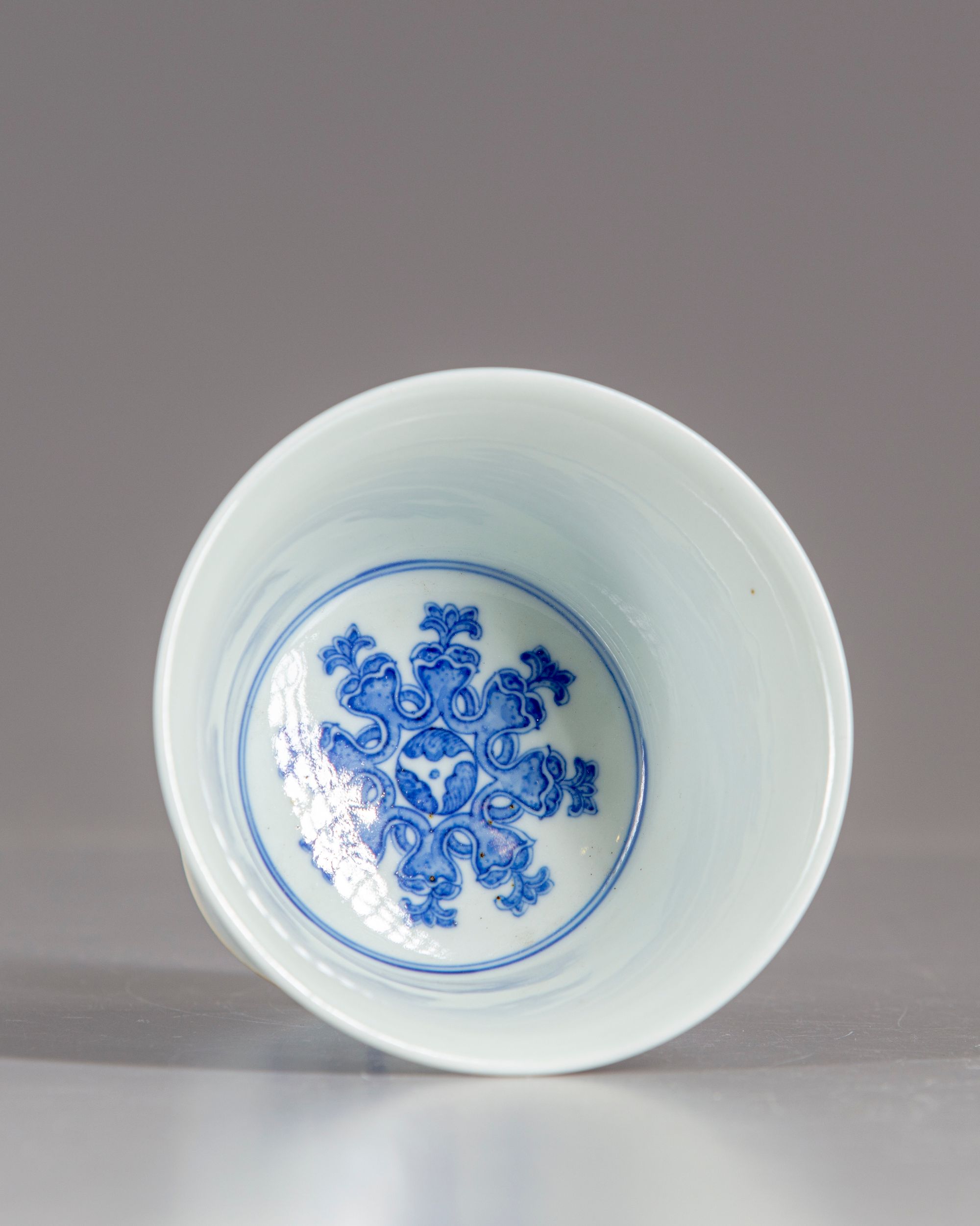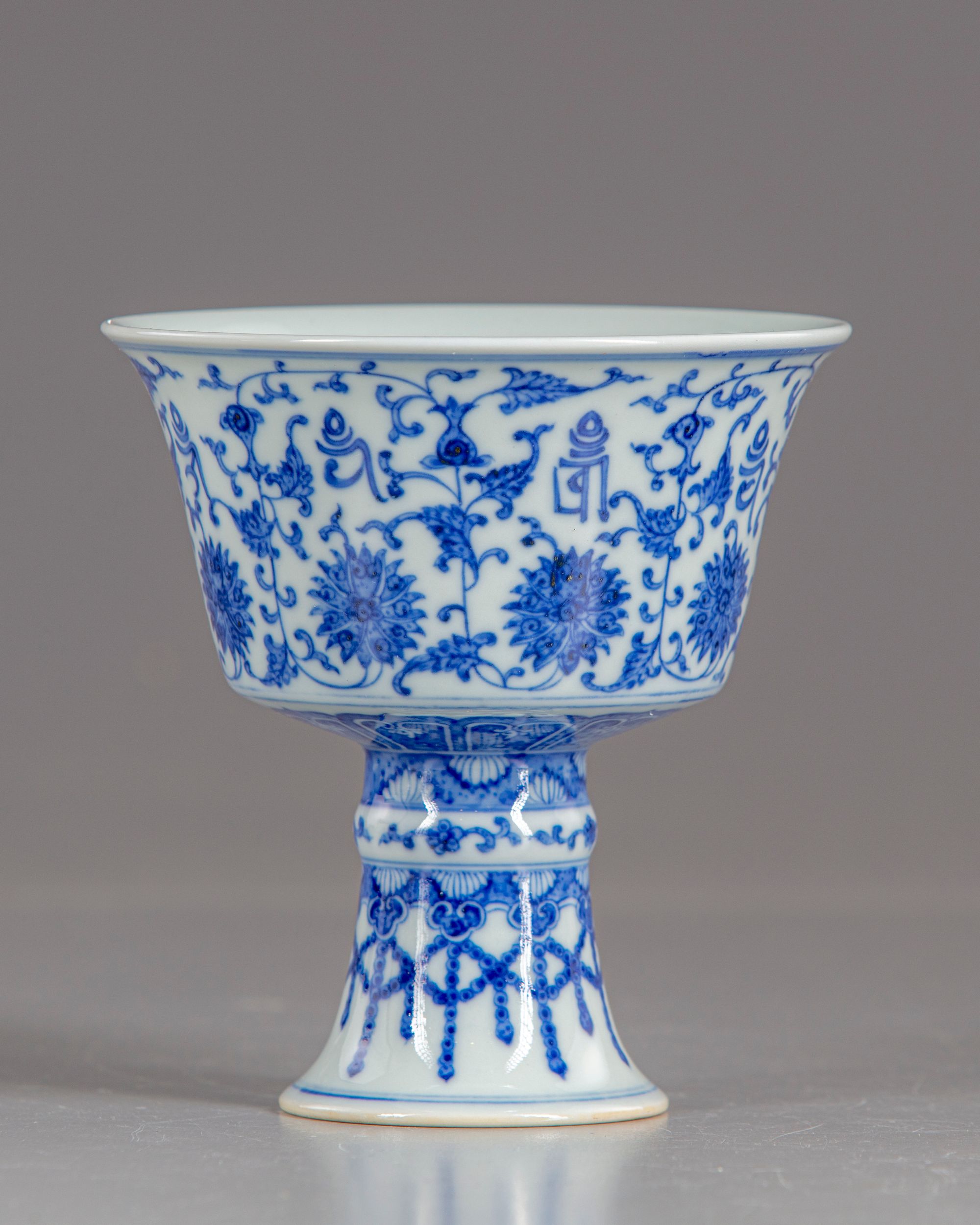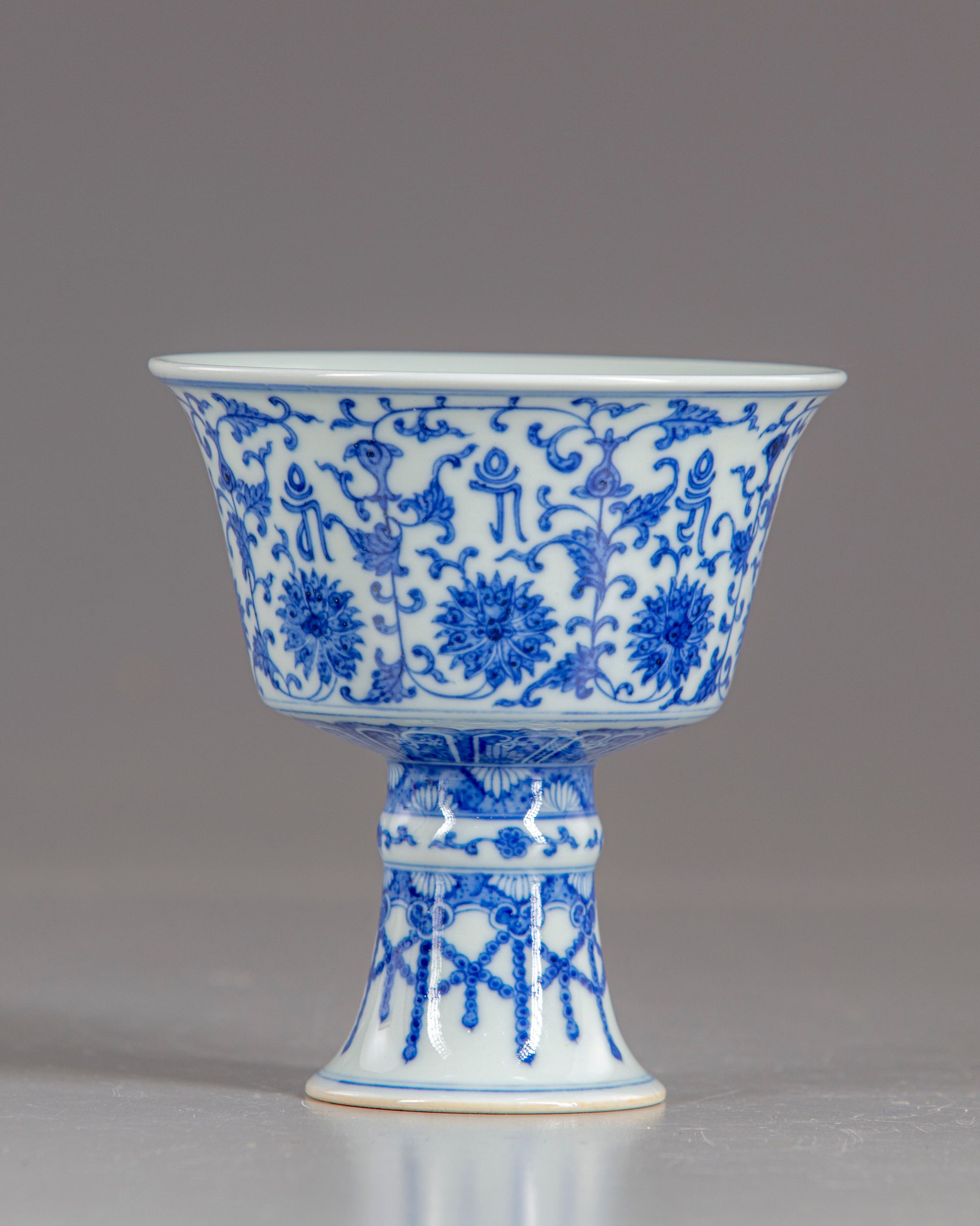 The stem cup is decorated on its exterior flaring sides with eight 'lanca characters' and lotus flowers issuing acanthus leaves and stylized blossoms, the stem foot with a band of ruyi-head motif and flower sprays. The base with a Qianlong seal mark.