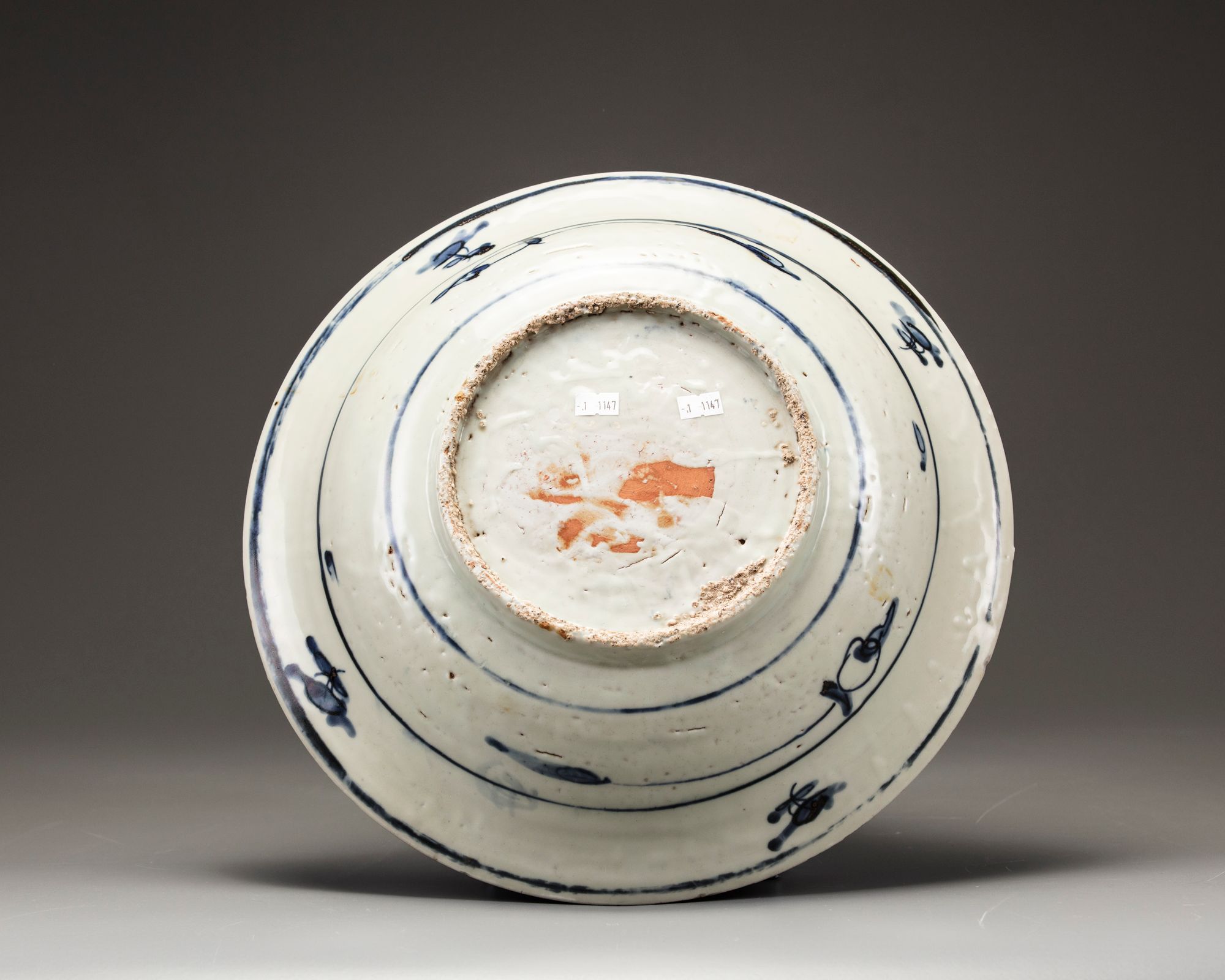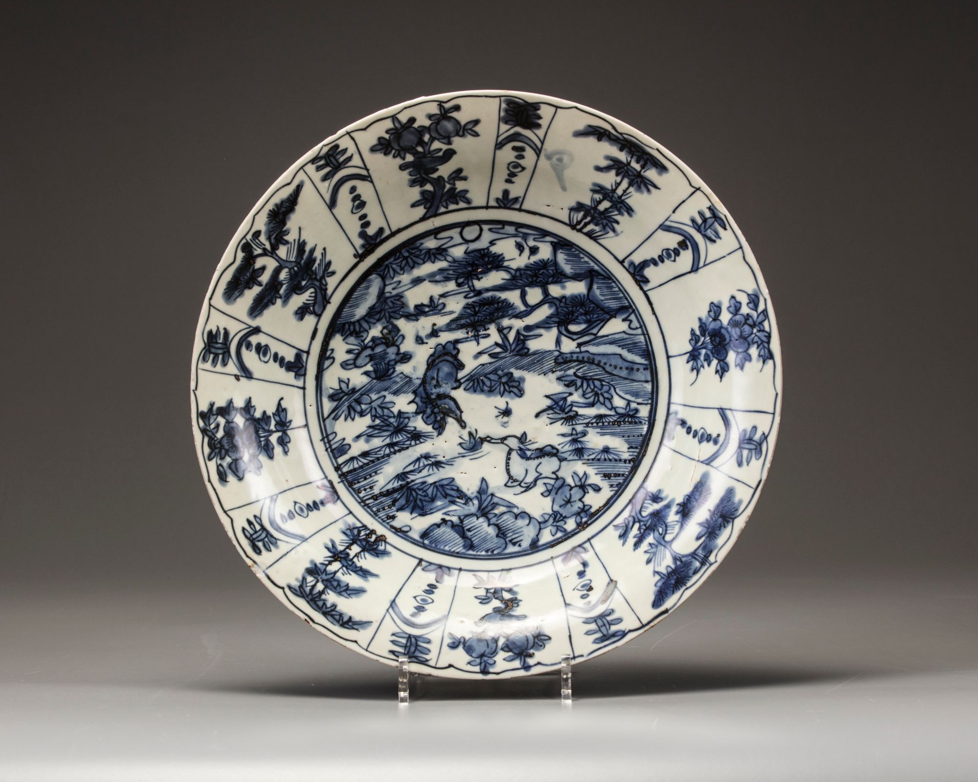 The large plate is decorated to the centre with a panel enclosing two deer amongst lingzhi fungus, flowers, and rocks all below pine trees. The panel is bordered with panels enclosing peach, pine, bamboo and flowers, and a dotted decoration.