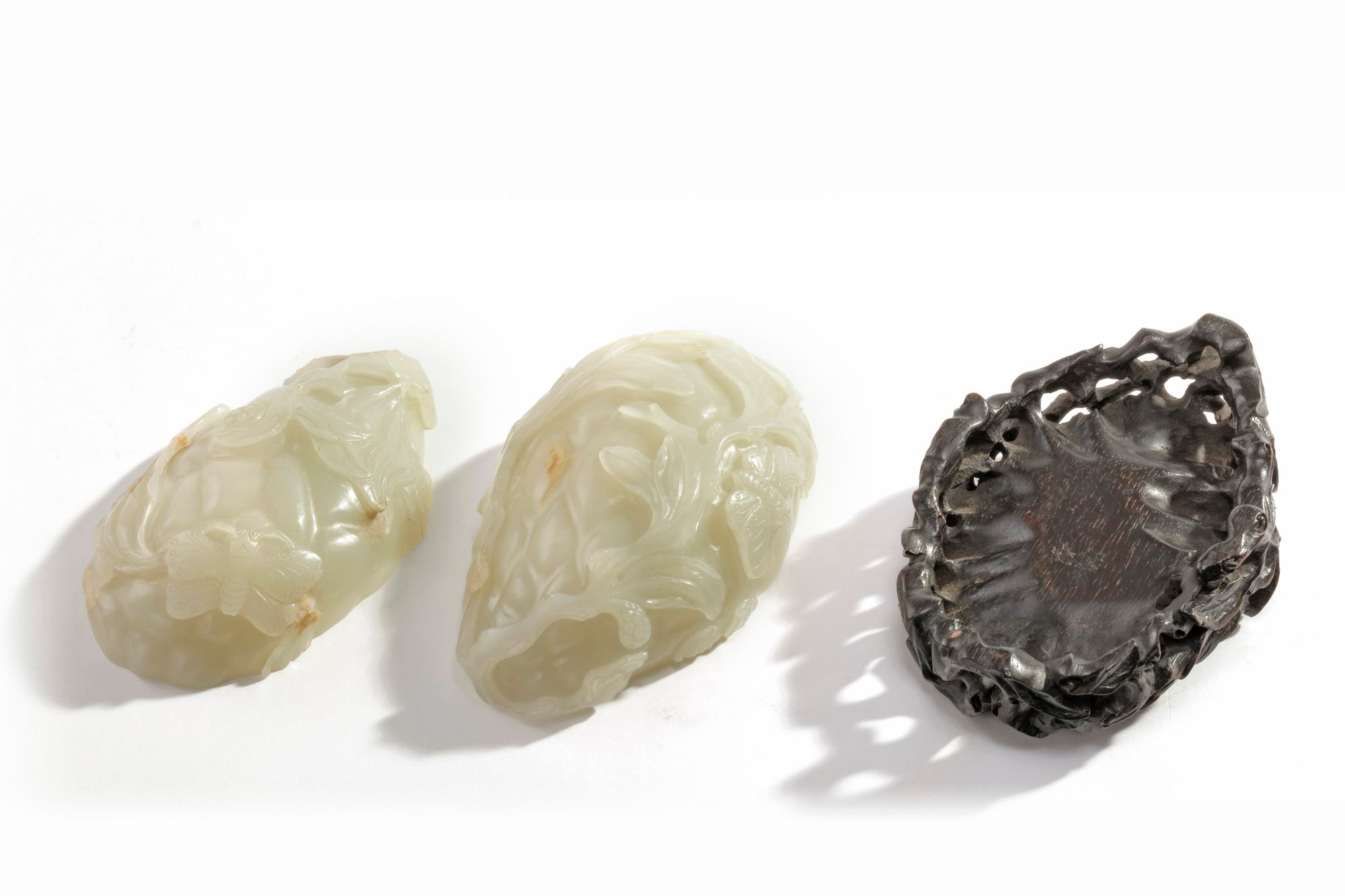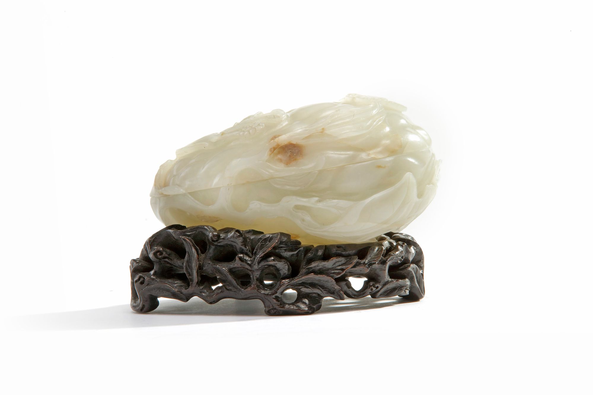 The box is carved overall in the round on a leafy gnarled branch, with a butterfly and further small buds. The jade is of a pale tone with russet inclusions.