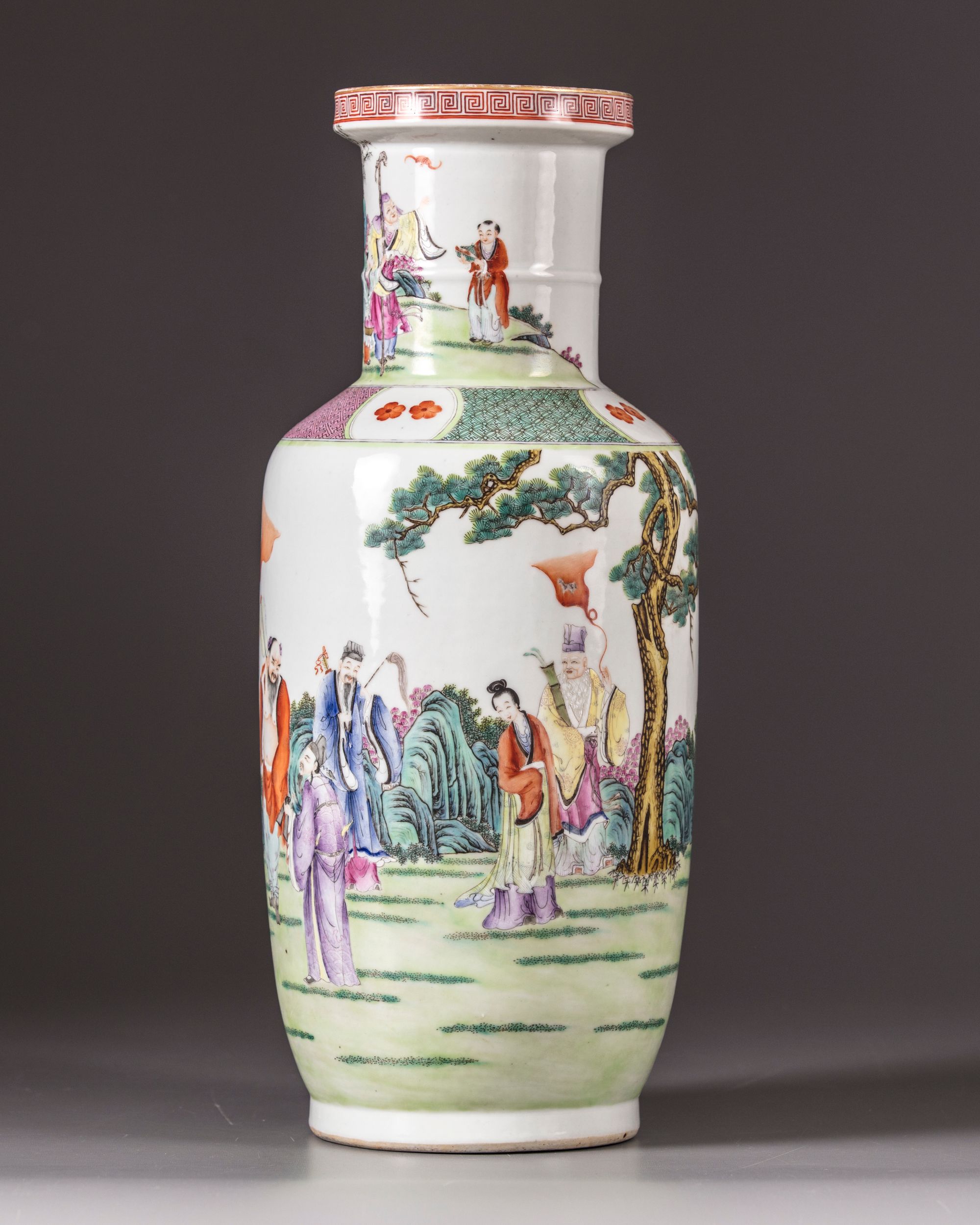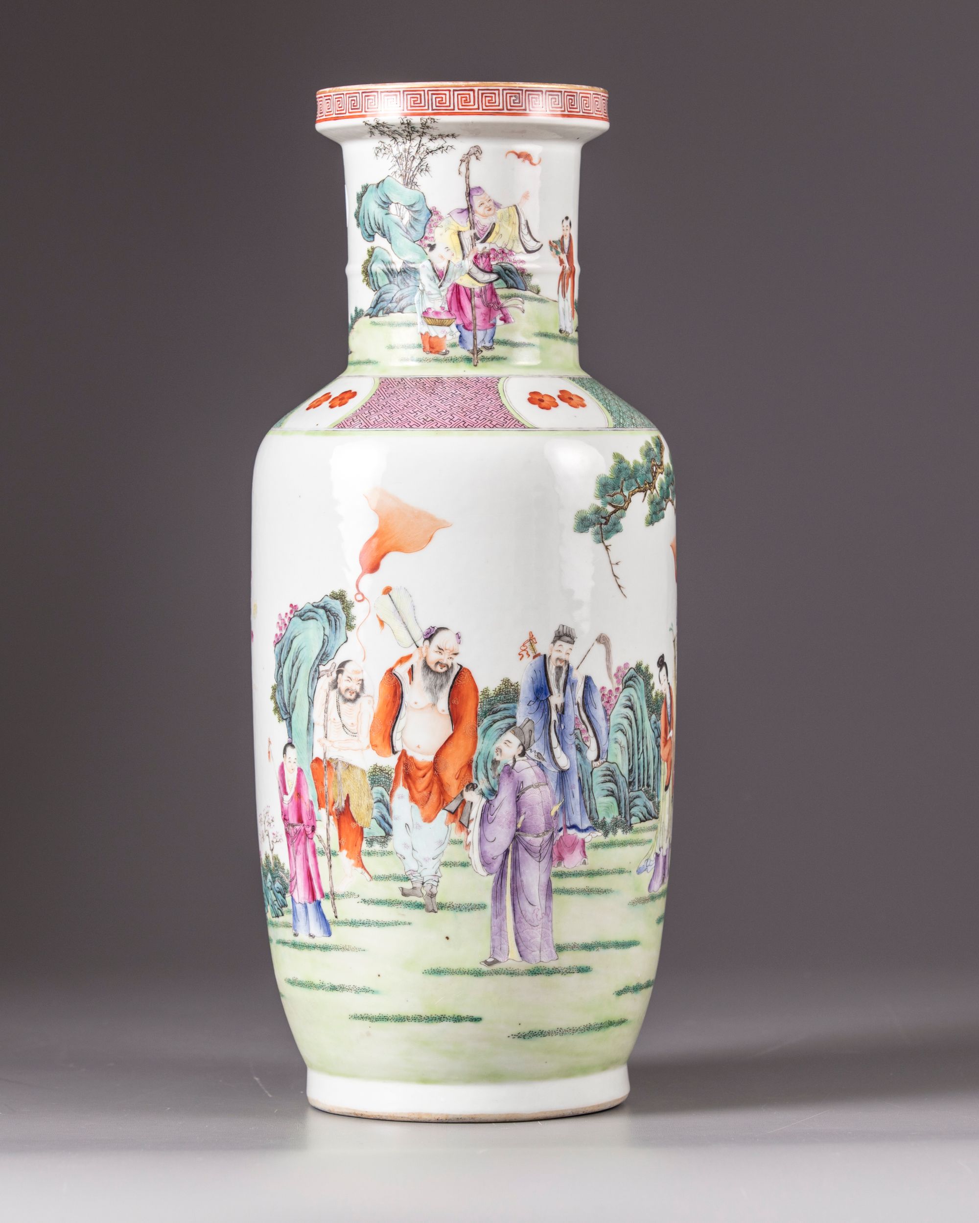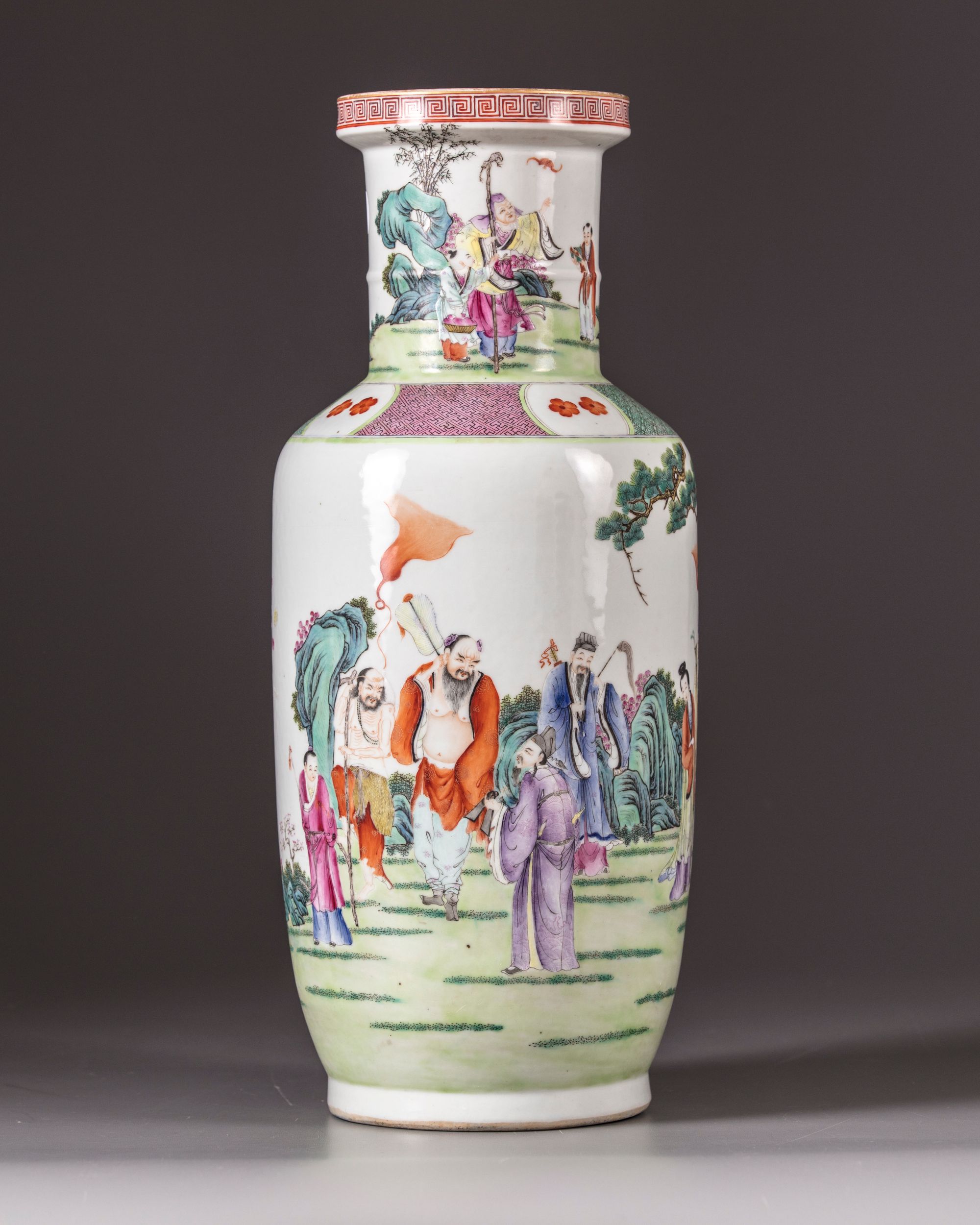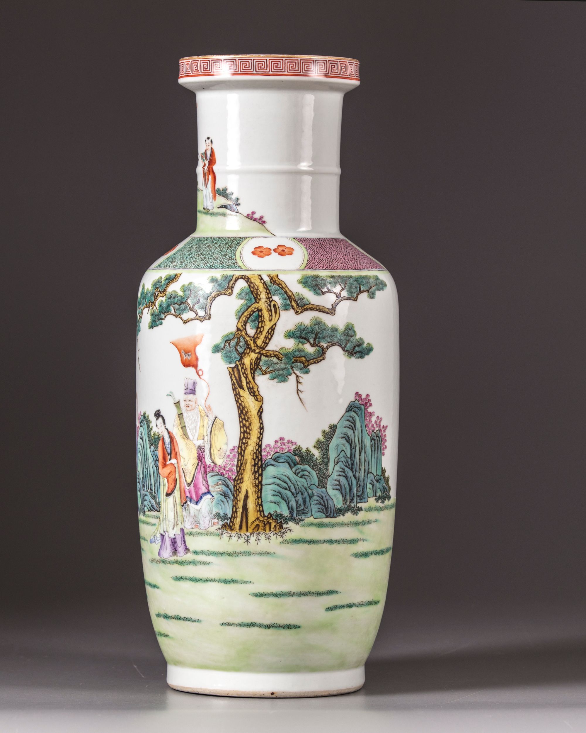 The vase is decorated with colorful dignitaries standing in a landscape.