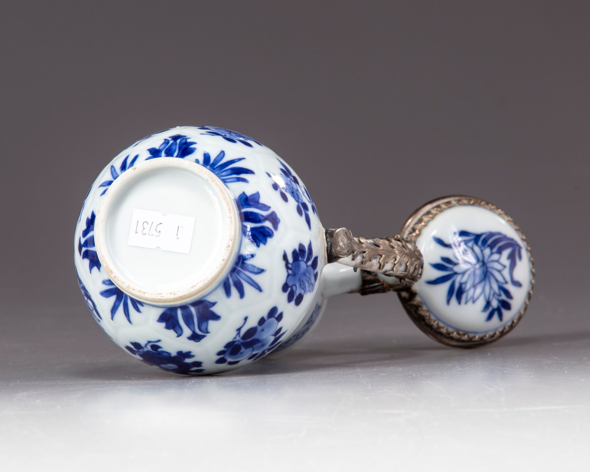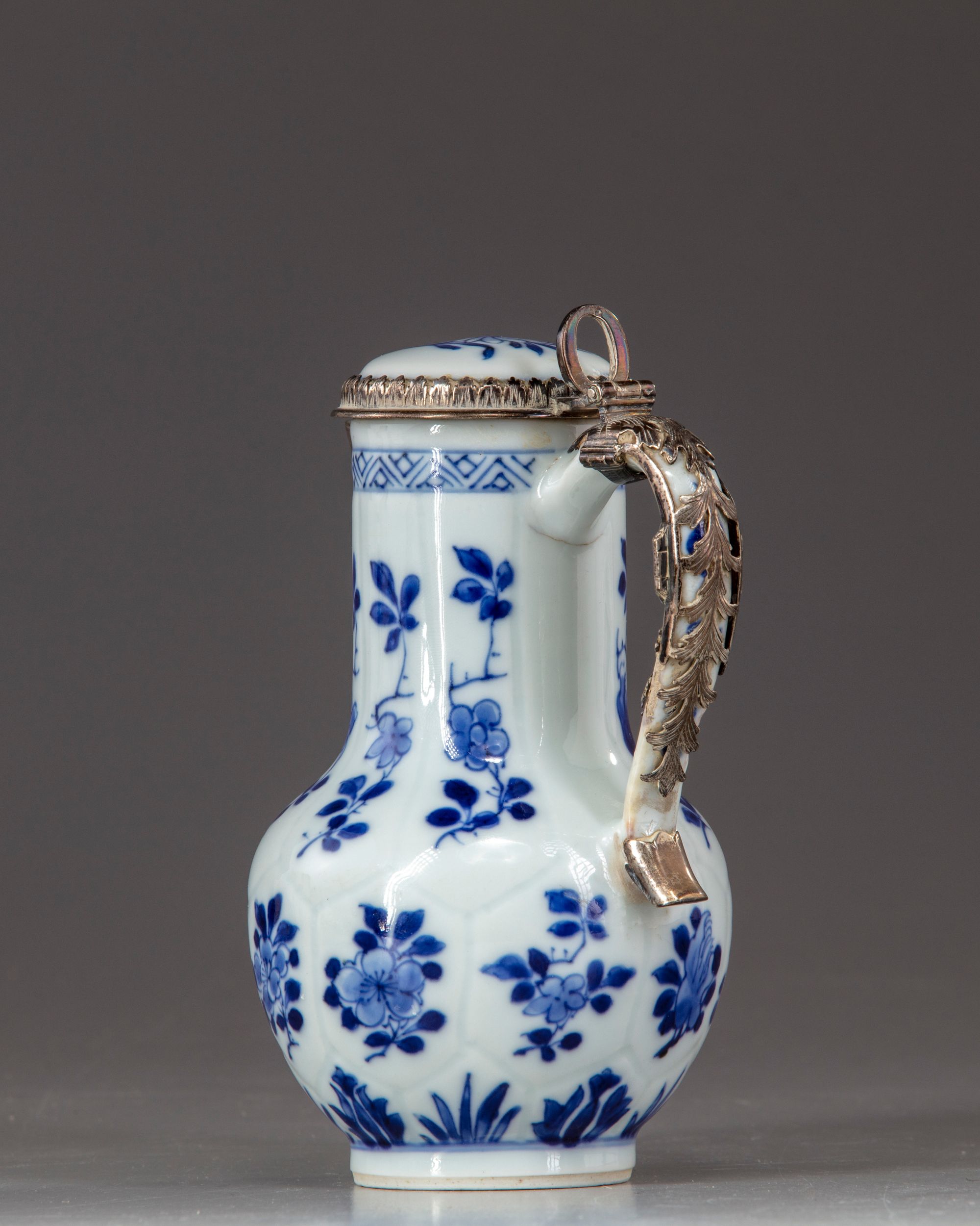A Chinese porcelain milk jug, with a small pout and straight handle, decorated in cobalt-blue with panels in low relief enclosing flower sprigs.