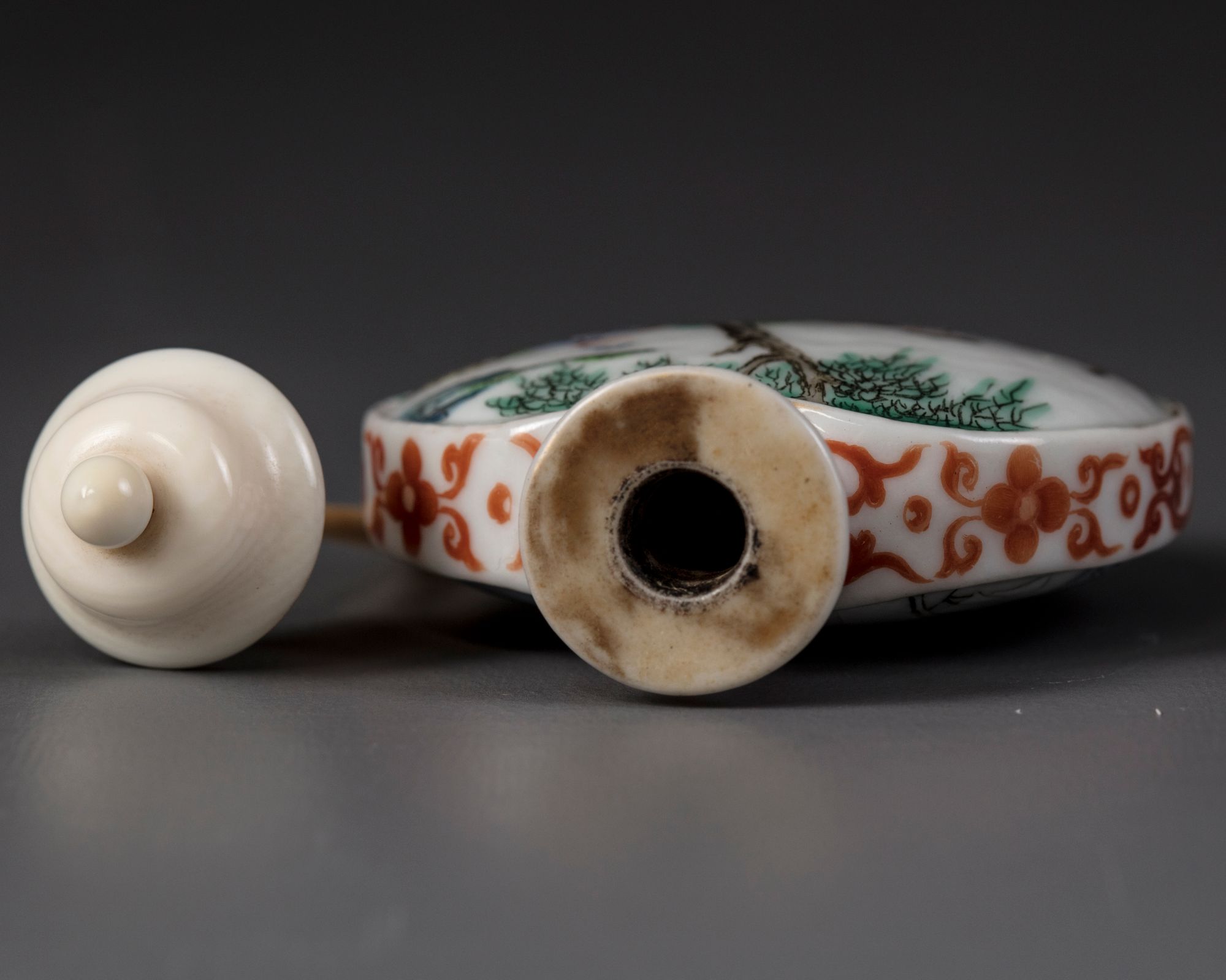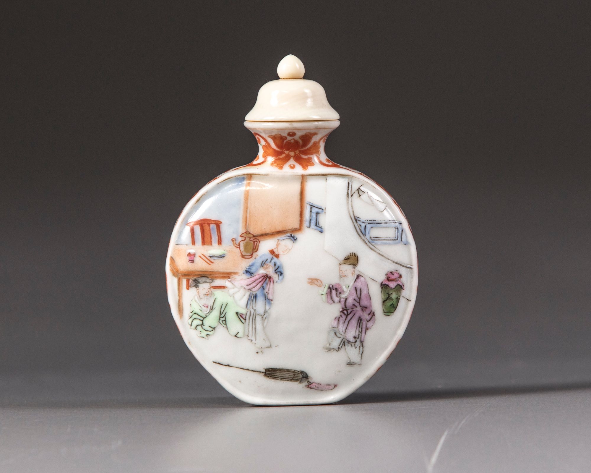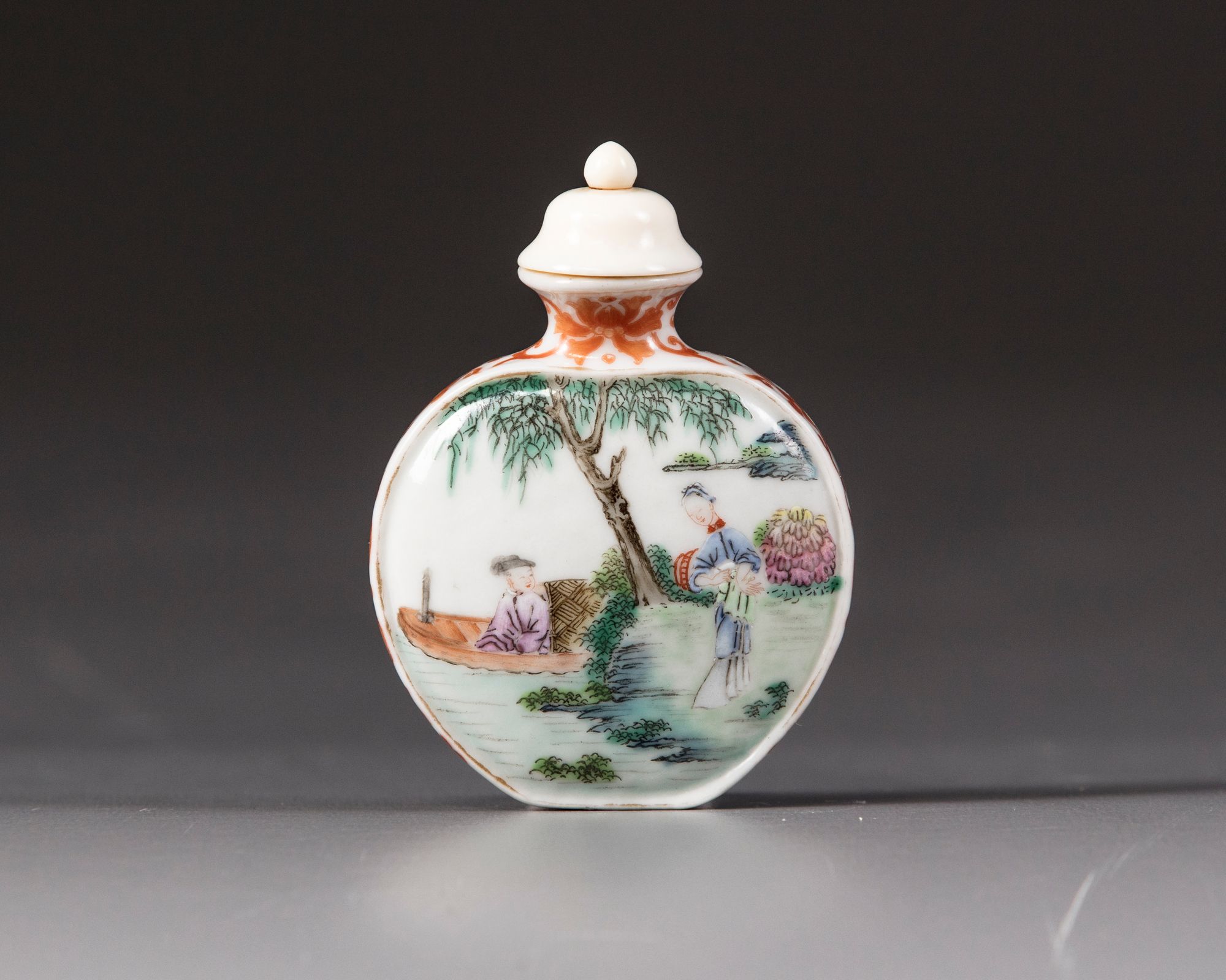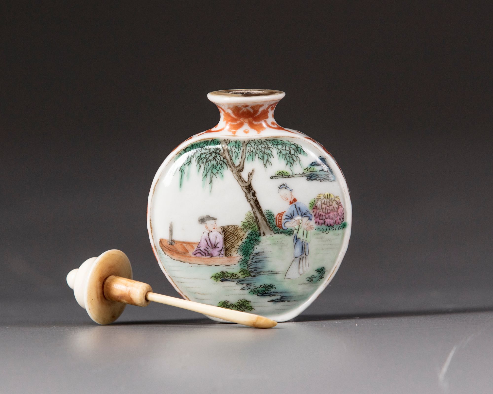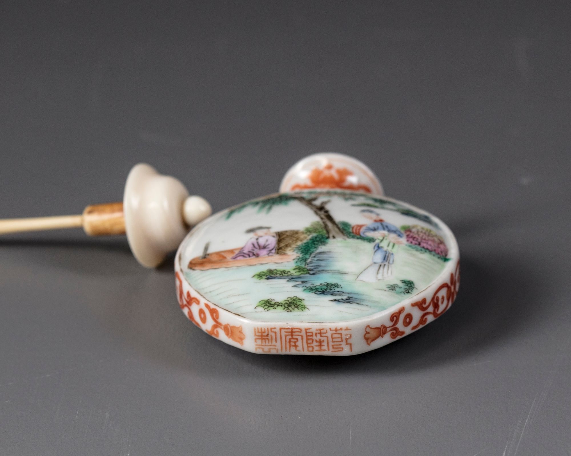 The flattened bottle is decorated to one side with a scene of a lady in a furnished room with two scholars, the other side is decorated with the same lady standing on a riverbank with a scholar in a sampan, all amongst bushes and trees. The flattened sides and neck are decorated with scrolling flowers, the base with an apocryphal Qianlong mark. The rim and raised borders are gilt. With an ivory stopper.