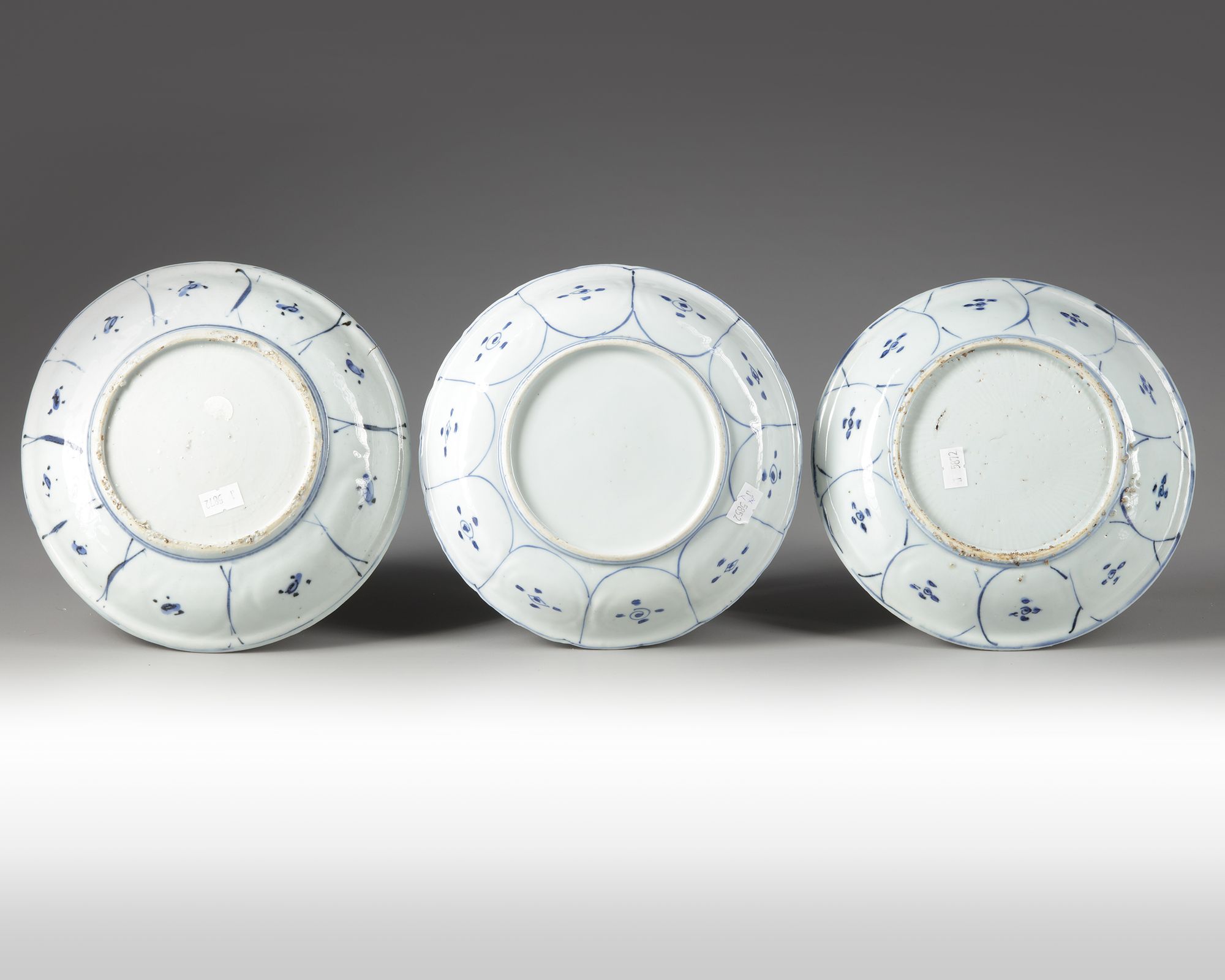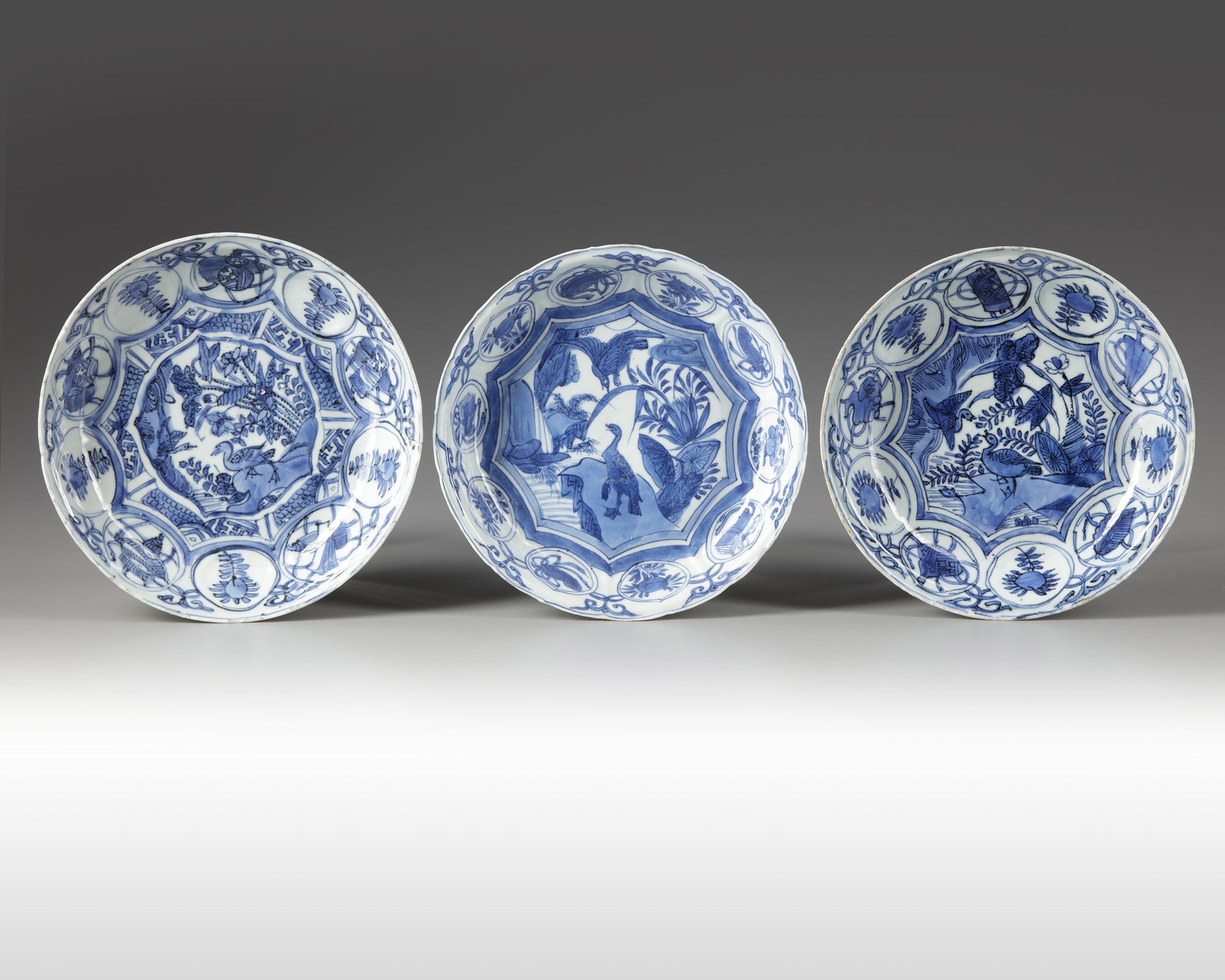 Three Chinese blue and white dishes, decorated in cobalt-blue with a central roundel enclosing two ducks amongst flowers and lake plants. To the sides with alternating panels of precious objects and common sunflowers. Provenance: from a private Dutch collection