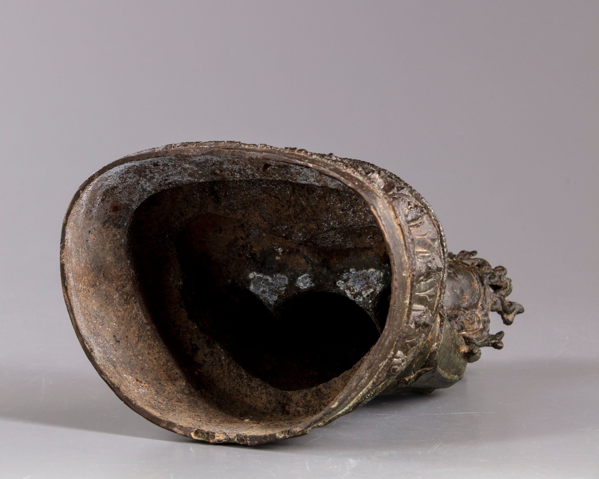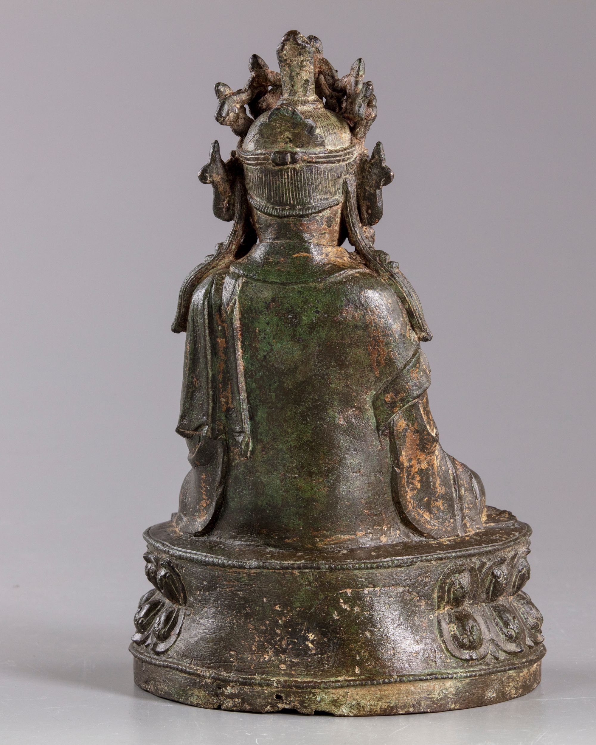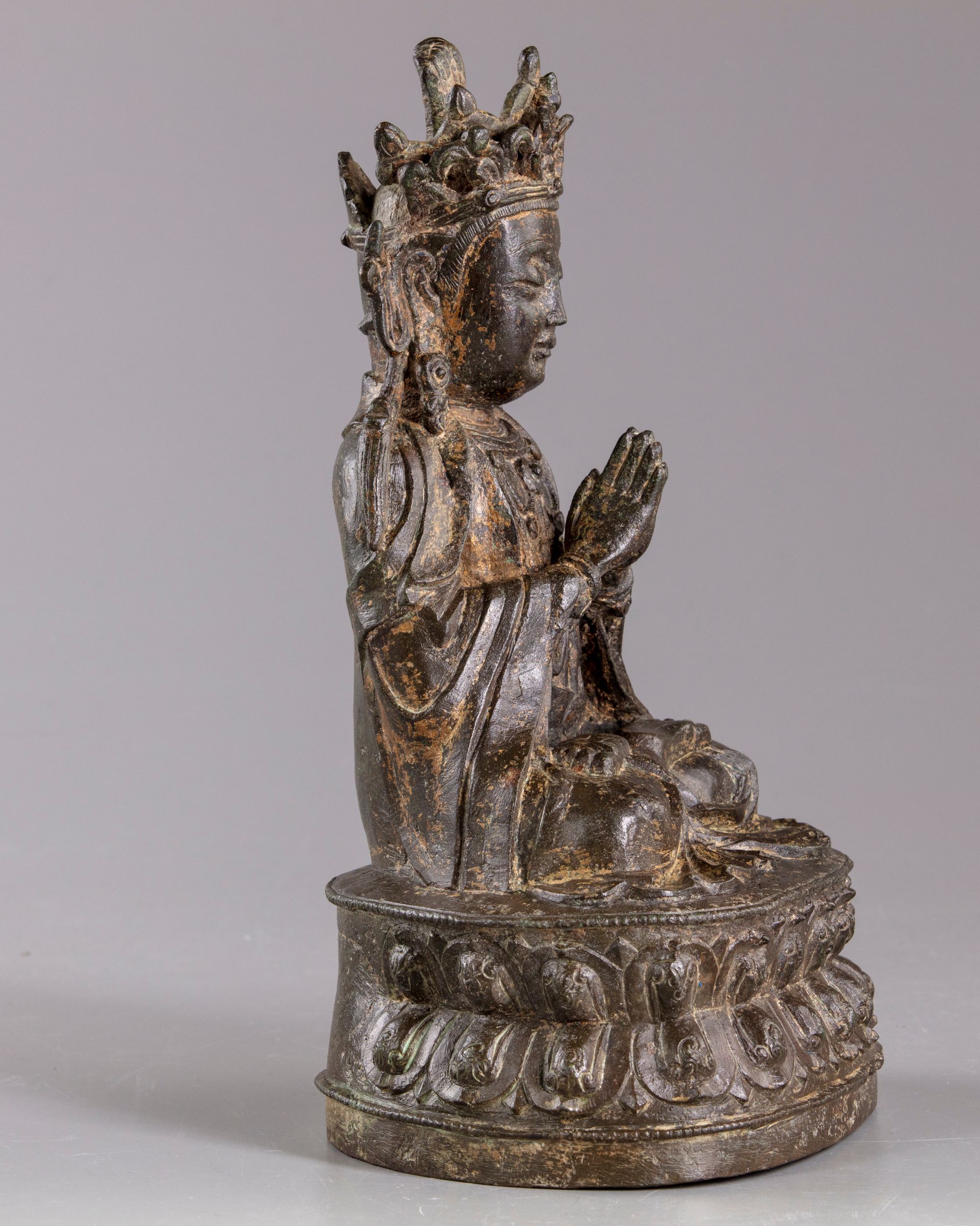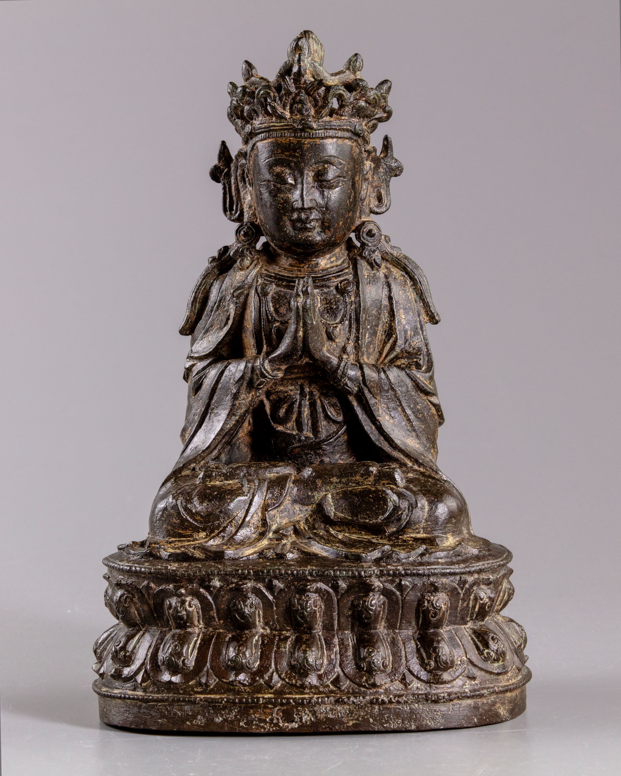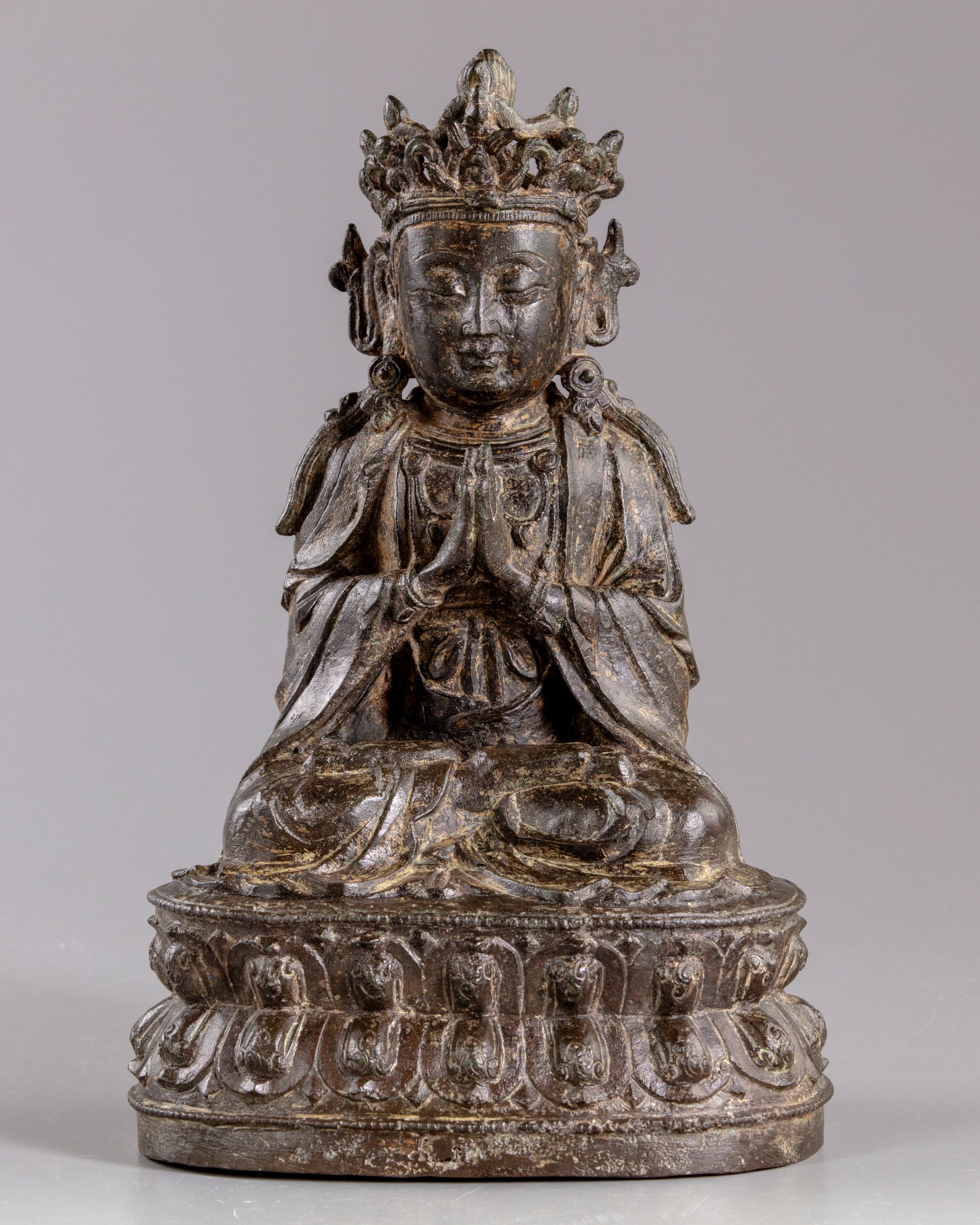 The Bodhisattva of Mercy seated is cast seated in padmasana, the hands held in the respectful gesture of salutation, anjali mudra, upon a double lotus stand, wearing long robes open at the chest with jewellery, the face is serene expression with elongated ears, the hair kept upswept under a pointed tiara,