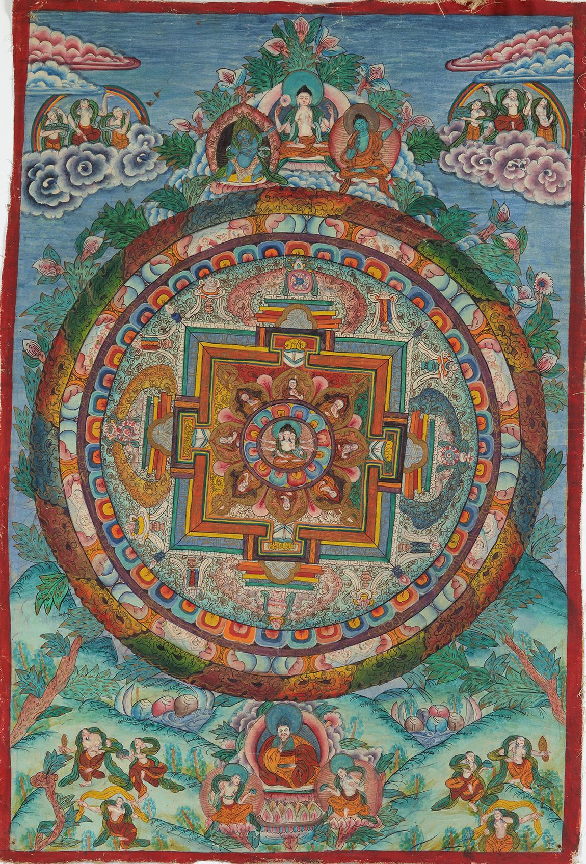 The mandala is centred on a three headed four armed bodhisattva, all above lamas to the lower register. The upper register with Vairocana to the centre surrounded by further Buddhist deities.