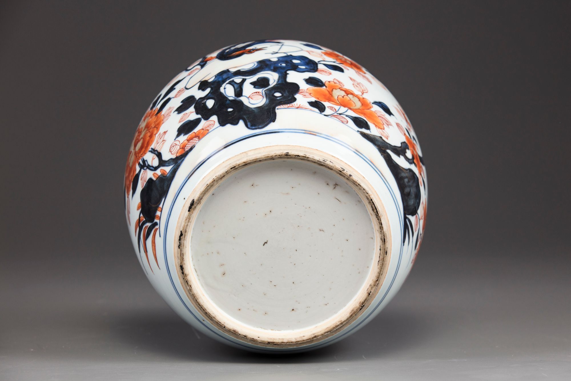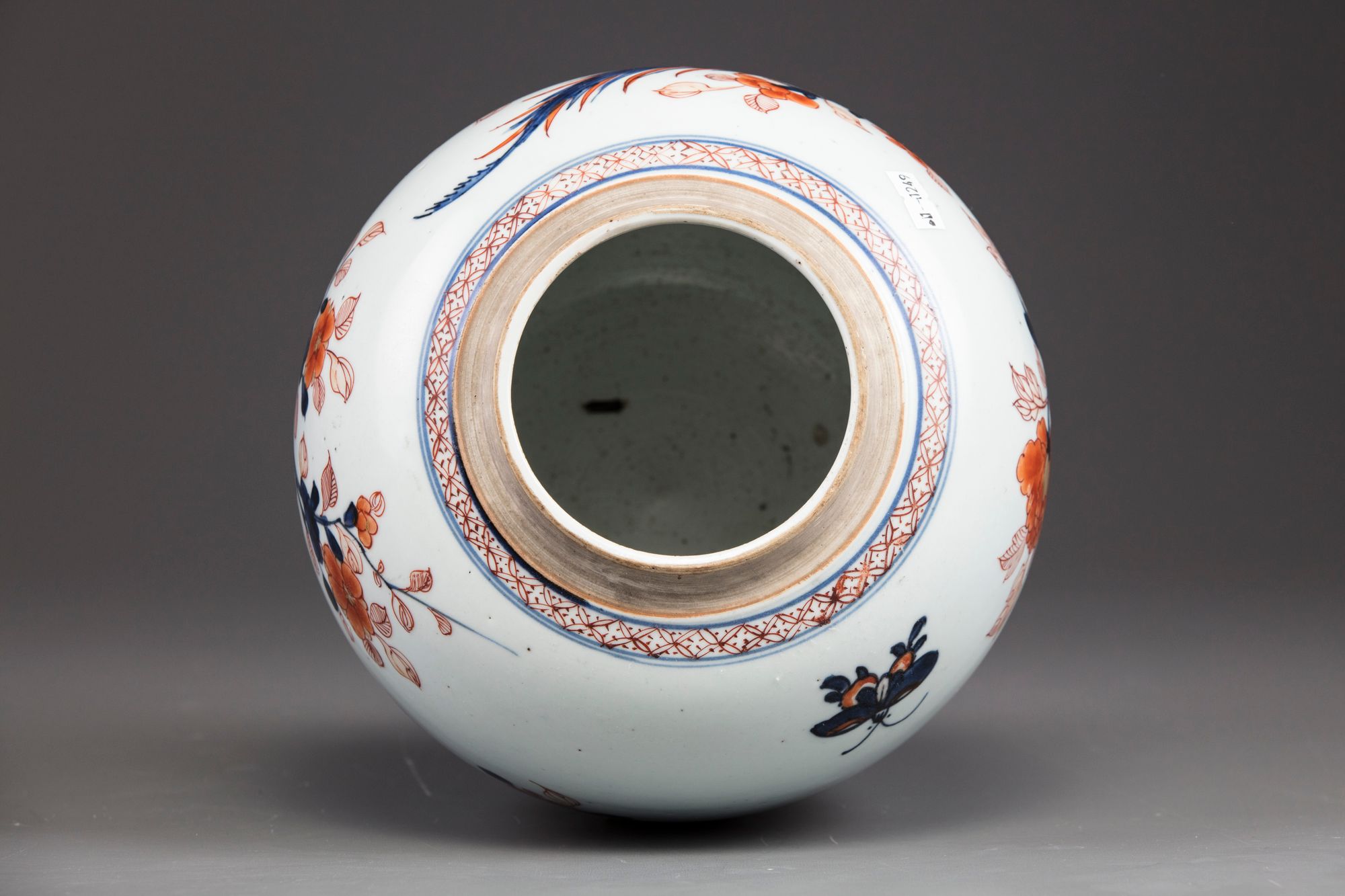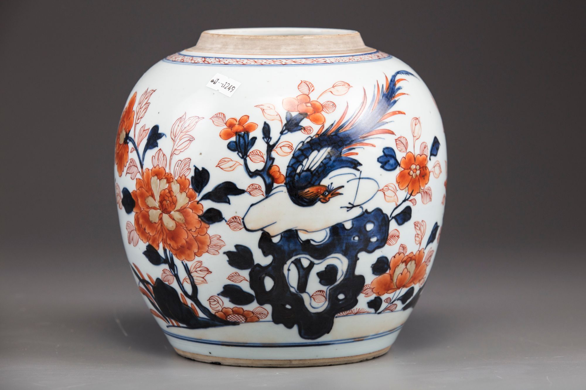 The jar is decorated and gilt with a pheasant standing on a chrysanthemum flower amongst flowering trees growing from a rock.