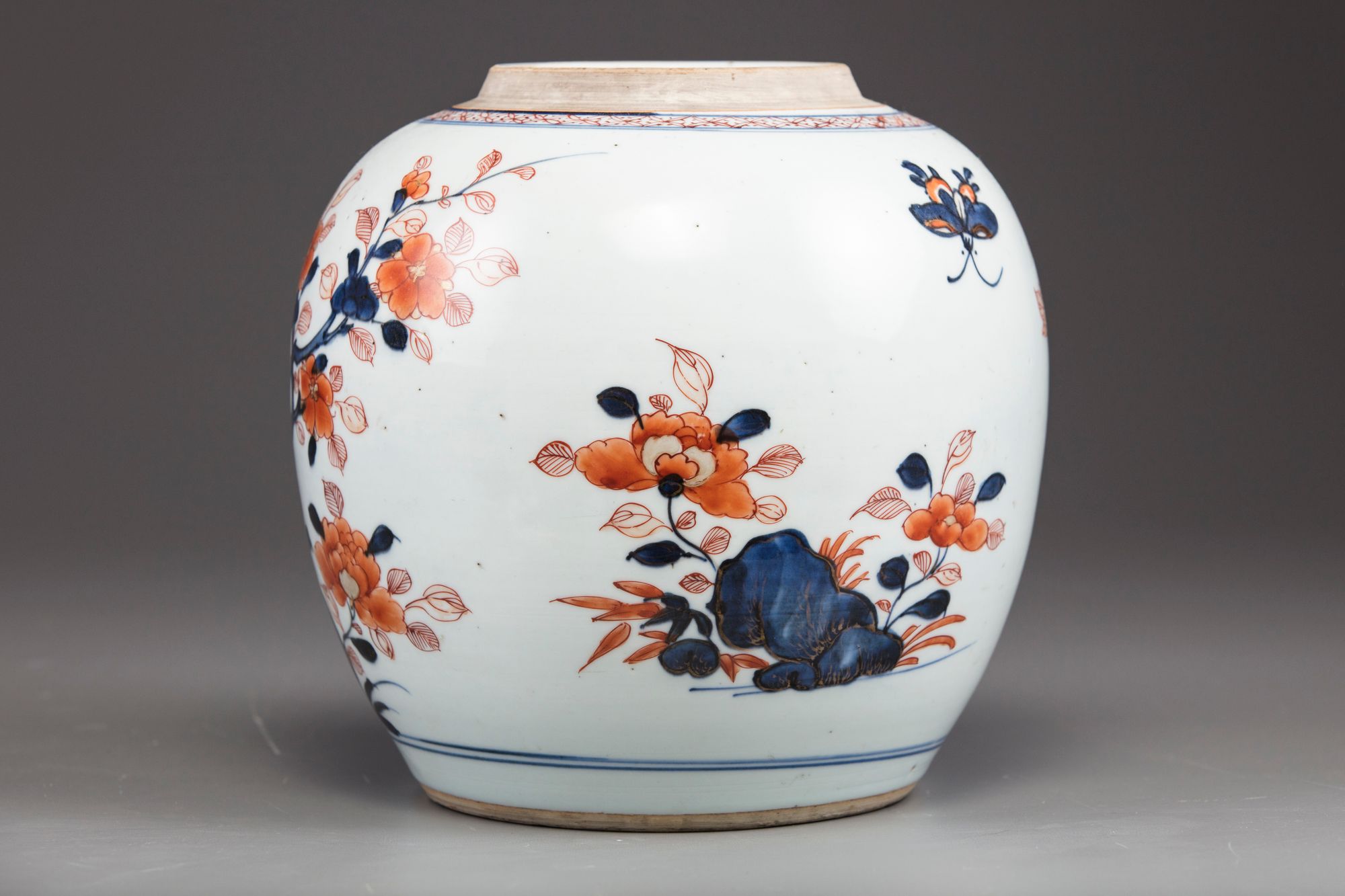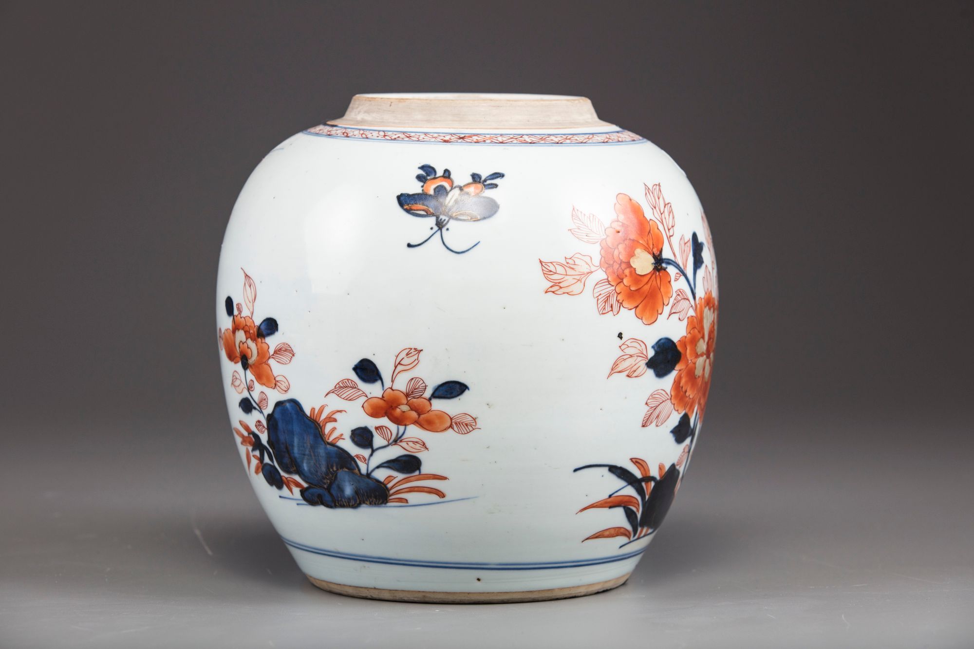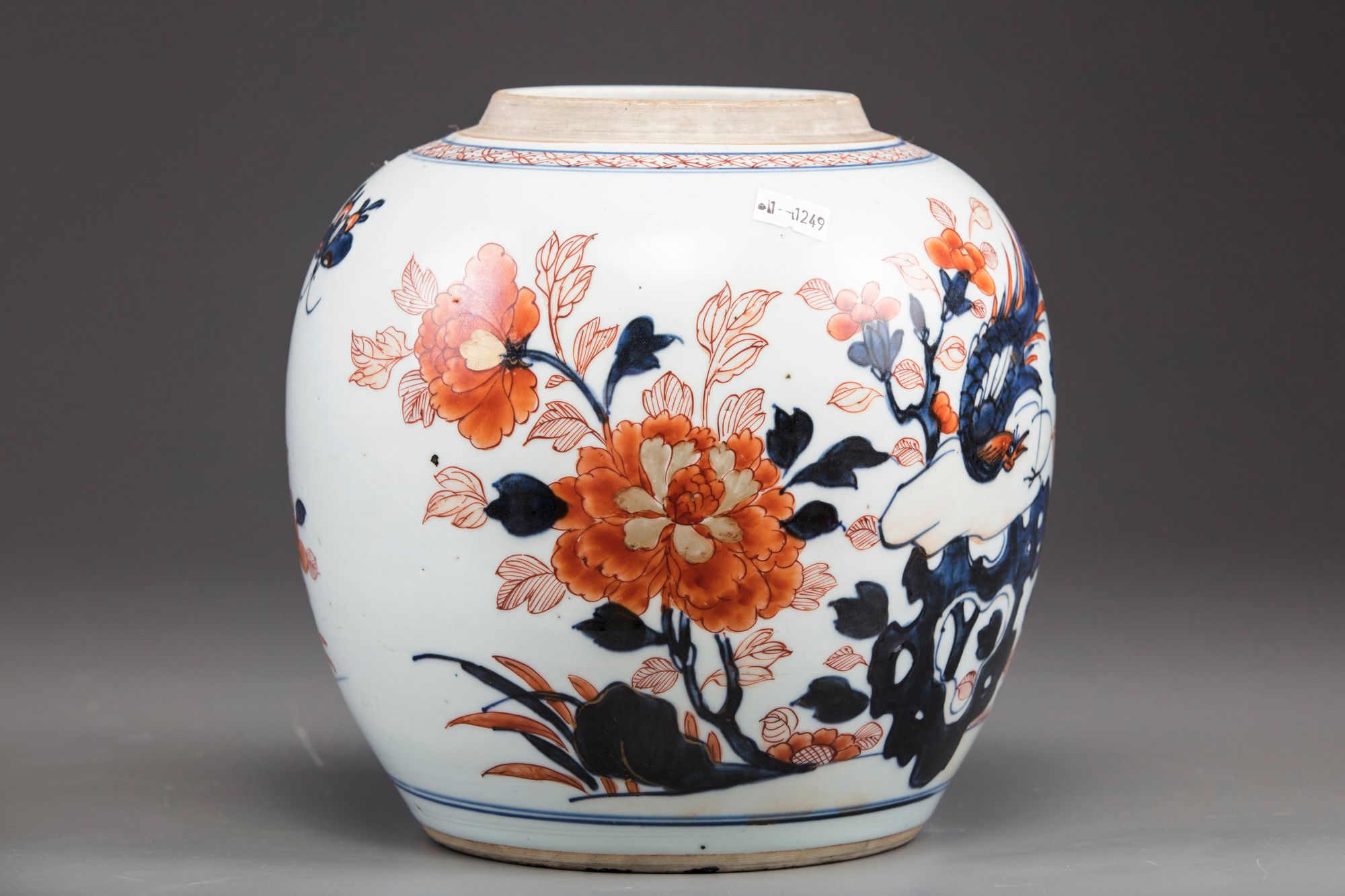 The jar is decorated and gilt with a pheasant standing on a chrysanthemum flower amongst flowering trees growing from a rock.