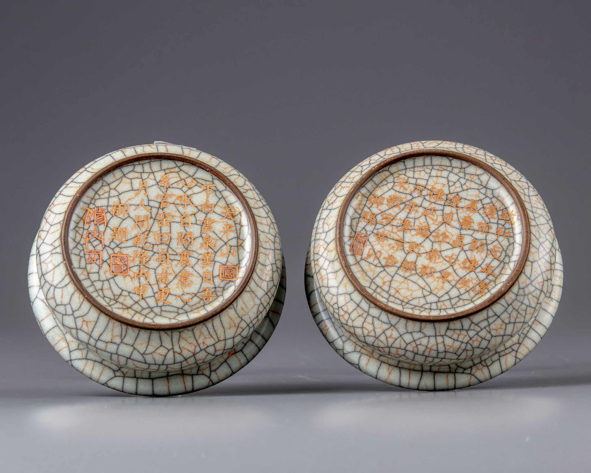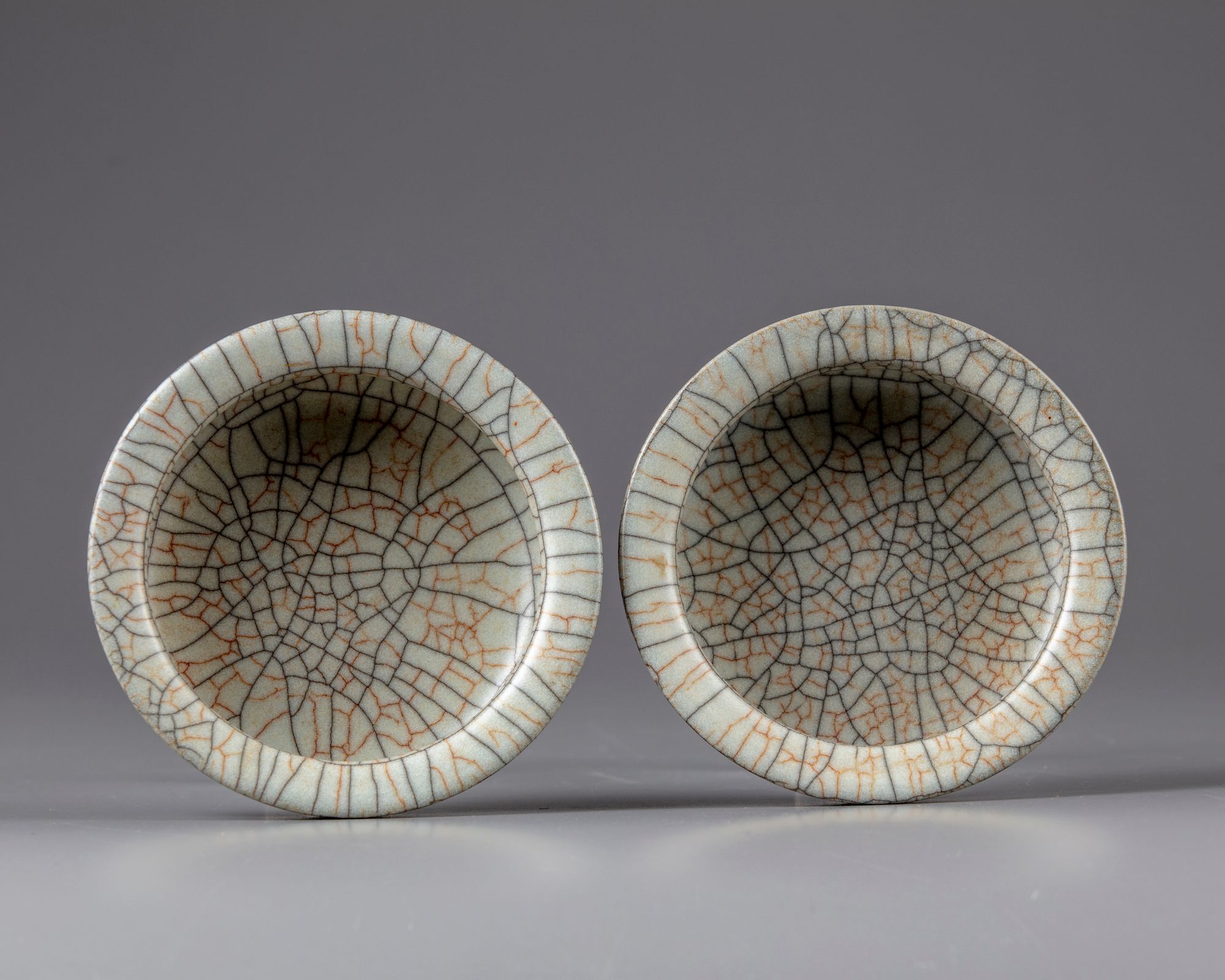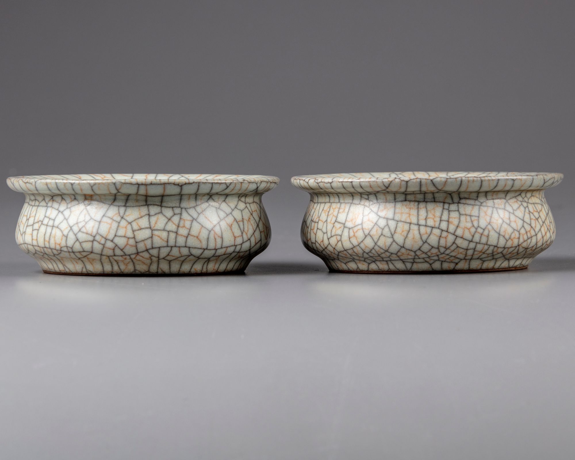 Both finely potted with a slightly recessed base and an everted rim, covered with a thick glaze suffused with a matrix of dark grey and russet crackles.