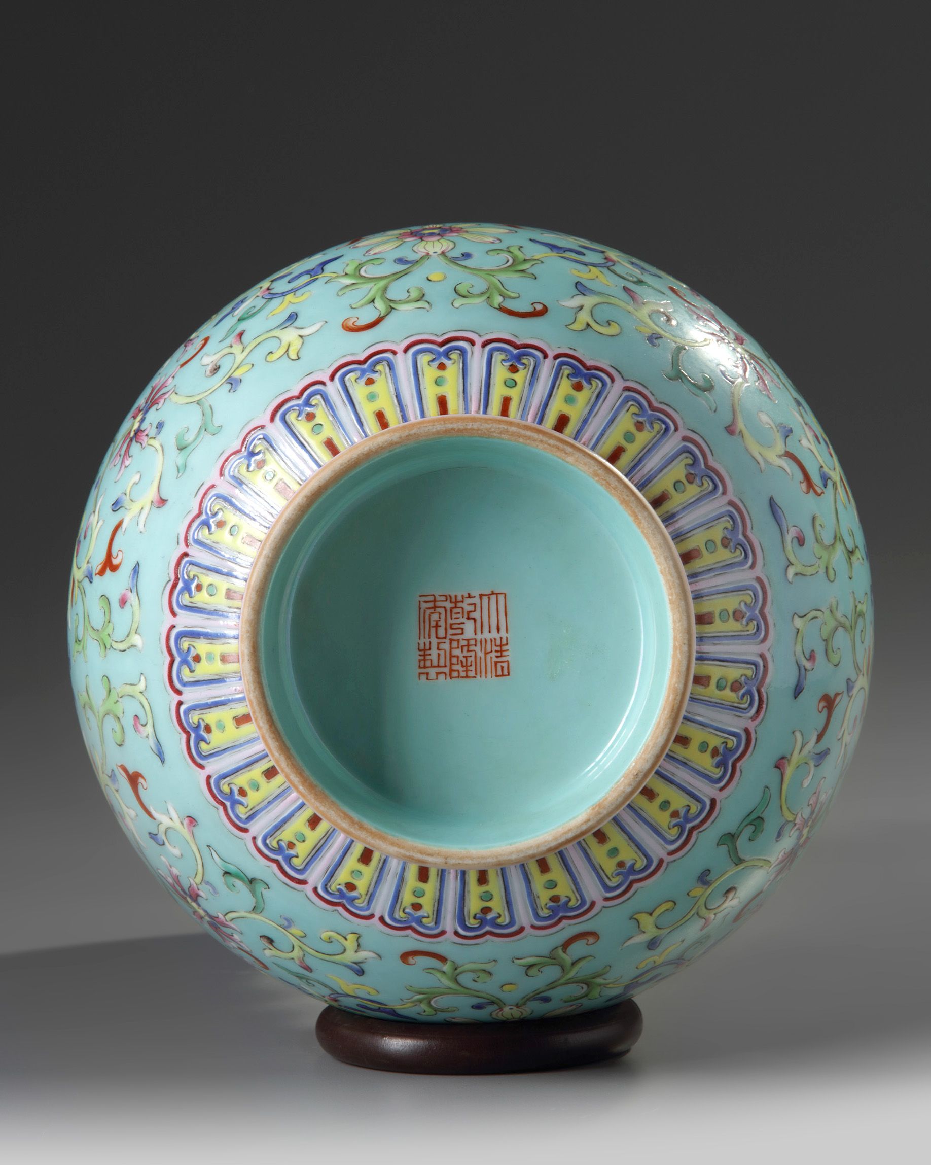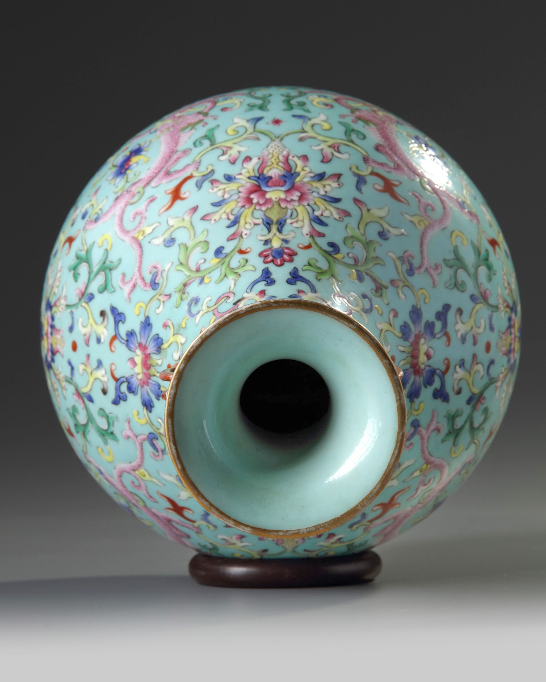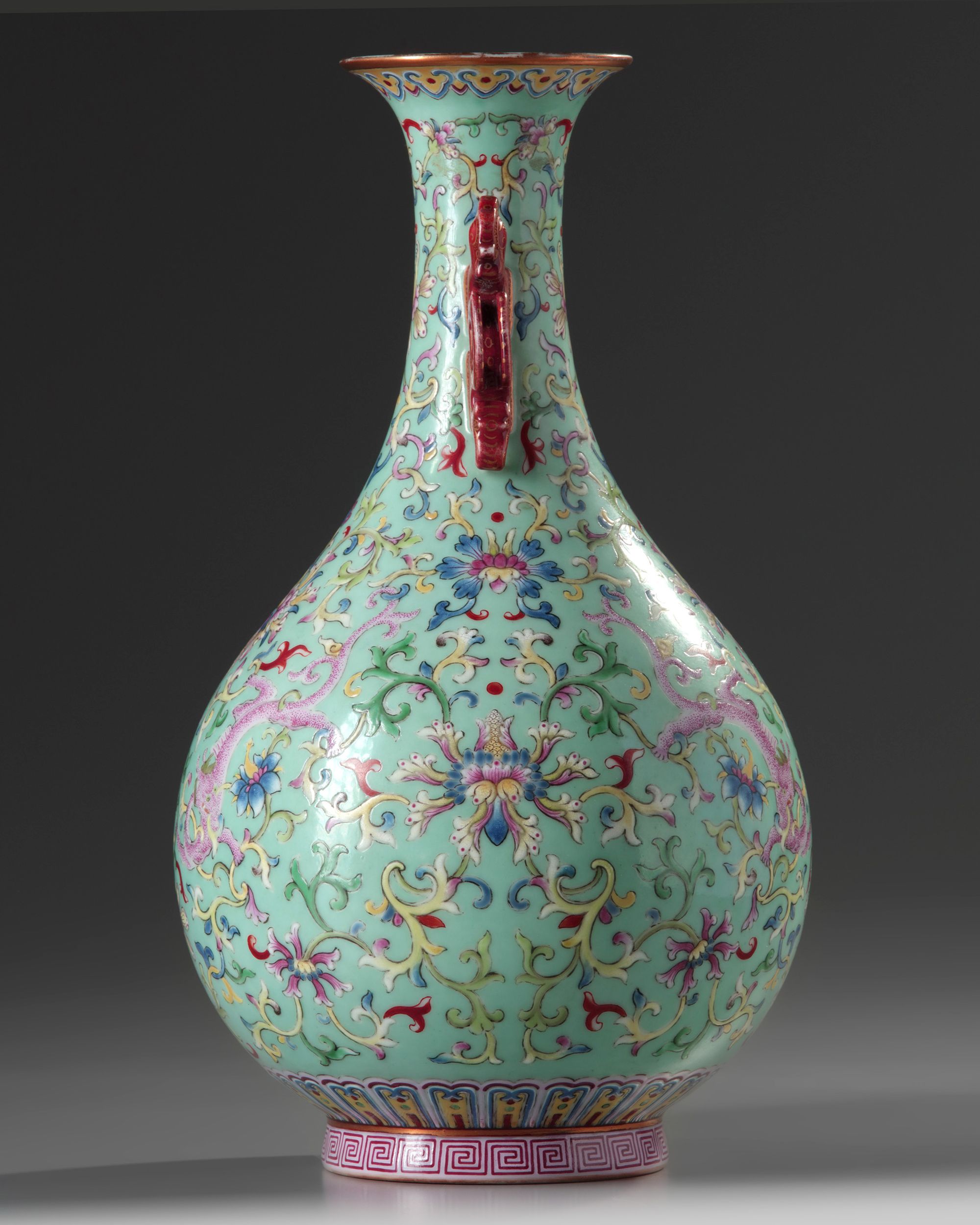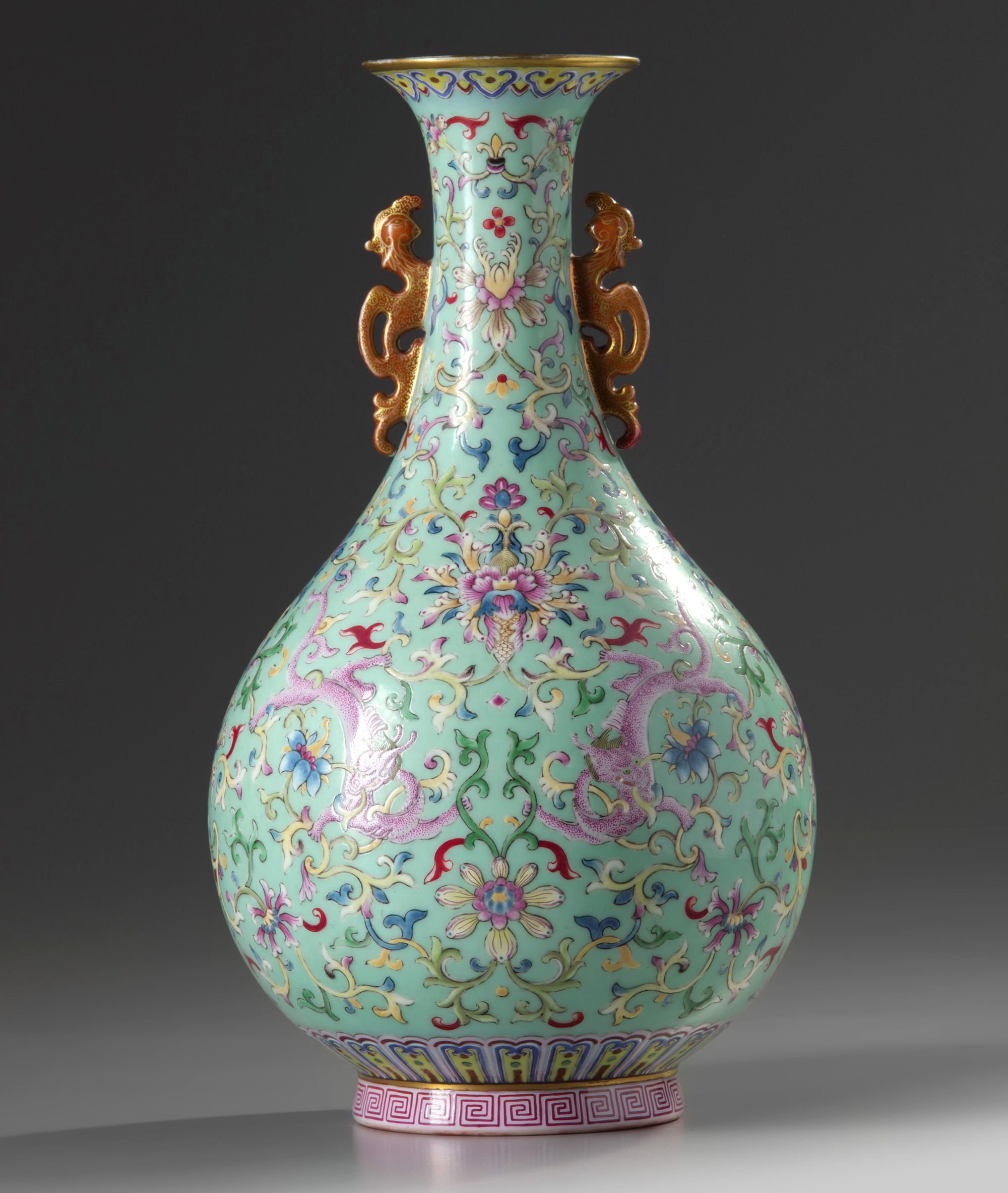 The pear-shaped vase is decorated with two moulded iron red and gilt phoenix handles to the neck and to the body with two dragons each clasping a foliage tendril amongst large scrolling lotus, all below a ruyi head band to the rim and a lappet band and key fret band at the foot. The interior and base are glazed turquoise.