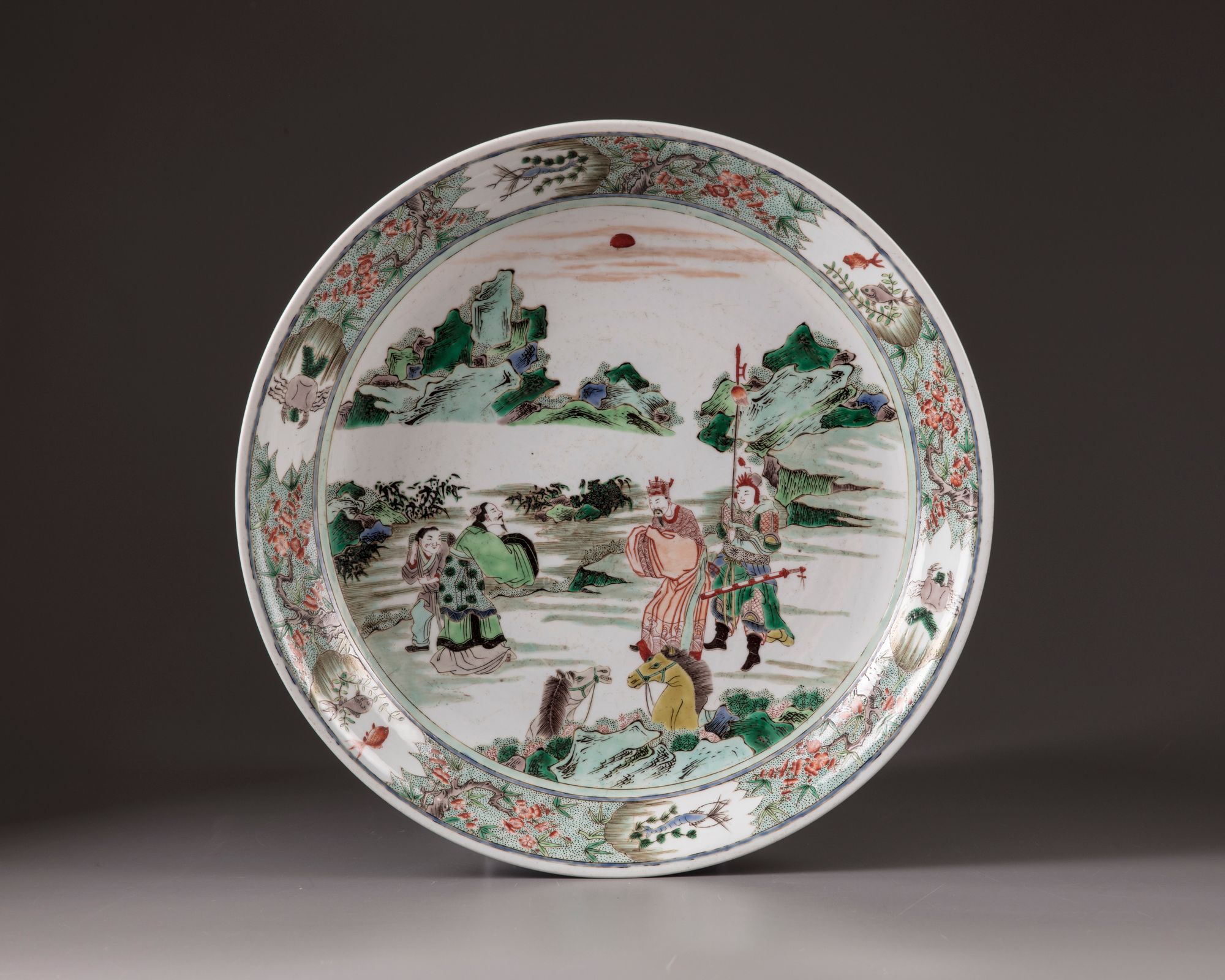 Decorated with a dignitary, welcomed by another figure with a warrior and a servant in a rocky landscape, with a diaper band containing cartouches of sea animals and flowering branches.
