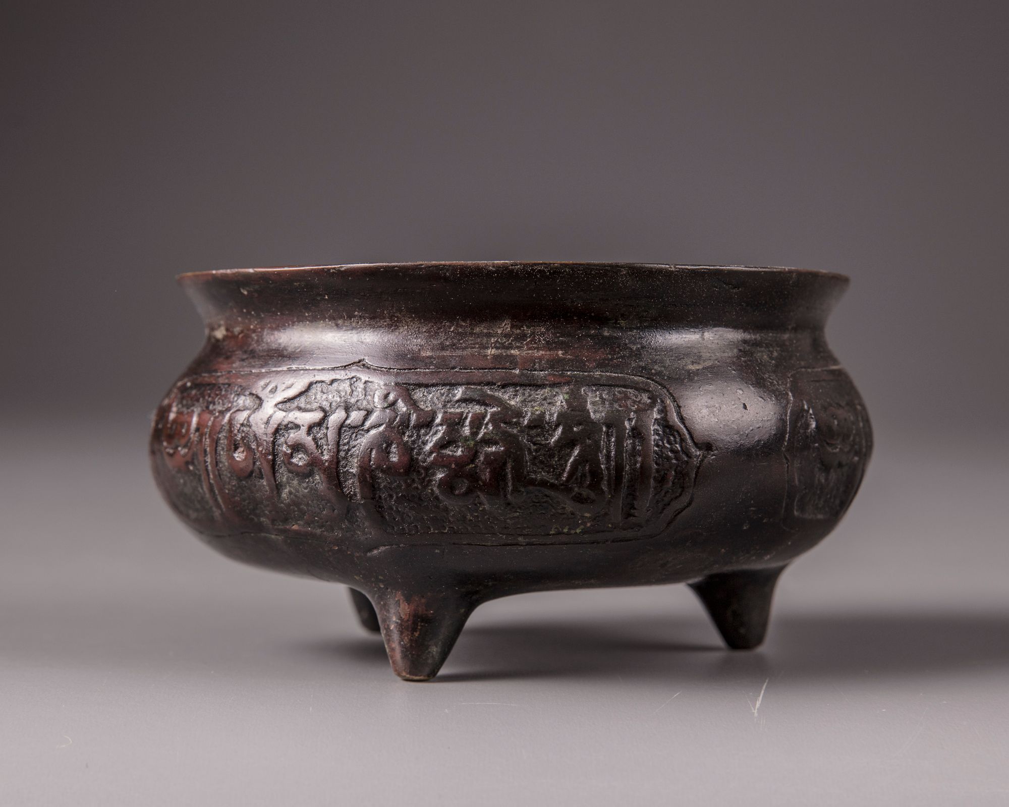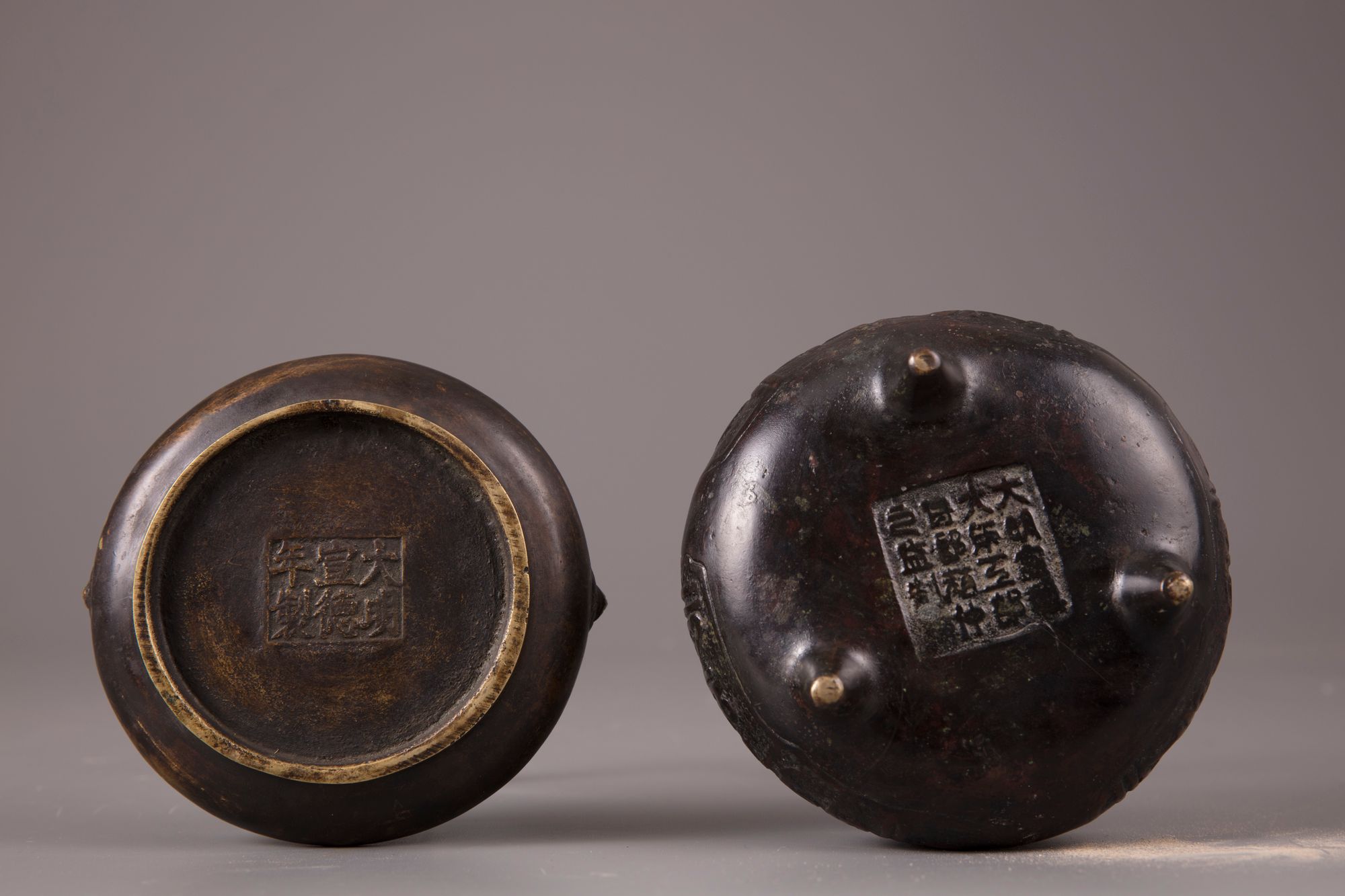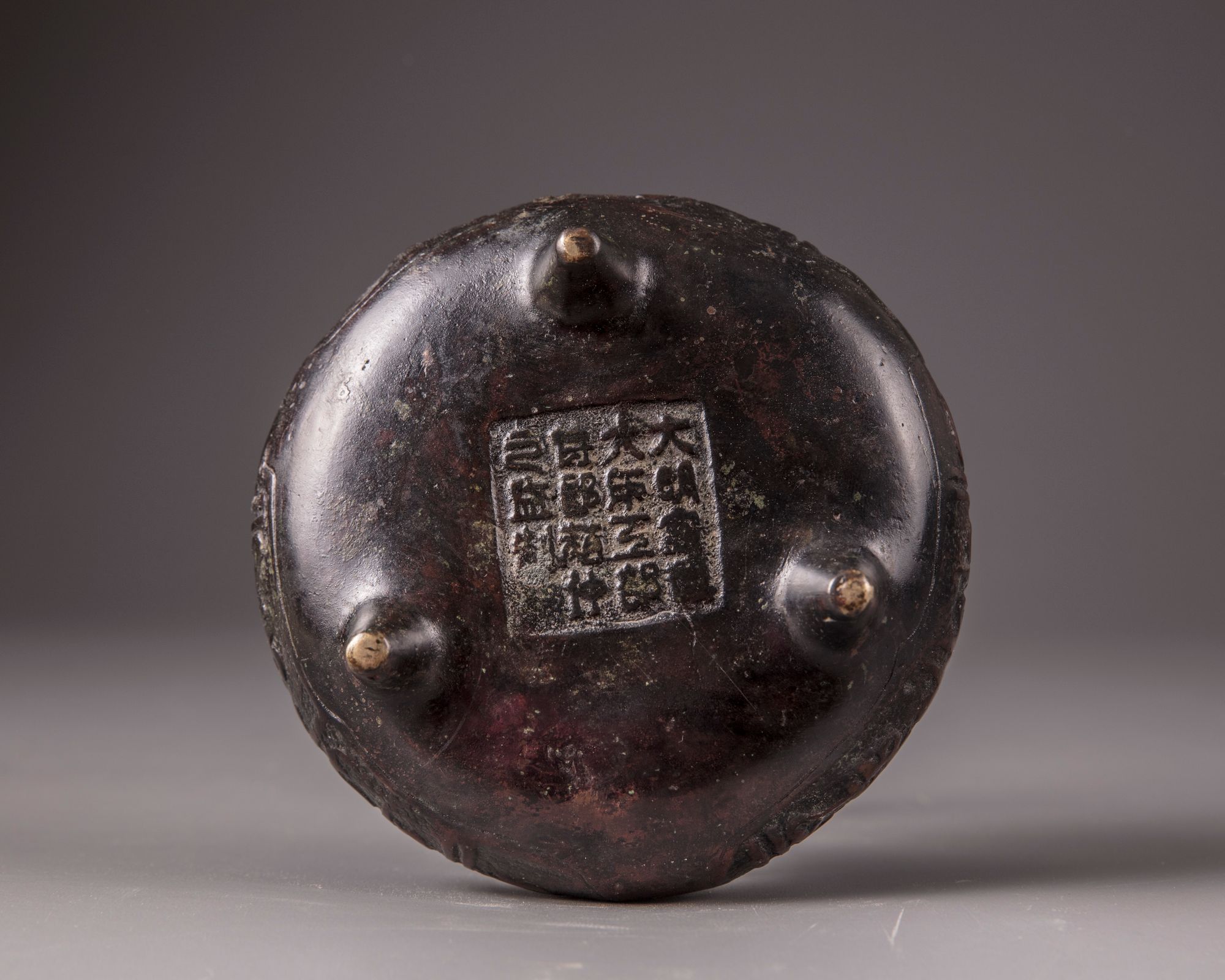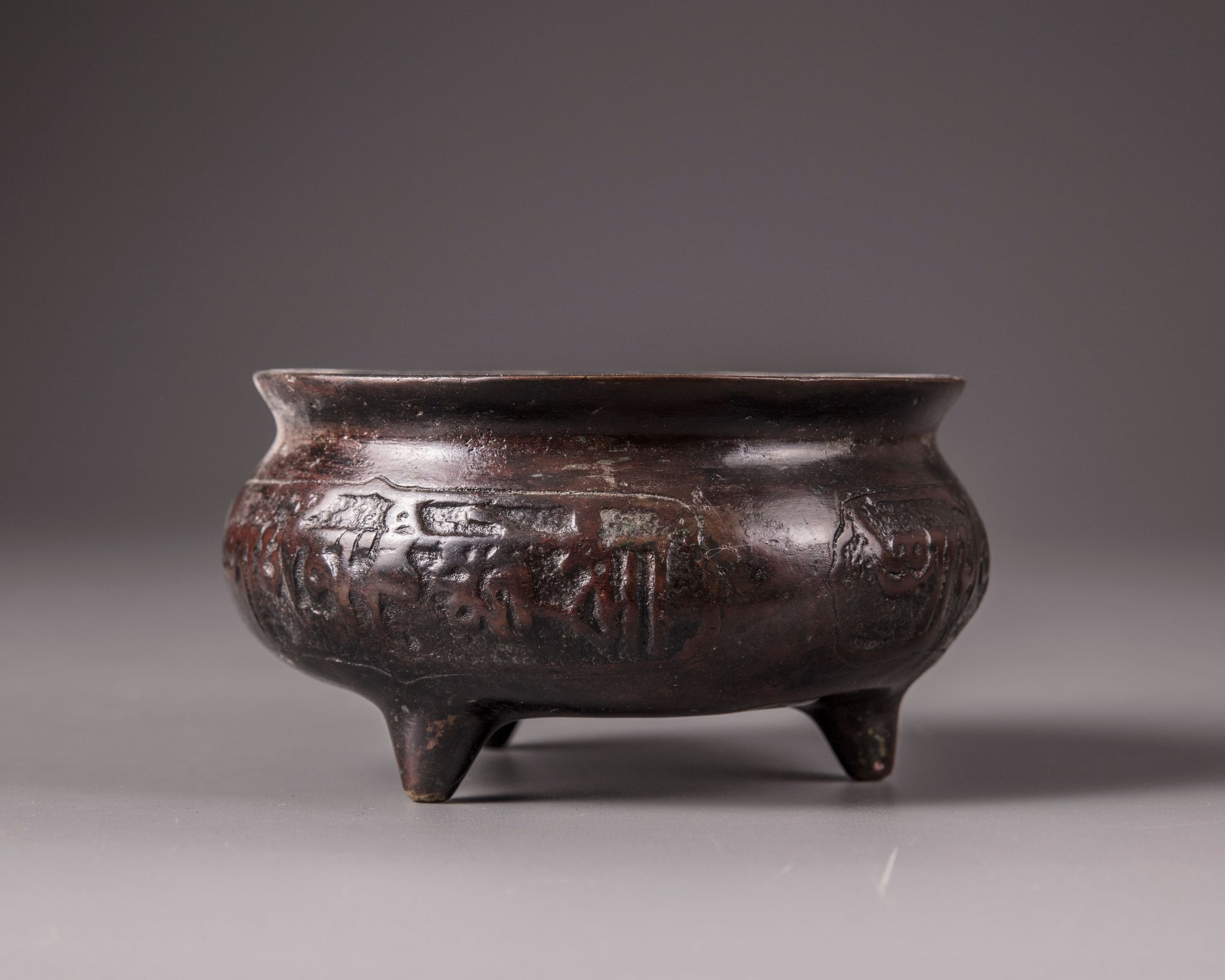 Standing on small three feet and everted rim, decorated with carved panels containing Chinese calligraphy. With carved Chinese characters to the bottom. The bronze censer is decorated with two Fu lion head shaped handles. With a Xuande six character mark to the bottom.height 5 cm, the diaper: 10.5 cm.