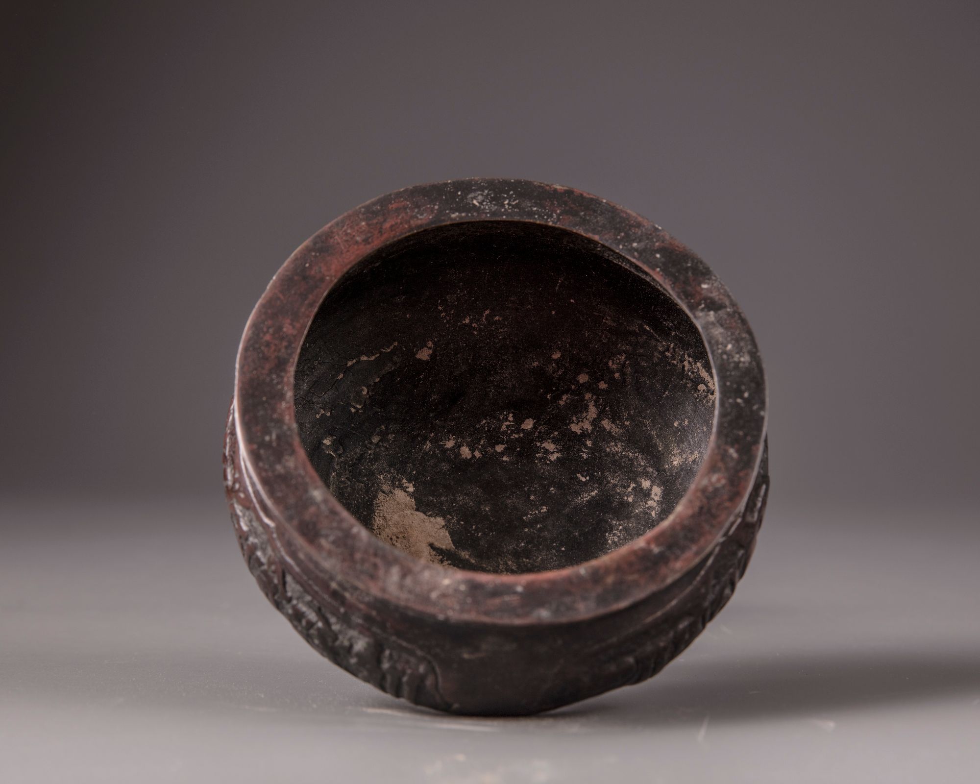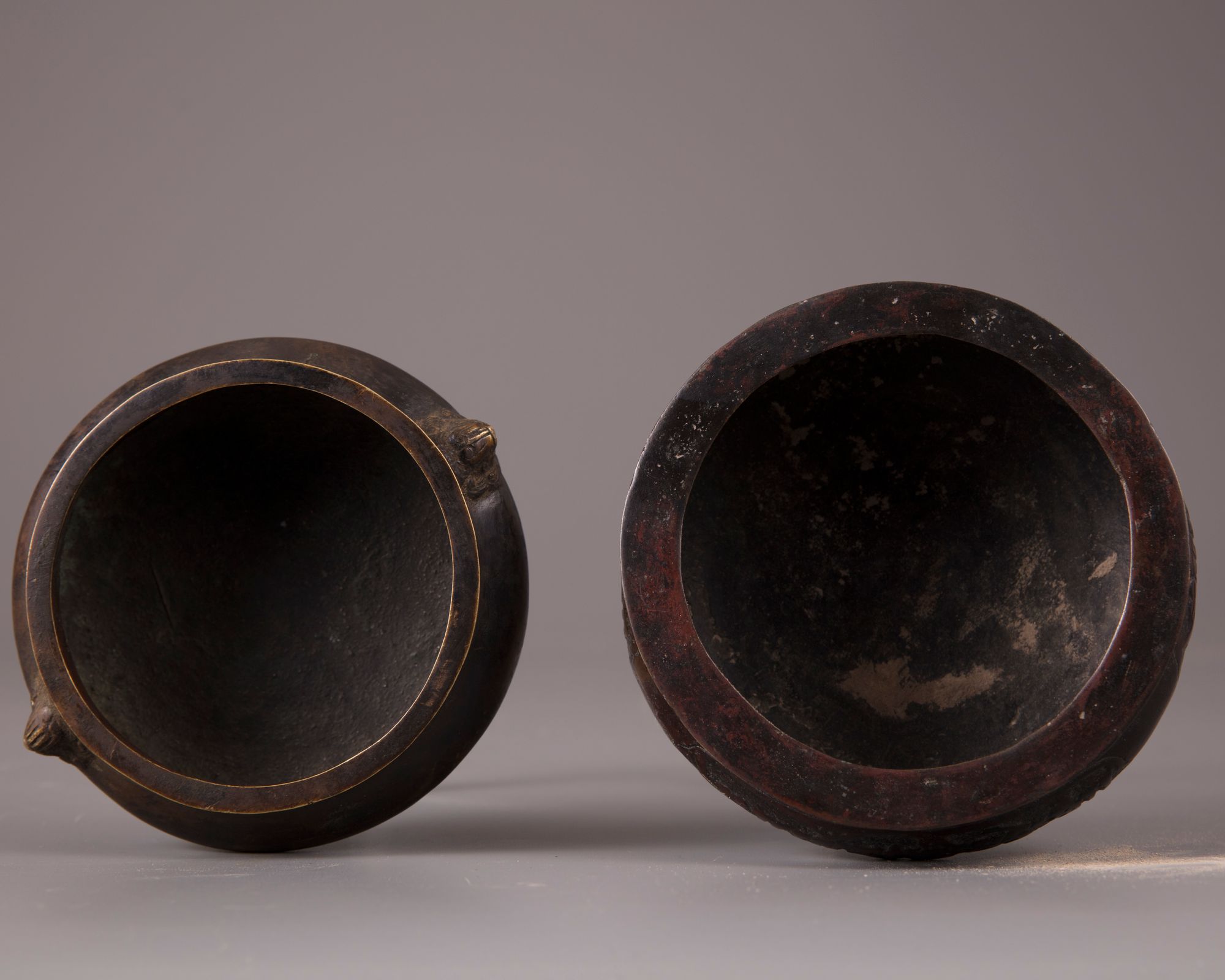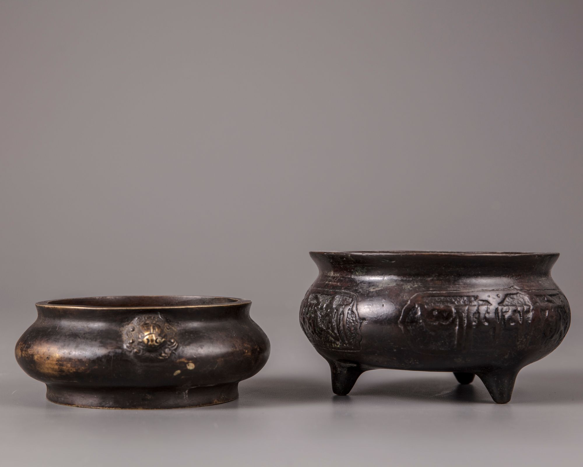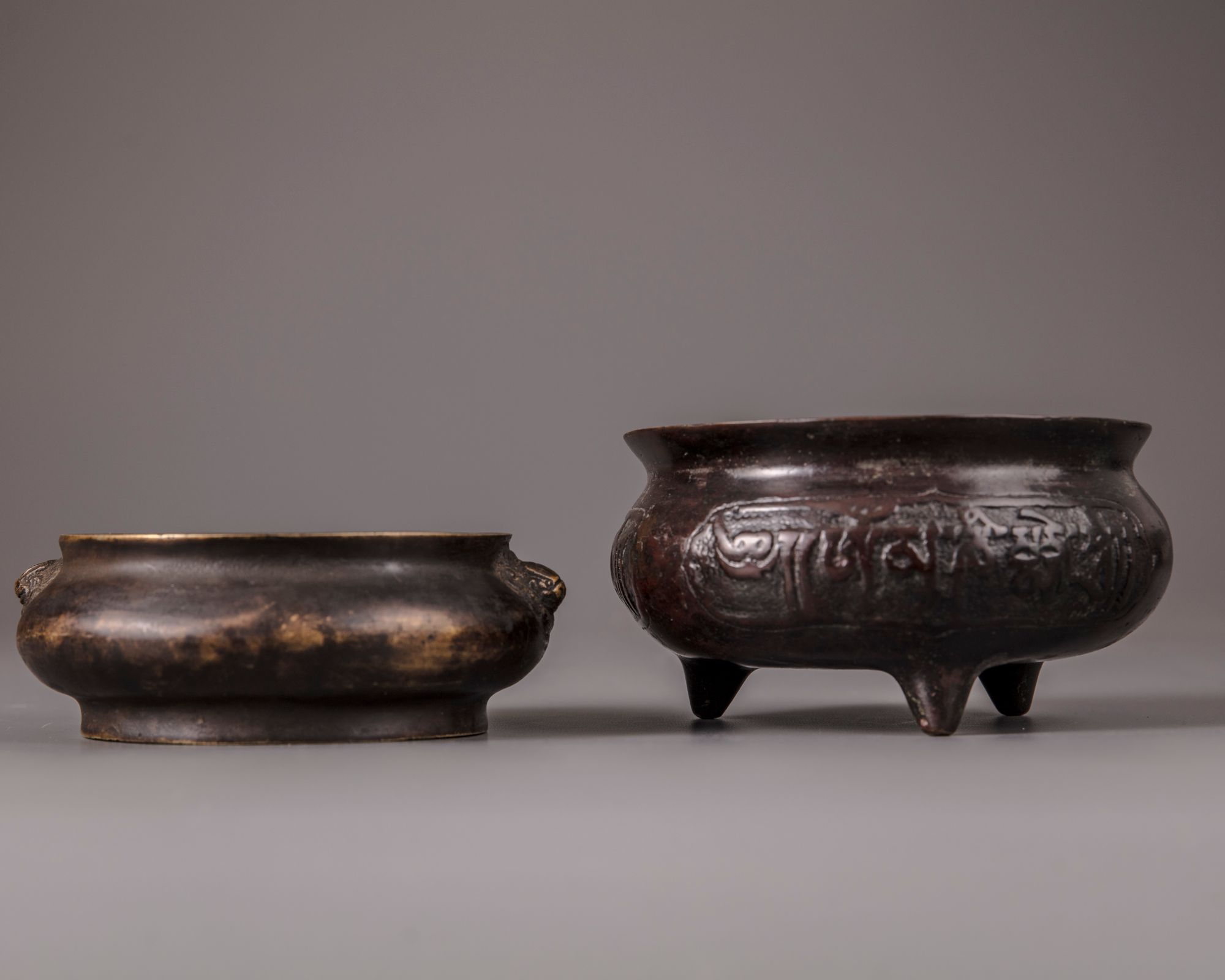 Standing on small three feet and everted rim, decorated with carved panels containing Chinese calligraphy. With carved Chinese characters to the bottom. The bronze censer is decorated with two Fu lion head shaped handles. With a Xuande six character mark to the bottom.height 5 cm, the diaper: 10.5 cm.