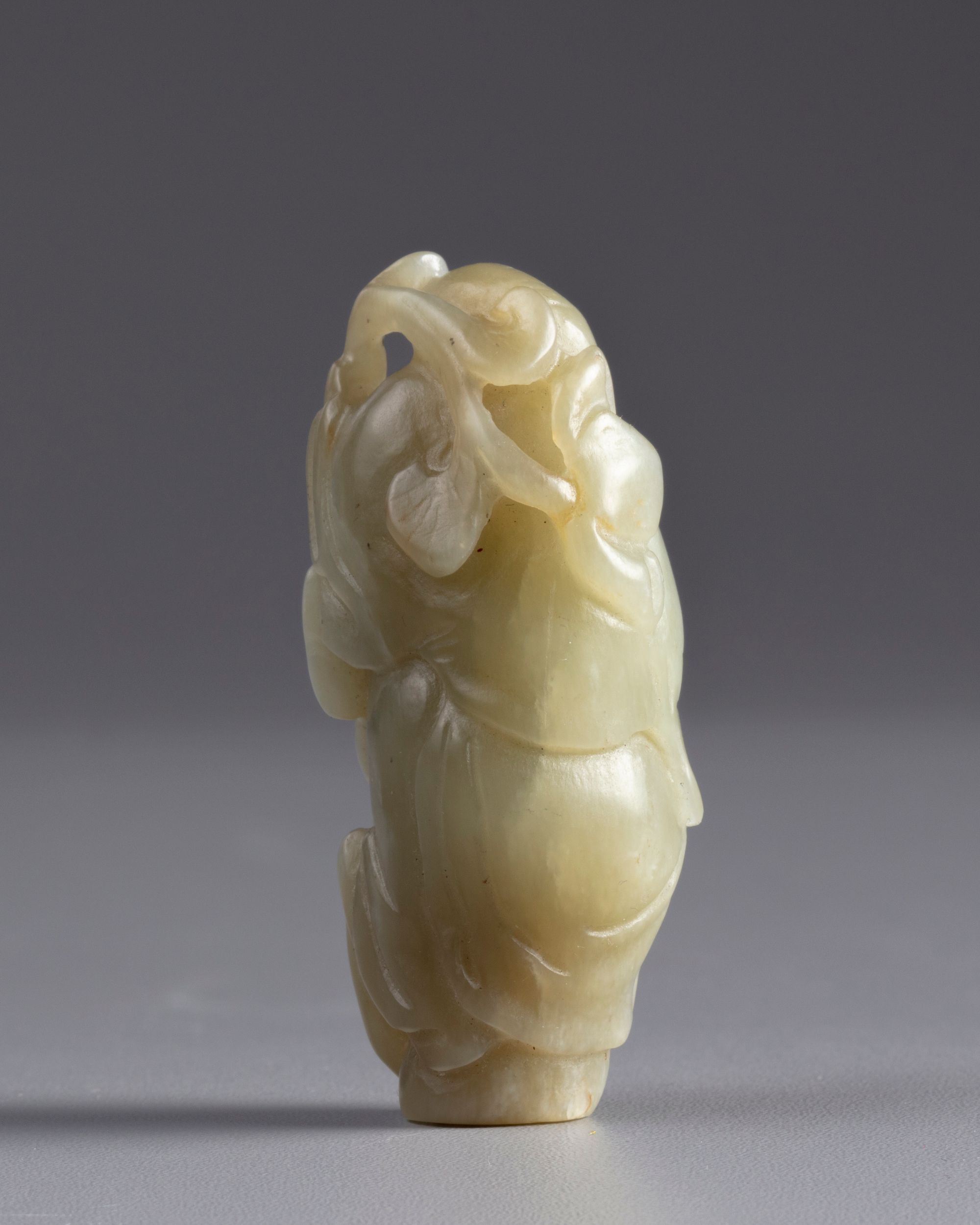 A Chinese pale celadon jade 'boy and lingzhi' carving A Chinese pale celadon jade 'boy and lingzhi' carving