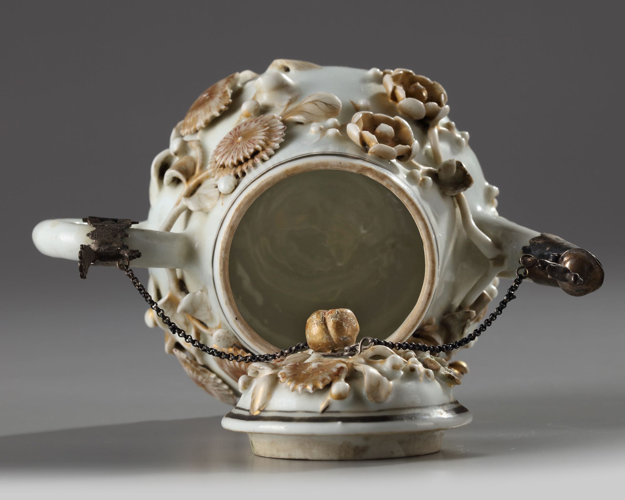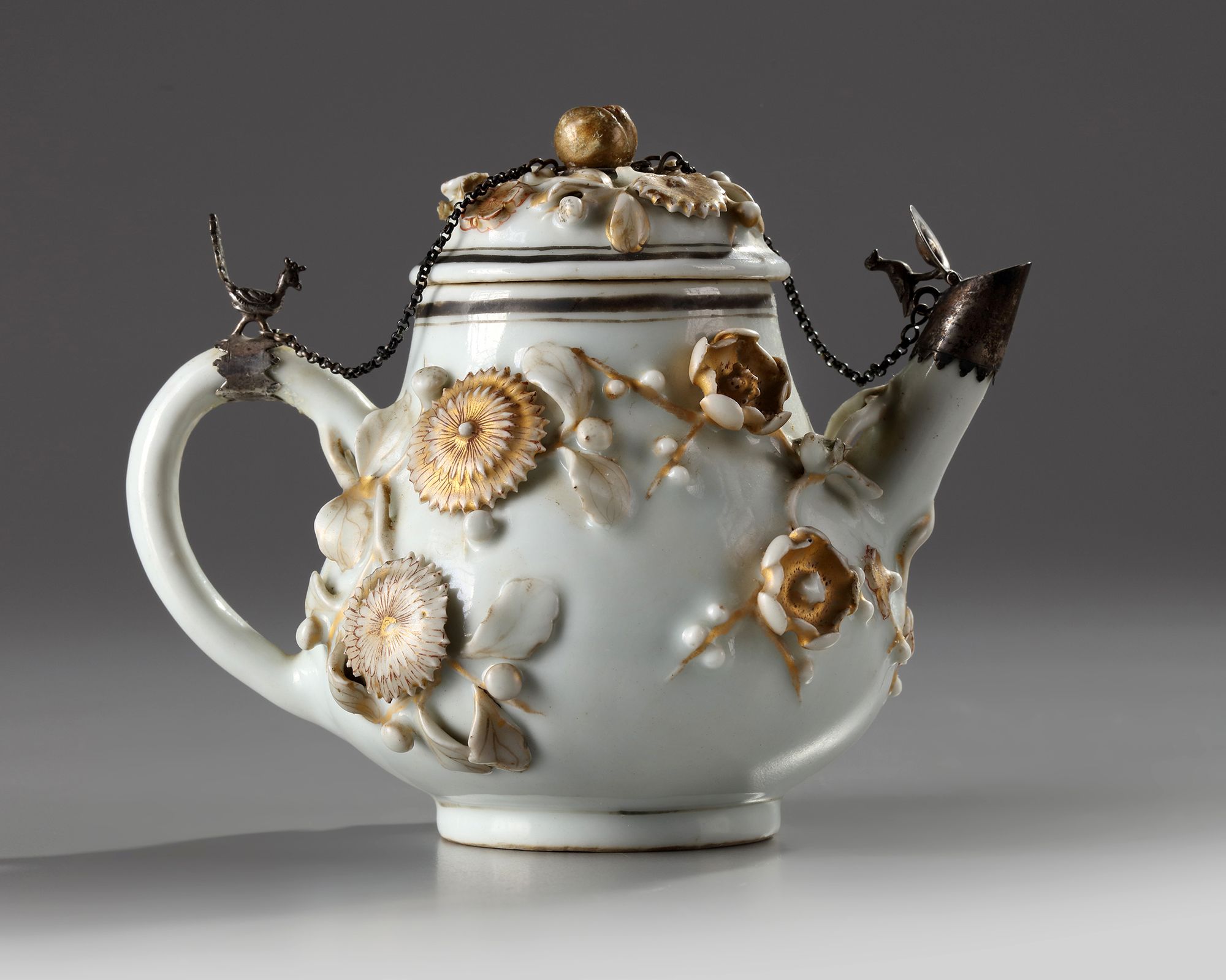 The teapot is decorated with moulded and applique chrysanthemum and prunus flowers growing on branches, decorated with gilding and iron-red enamels. The cover is similarly decorated. The handle, spout, and finial are mounted in silver decorated with birds. 12 by 15.3 cm.