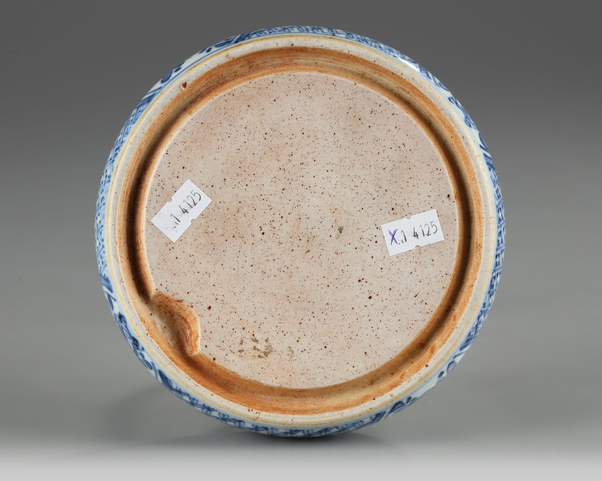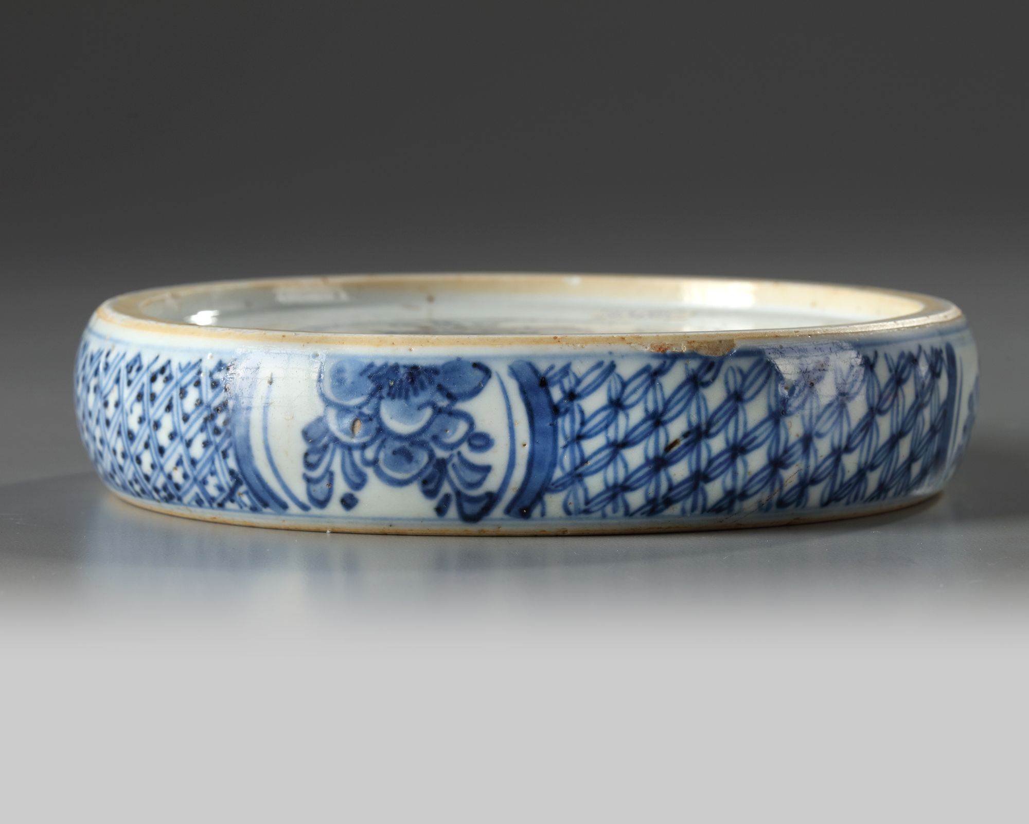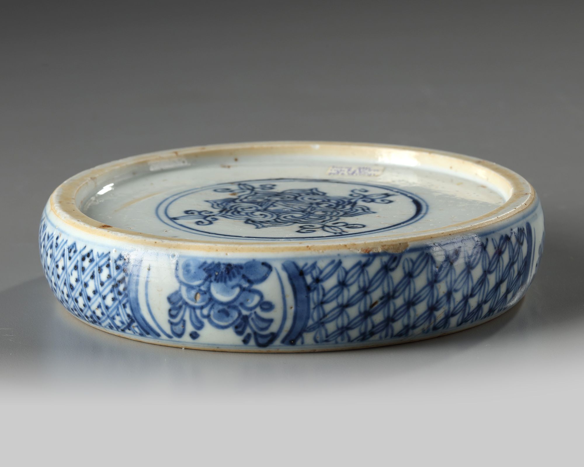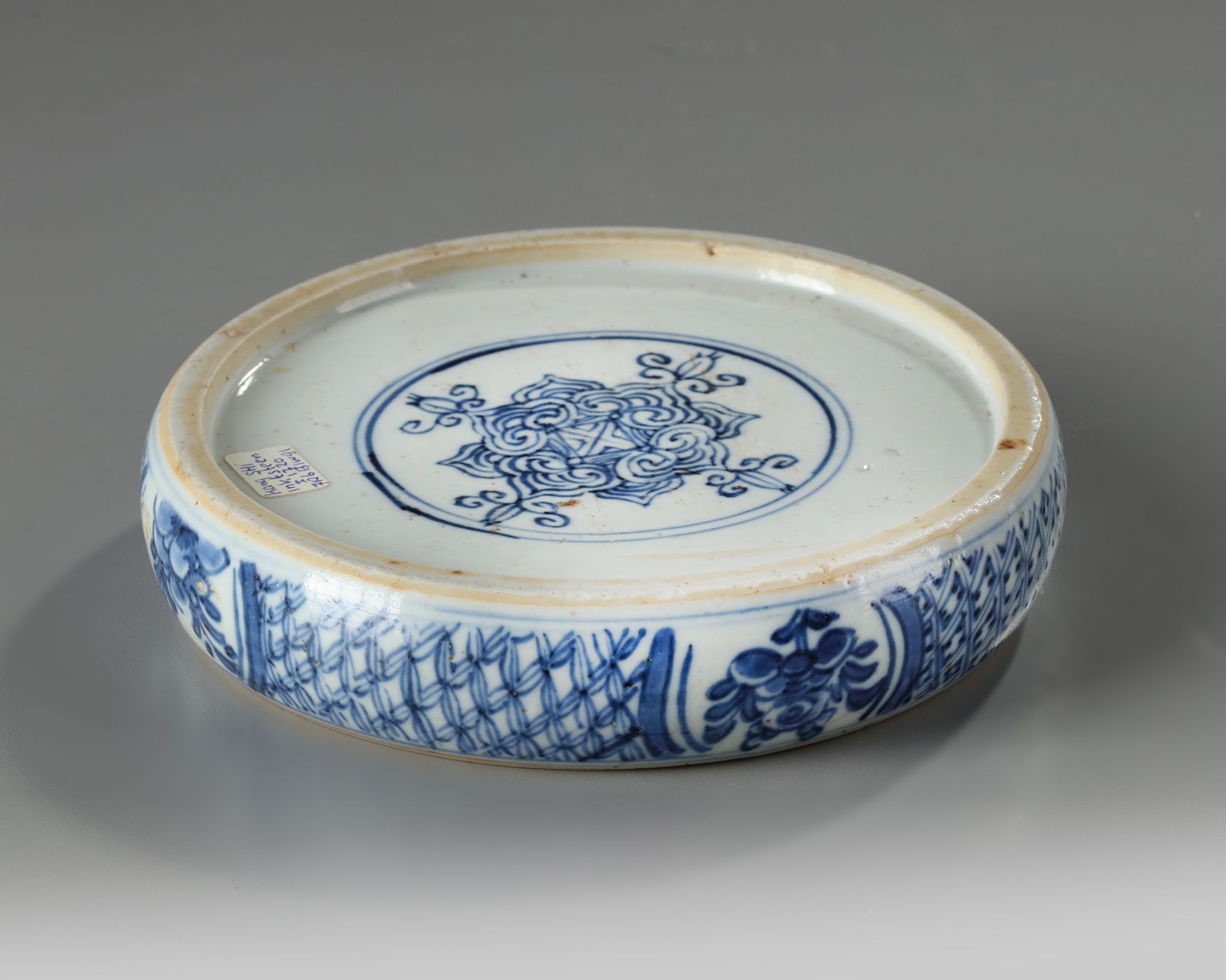 Squat circular form, the sides decorated with four floral cartouches reserved on an alternating trellis and diaper ground. The upper surface is left unglazed with a channelled well for water, and the base is glazed and decorated a four-pointed ruyi-design in a double circle.