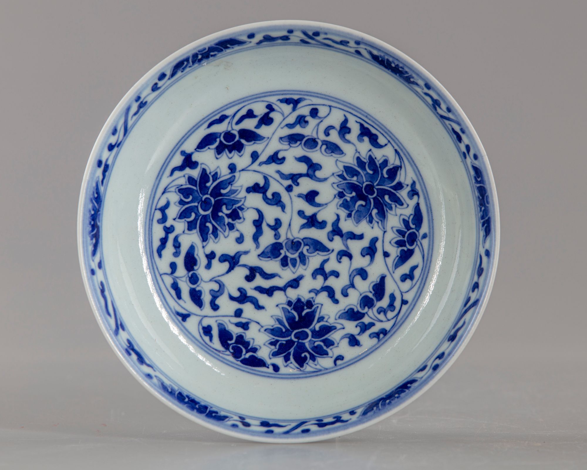 The dish is decorated with a central medallion of lotus meander below a band of demi-lotus sprays at the rim, and with a frieze of lotus scroll on the exterior.