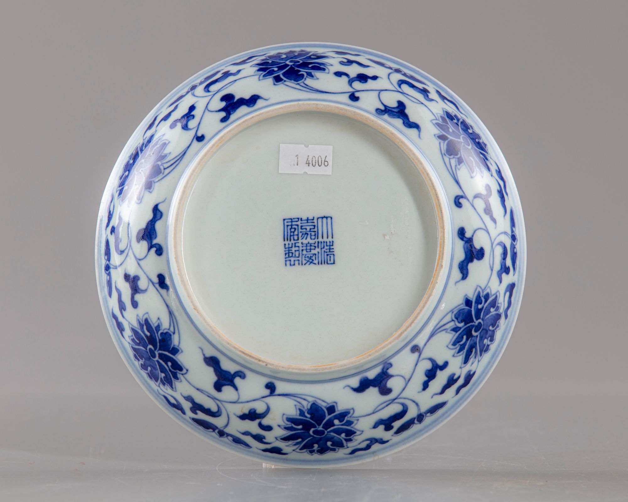 A CHINESE BLUE AND WHITE 'LOTUS' DISH, JIAQING SEAL MARK, 20TH CENTURY