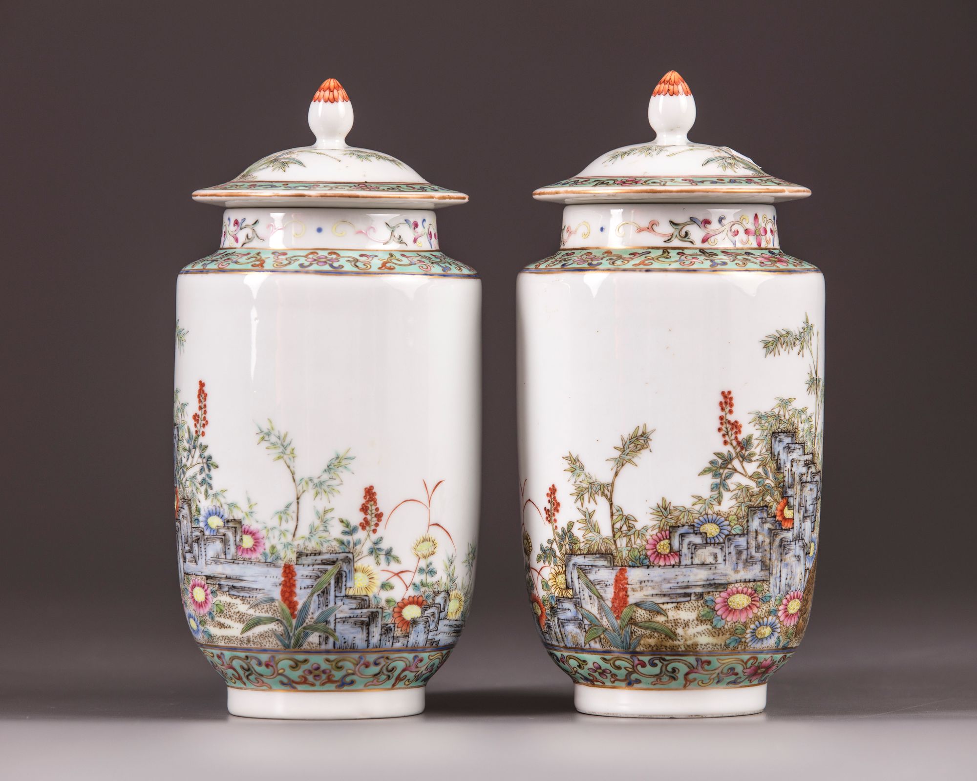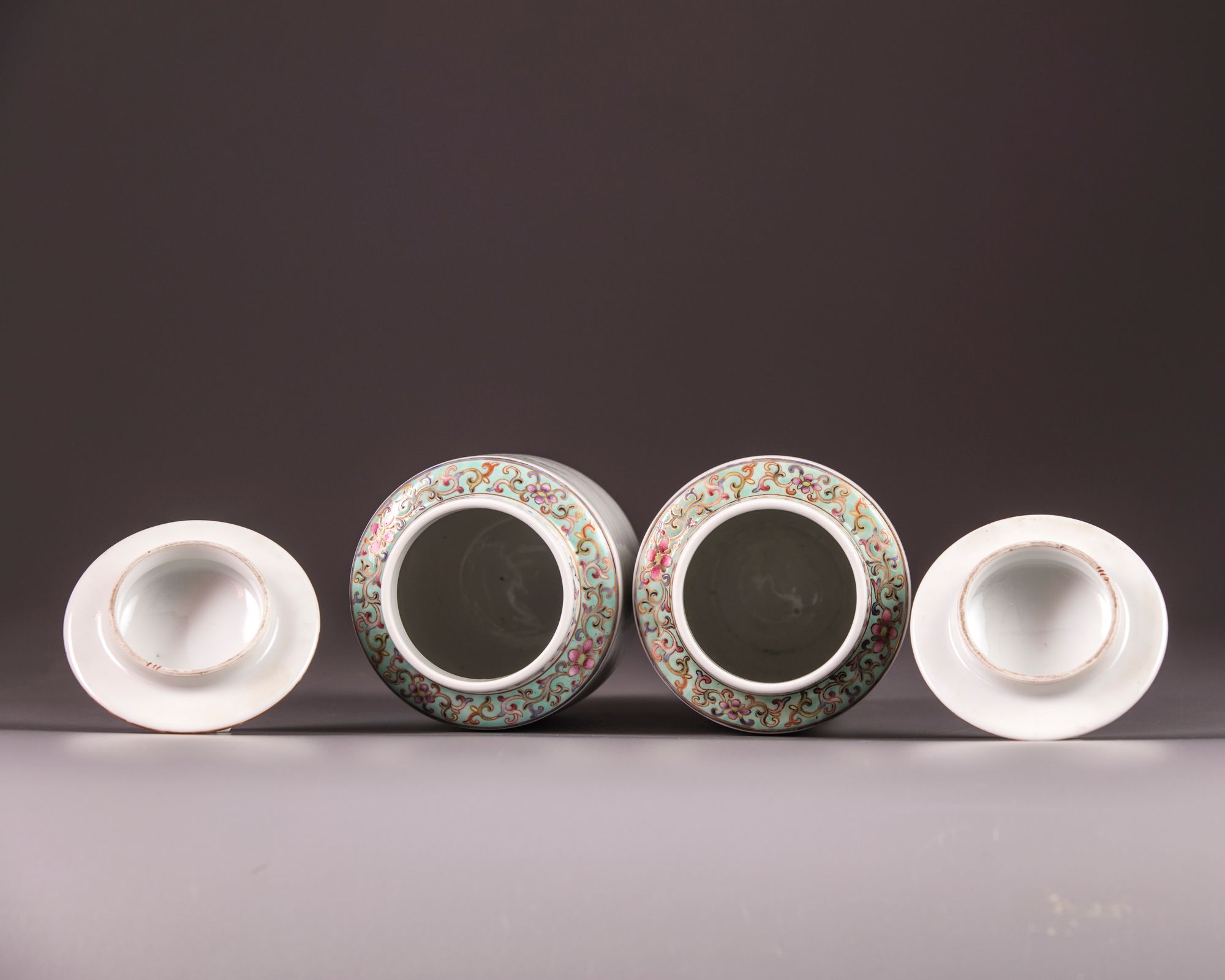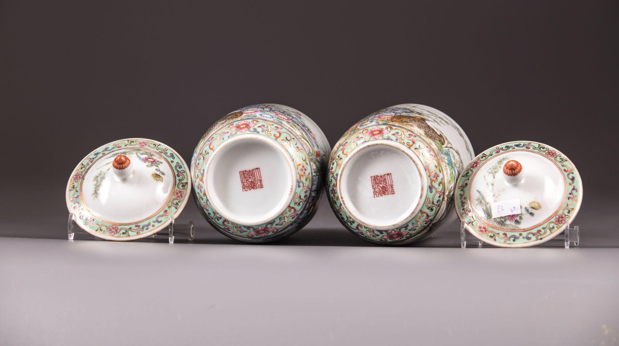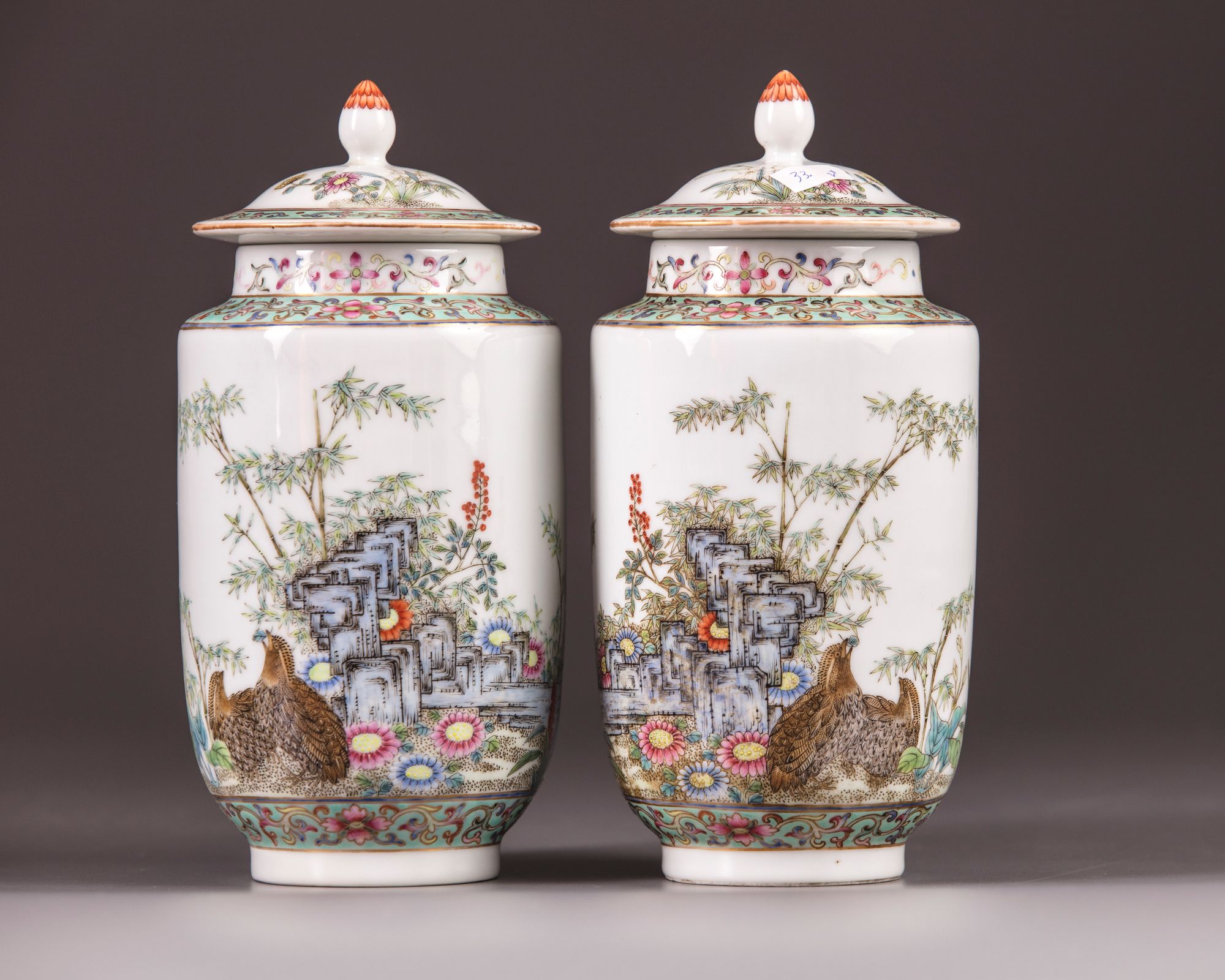 The vases with domed covers decorated in mirror image with two quails amongst bamboo and flowers, all set between flower scrolls.