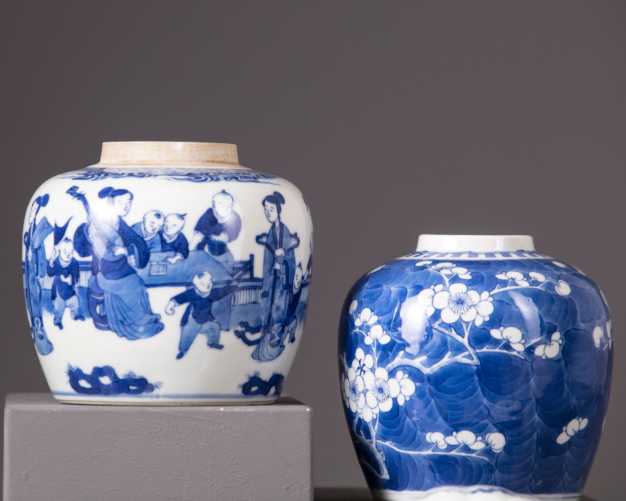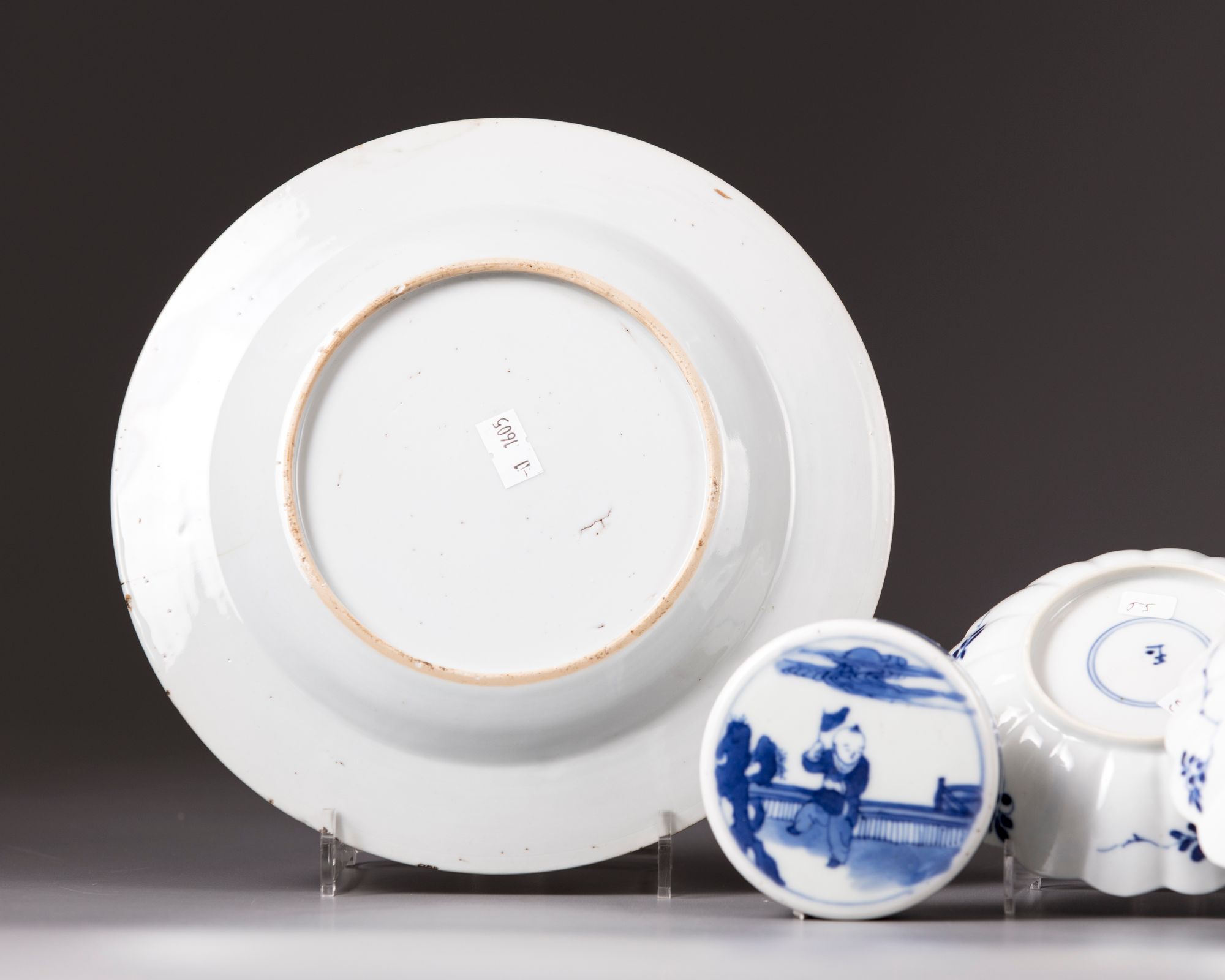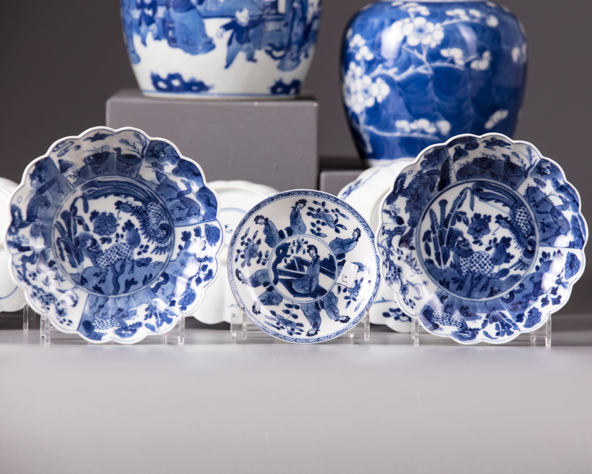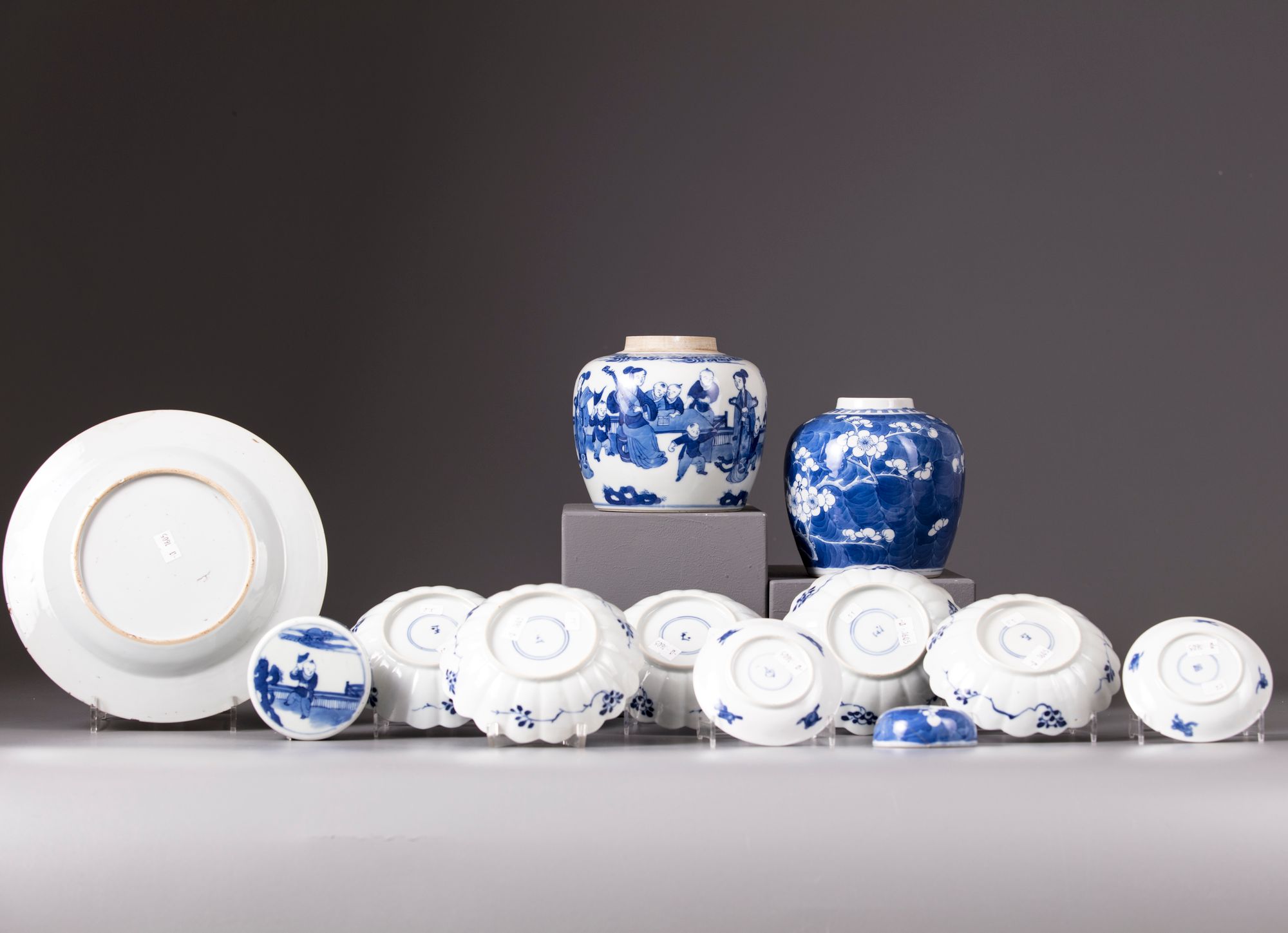 Consisting of Five lobed small dishes of 13,5 cm, decorated to the center with a Fu-lion and a peacock, to the sides with alternating scene of different animals and flowers. Two small saucers of 10 cm, decorated with alternating lady to the center and the sides. Two pots of 15 cm, with covers decorated with a continuous scene of a lady playing music with boys and flowering branches. A famille rose dish of 22.5 cm, decorated and gilt with two deer in a tree.