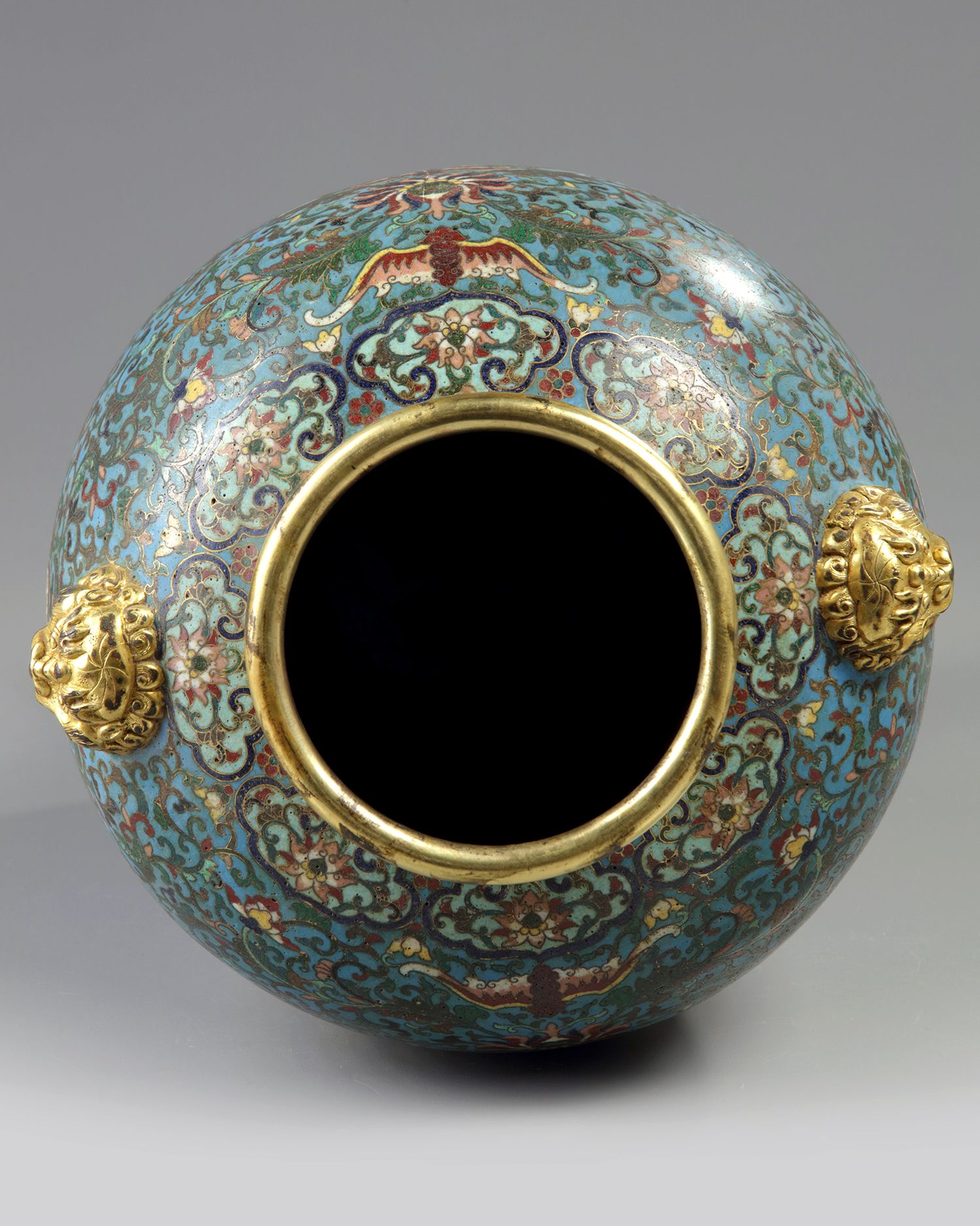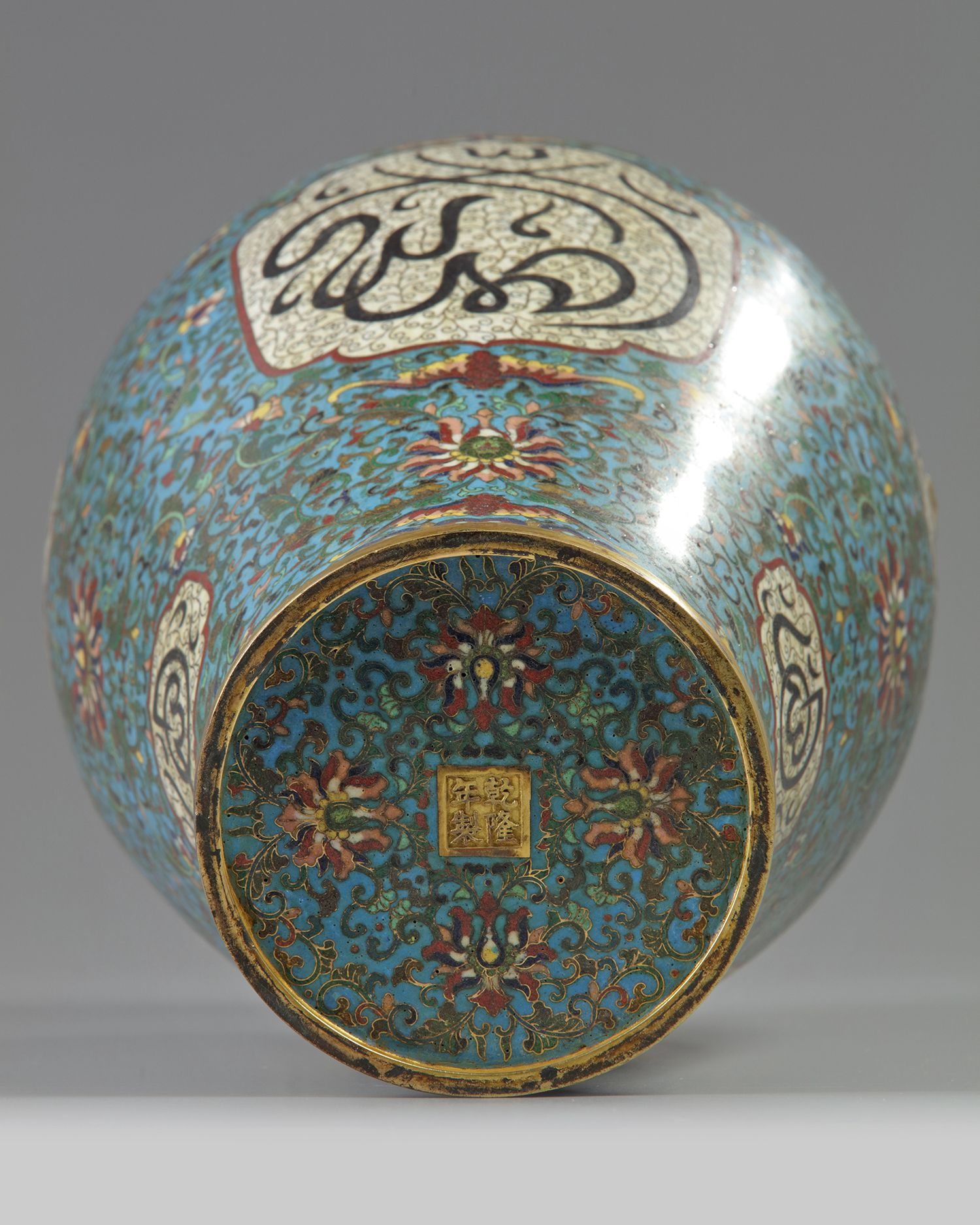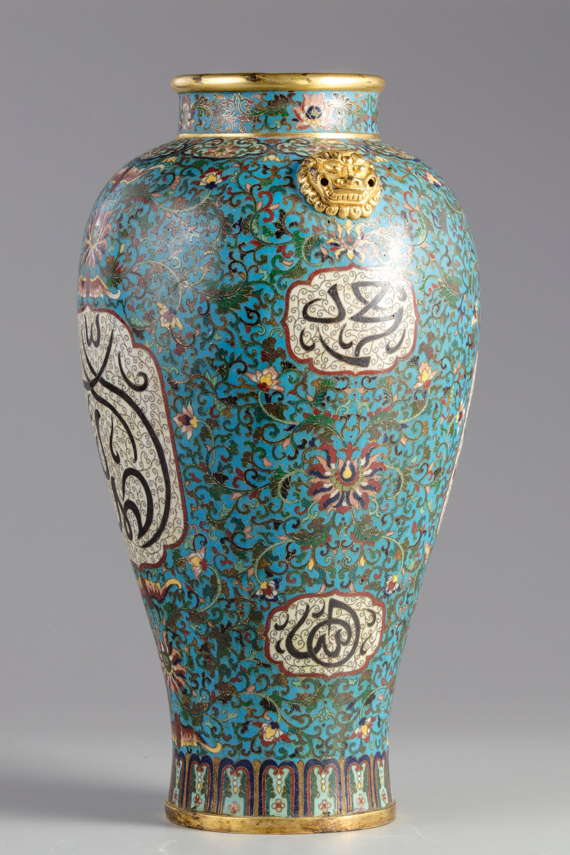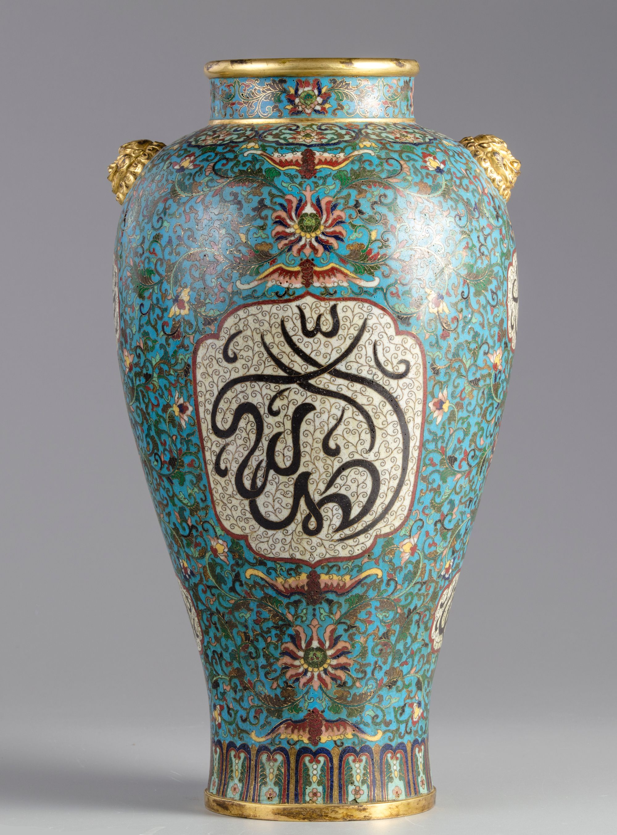 The high-shouldered vase is decorated with two Buddhist lion-mask gilt bronze handles, the body is decorated with shaped panels and cartouches enclosing Arabic script, all surrounded by bats and scrolling lotus. The foot is decorated with a lappet band and the rim with a ruyi-head band. The base with an apocryphal Qianlong mark.