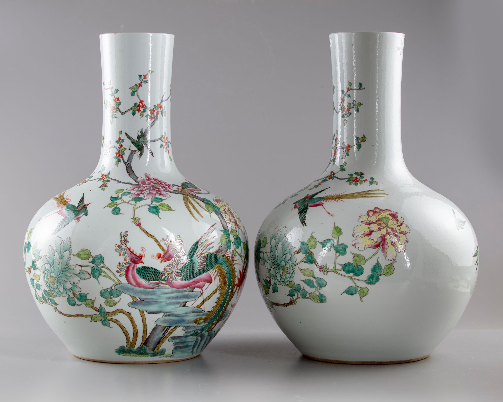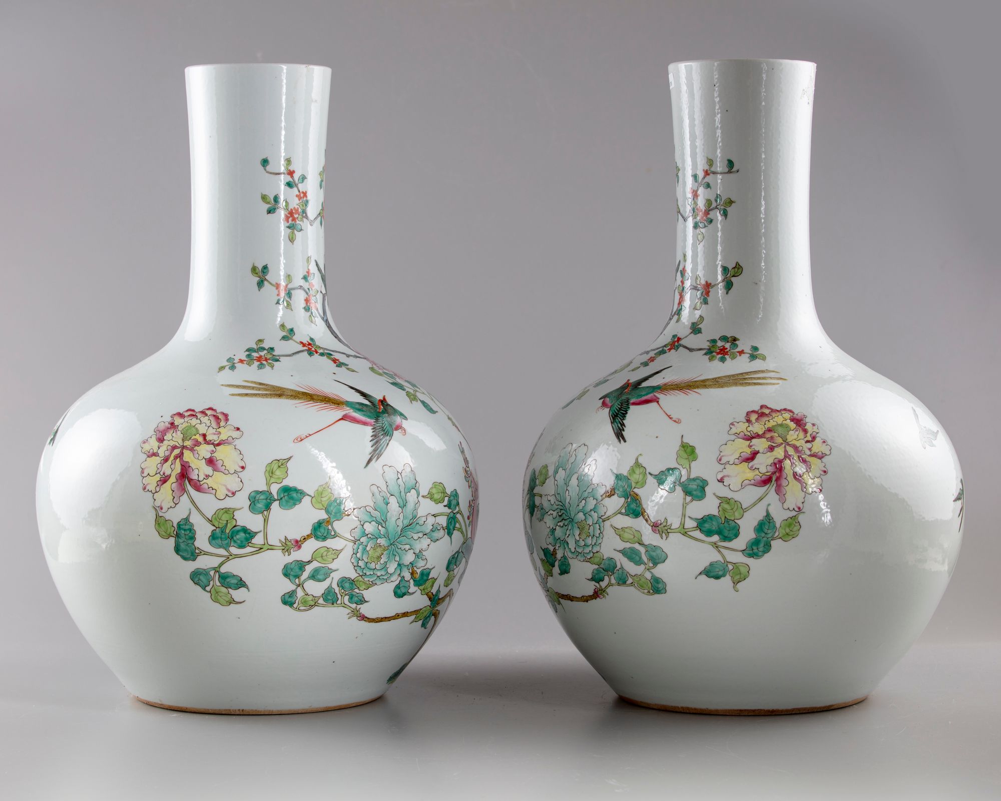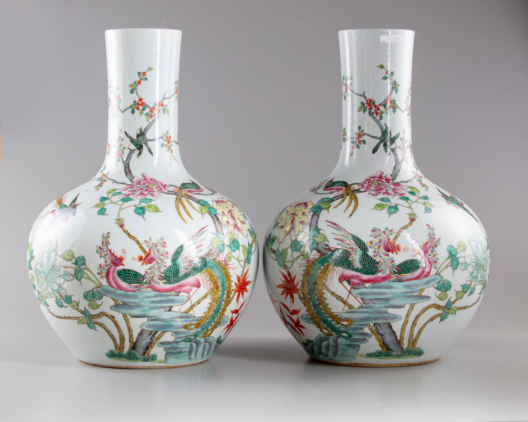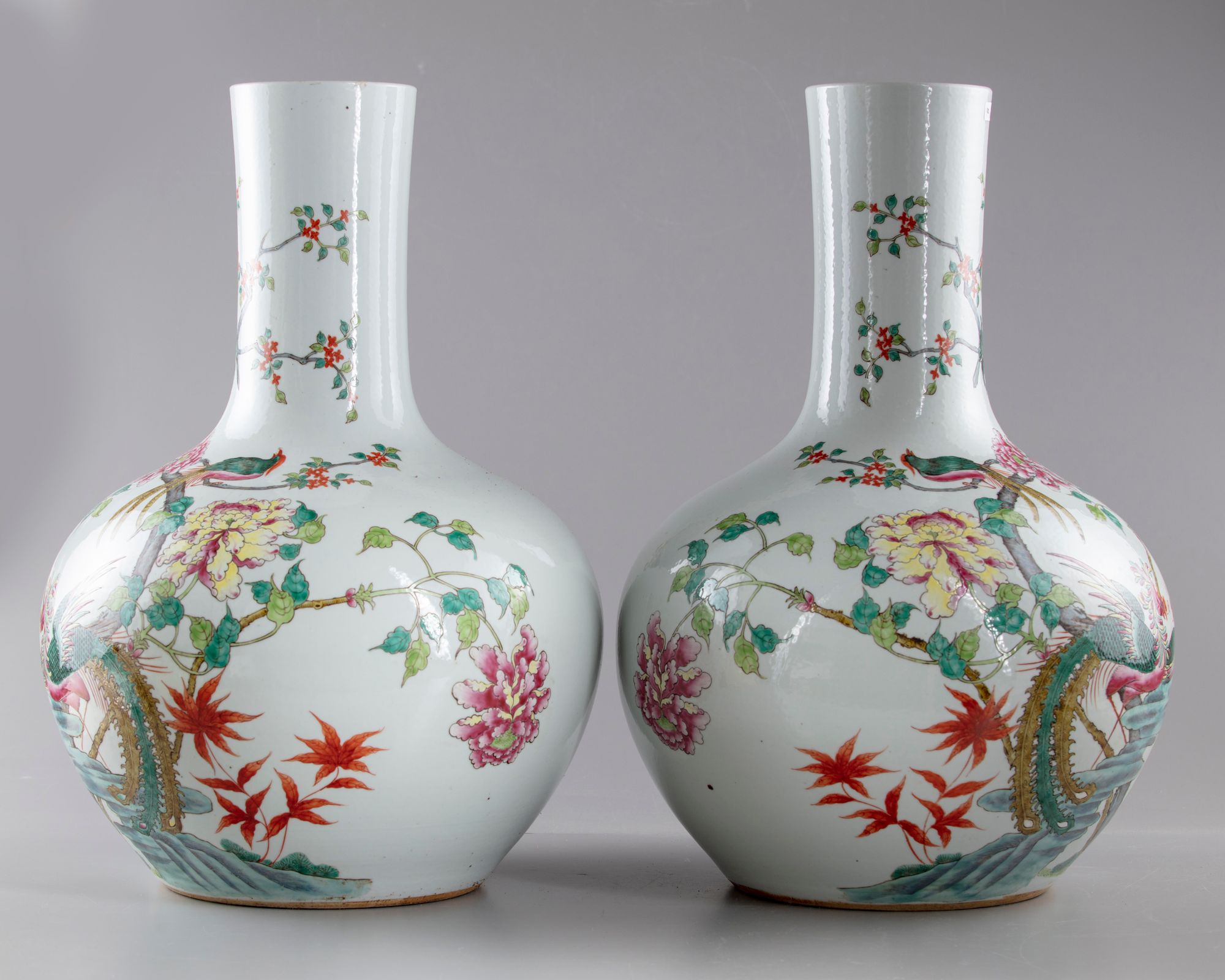 A PAIR OF LARGE CHINESE FAMILLE ROSE 'BIRDS AND FLOWERS' BOTTLE VASES, TIANQIUPING, 19TH-20TH CENTURY