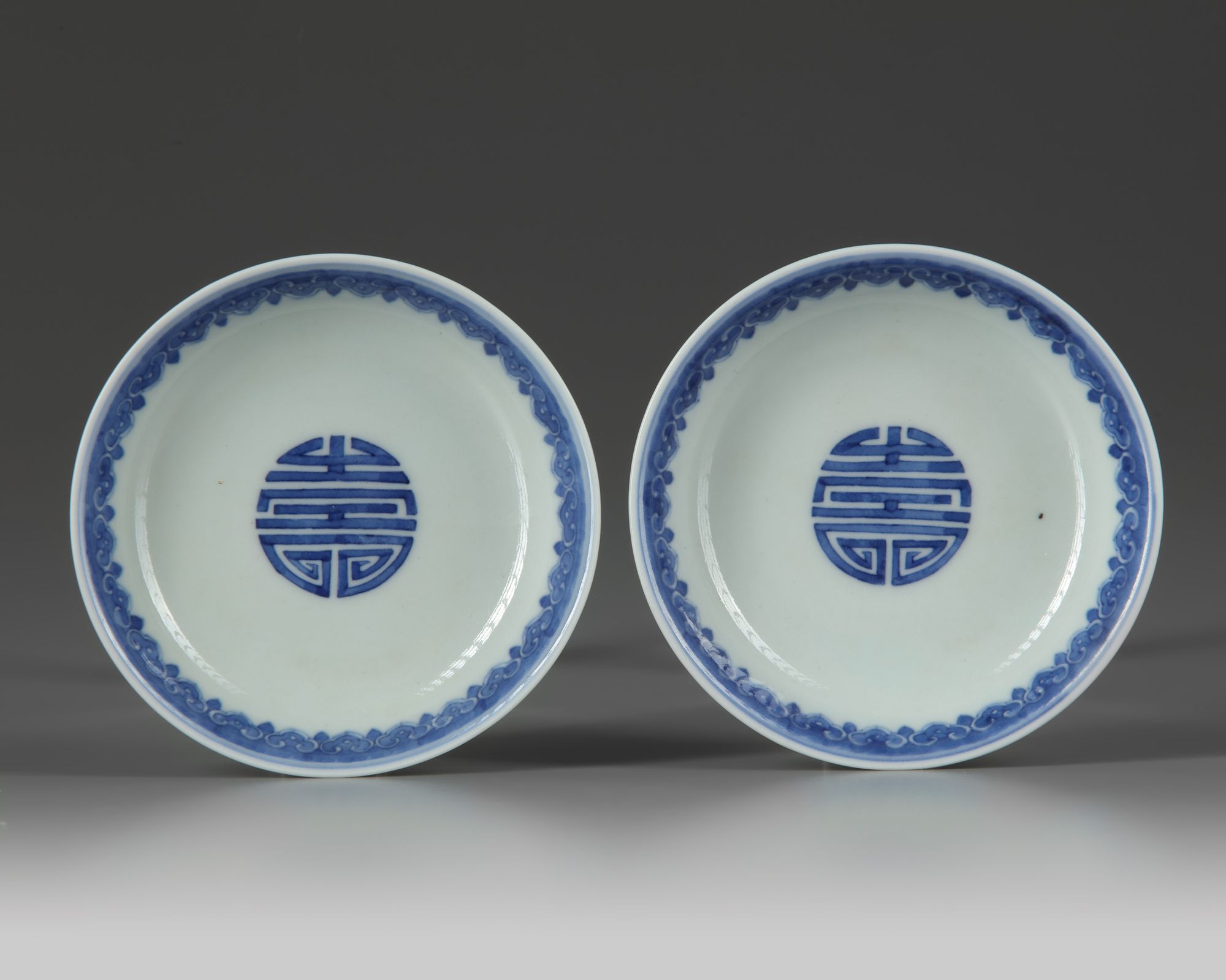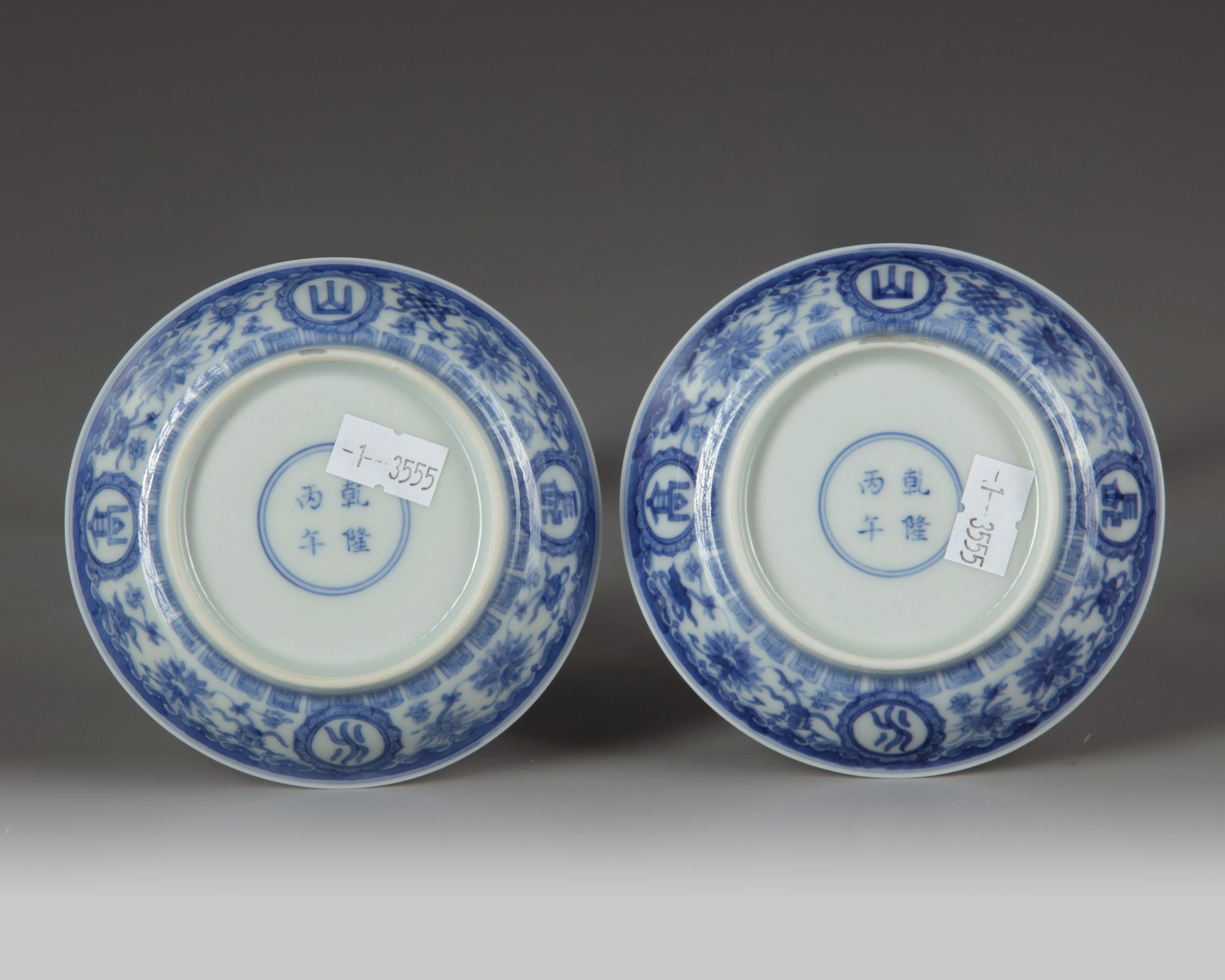 Each dish is decorated with a shou character roundel to the centre surrounded by a ruyi-head band. The exterior is decorated with four roundels enclosing the characters 'shan gao shui chang' (a wish for a noble reputation) interspersed with lotus sprays. The base with an apocrphal 'Qianlong bingwu' mark.
