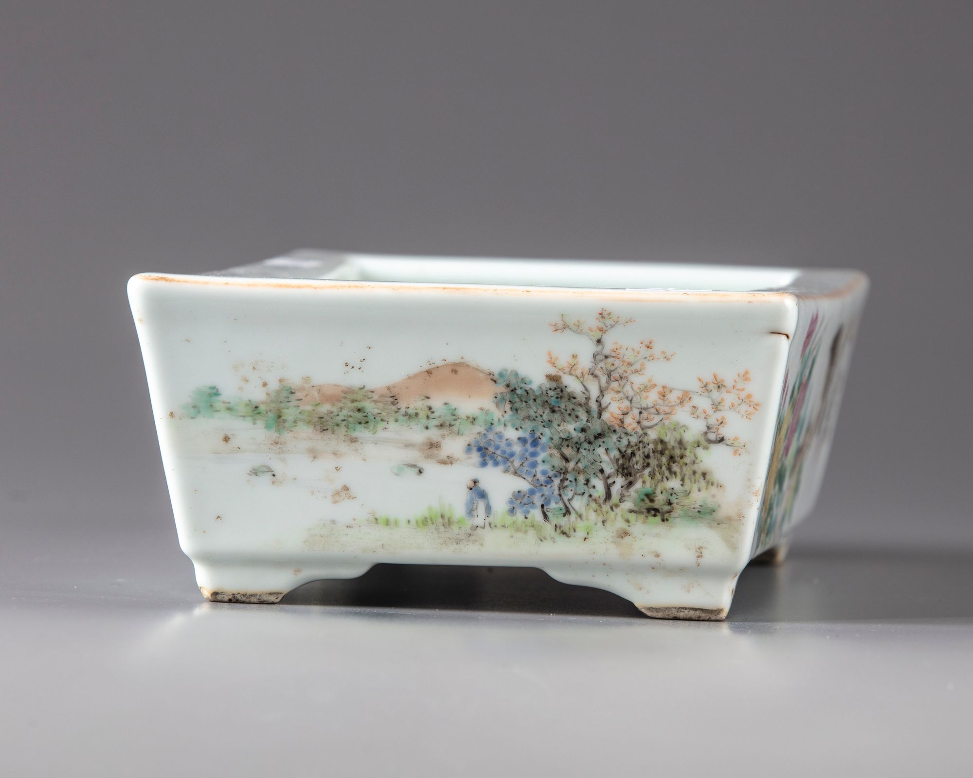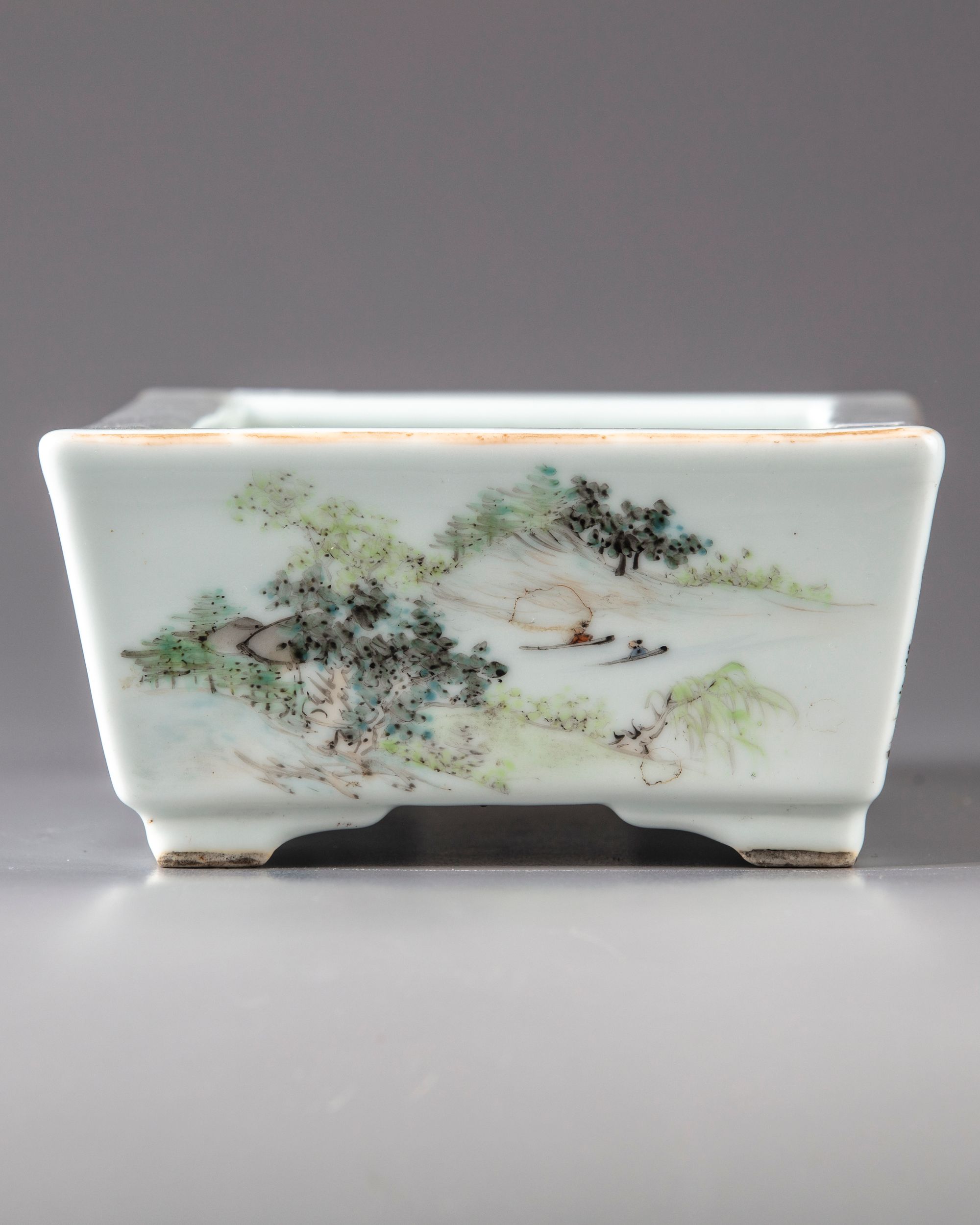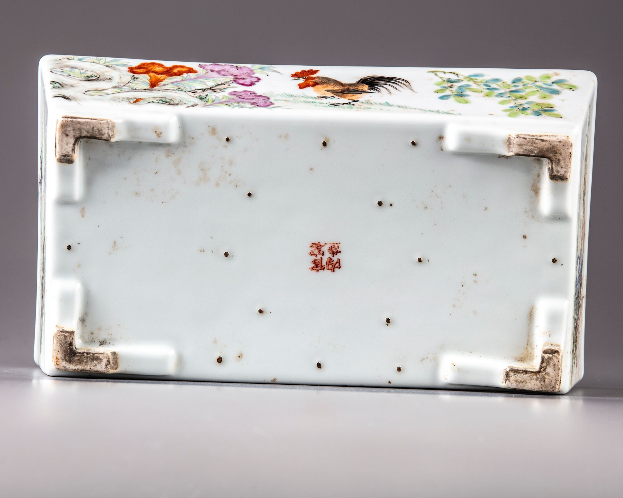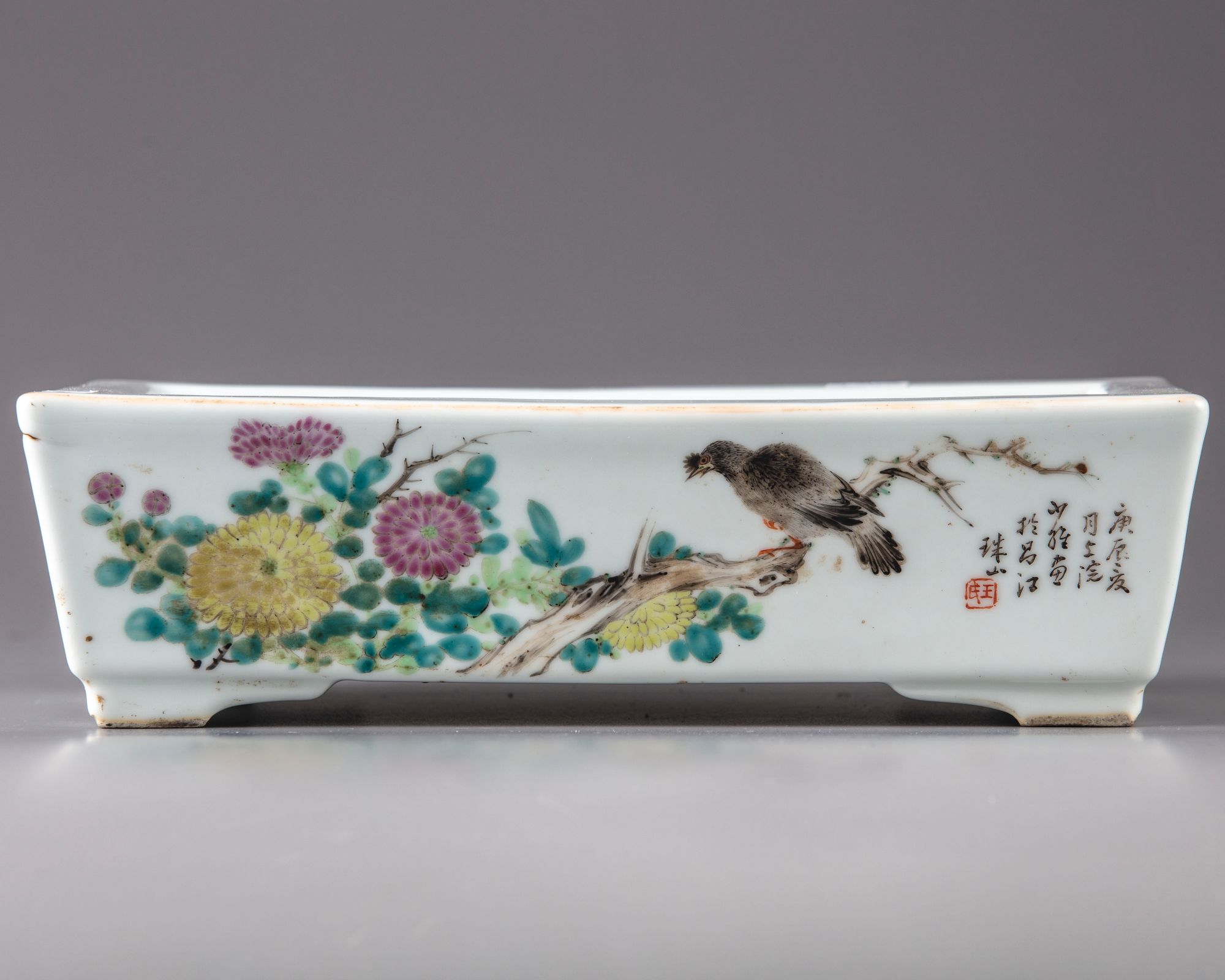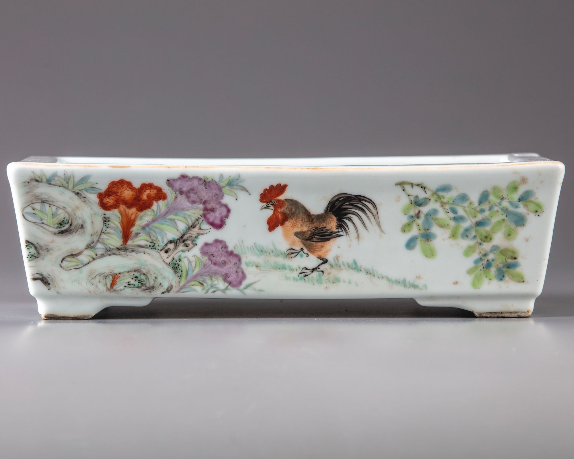 The jardenier is decorated to the wide sides with a cockerel beside moonflowers and a bird perched on peony flowering branches.
