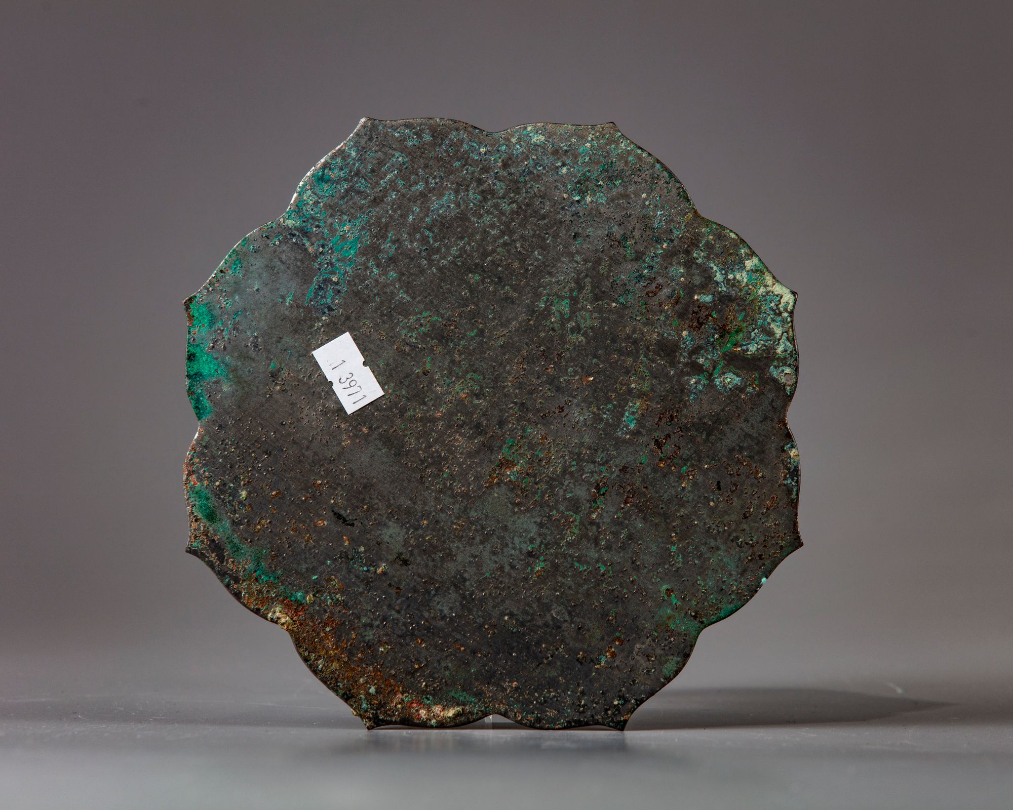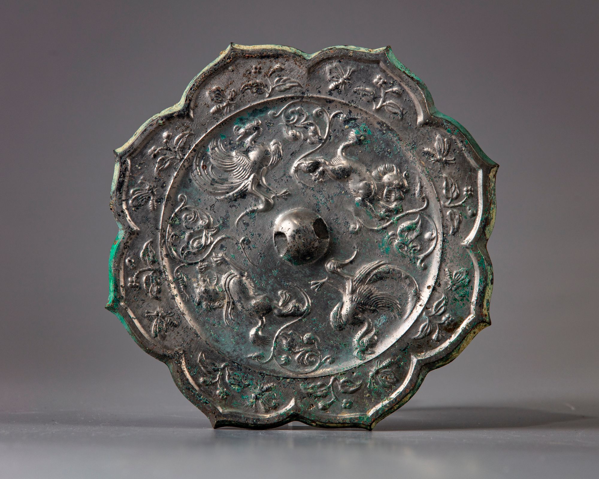 The large knob surrounded by a pair lions and peafowls within a roundel. The octafoil sides carved with flower sprays and bees.