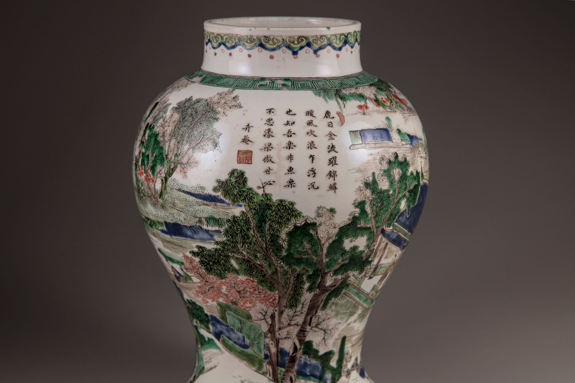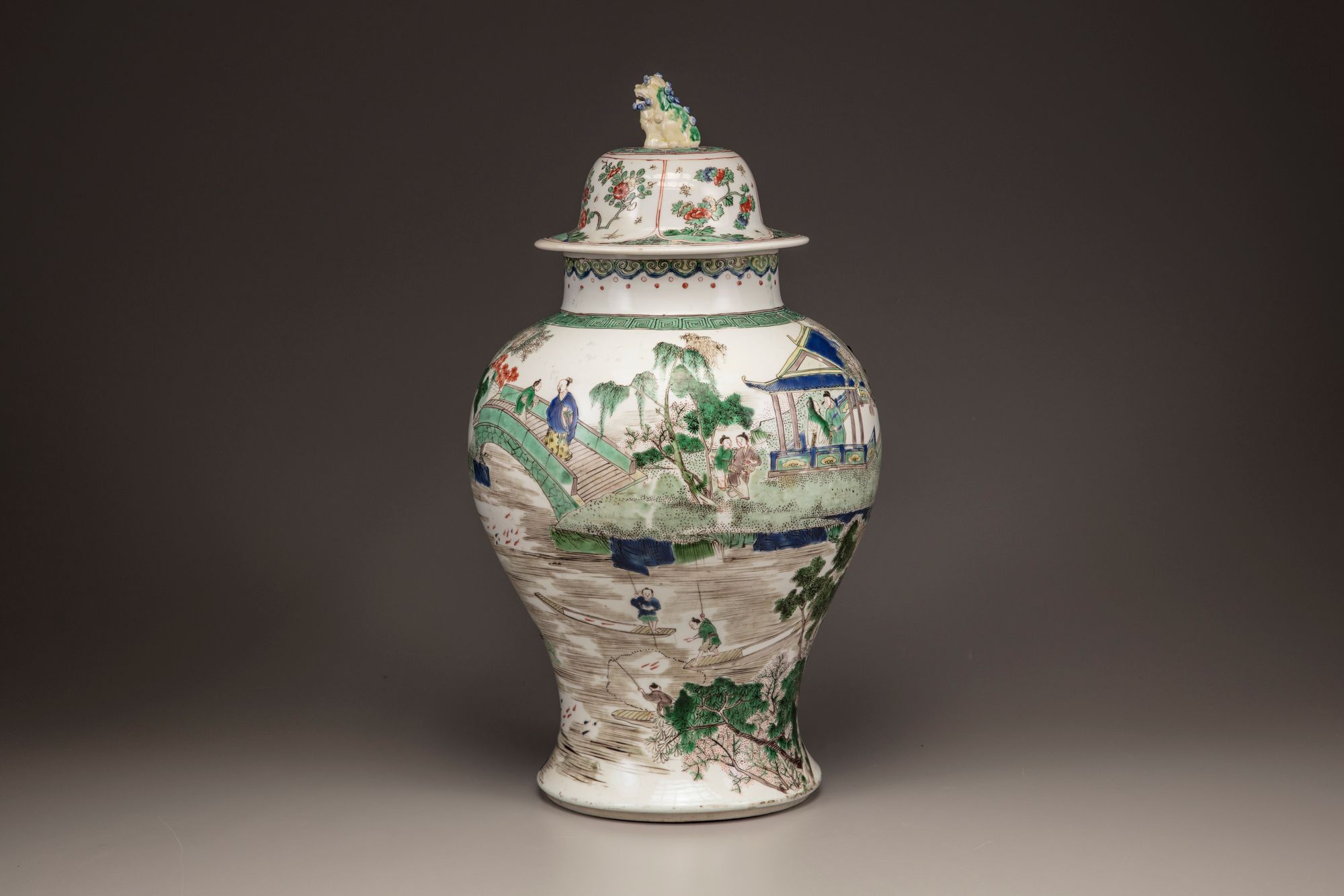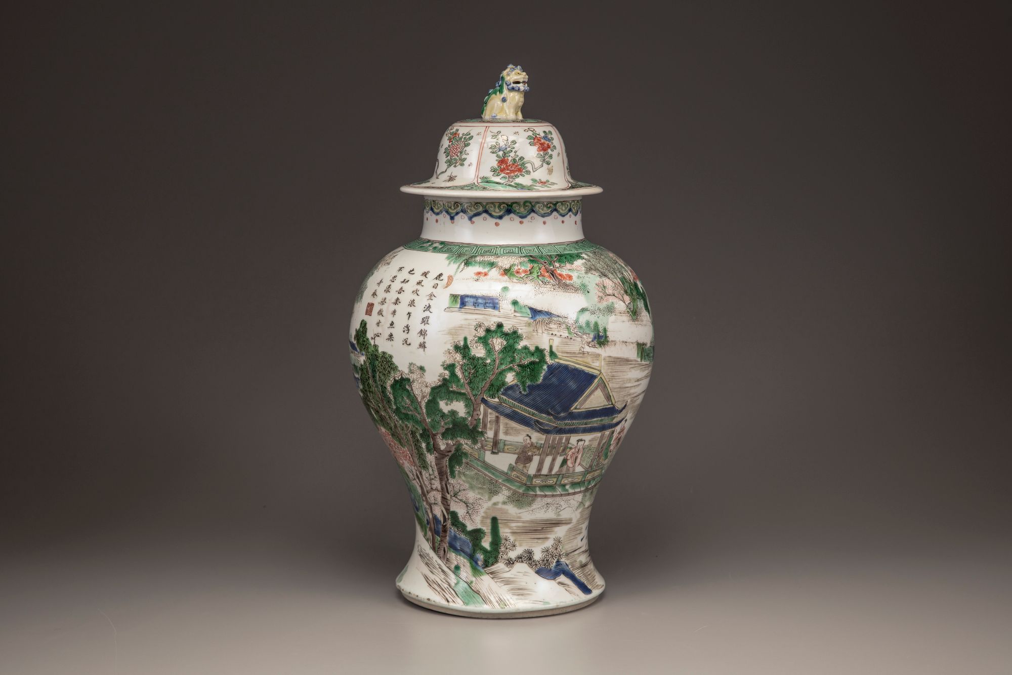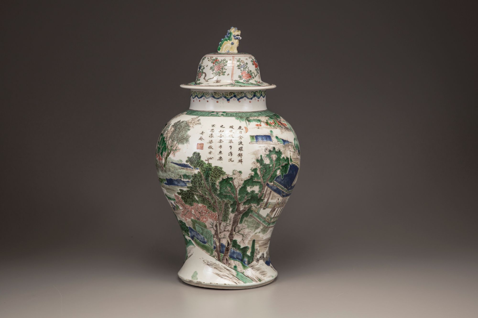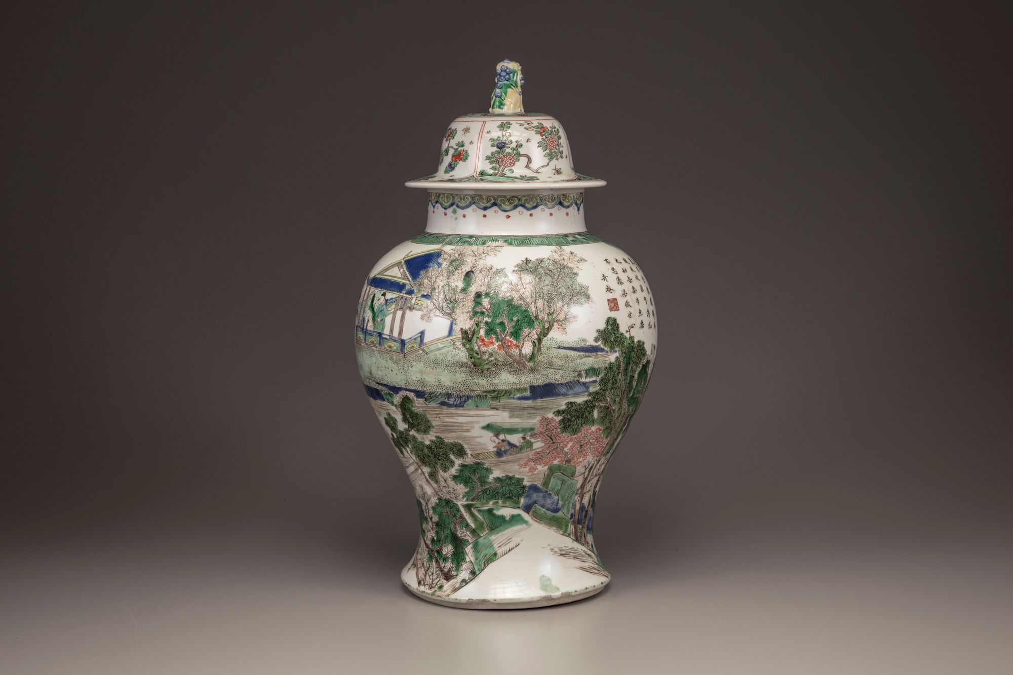 The vase is decorated with a continuous scene of scholars amongst pavilions, fishermen at work in river landscape, all below a ruyi-head and squared scroll band. The scene is accompanied by a four-line poem and signed Hui An, with an iron-red and gilt seal and an artemisia leaf. The base with a double circle in underglaze blue. The associated domed cover is decorated with floral panels and is surmounted by a Buddhist lion.