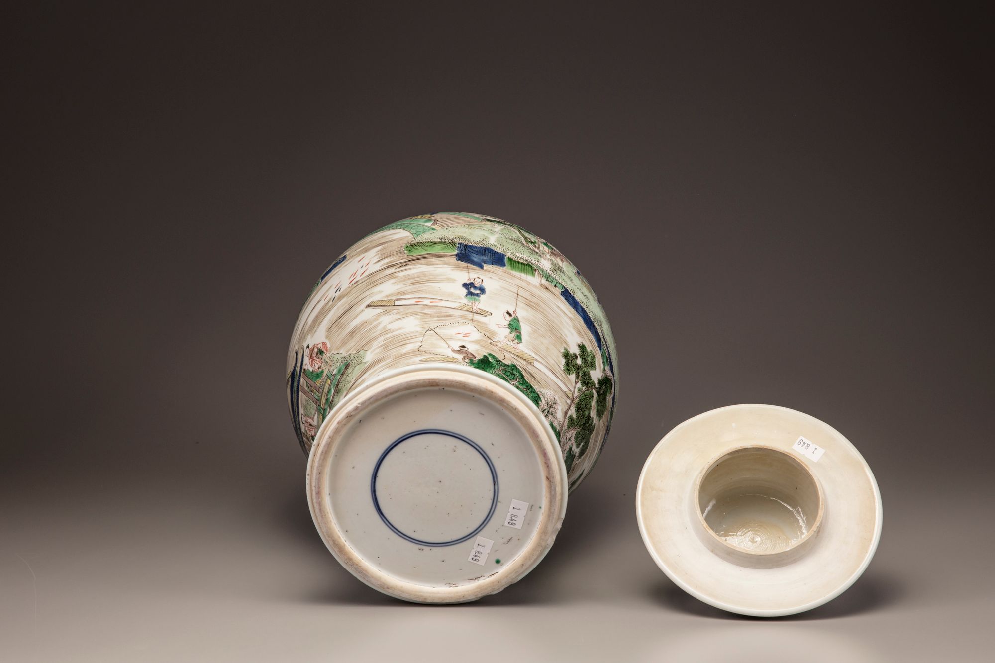 Condition: two star cracks to the interior (the larger approx. 5 cm.); chips and frits to the foot; enamel flaws. Approx 1/4 of the rim of the cover restored and ovepainted, unable to tell if composite; frits to the rim.
