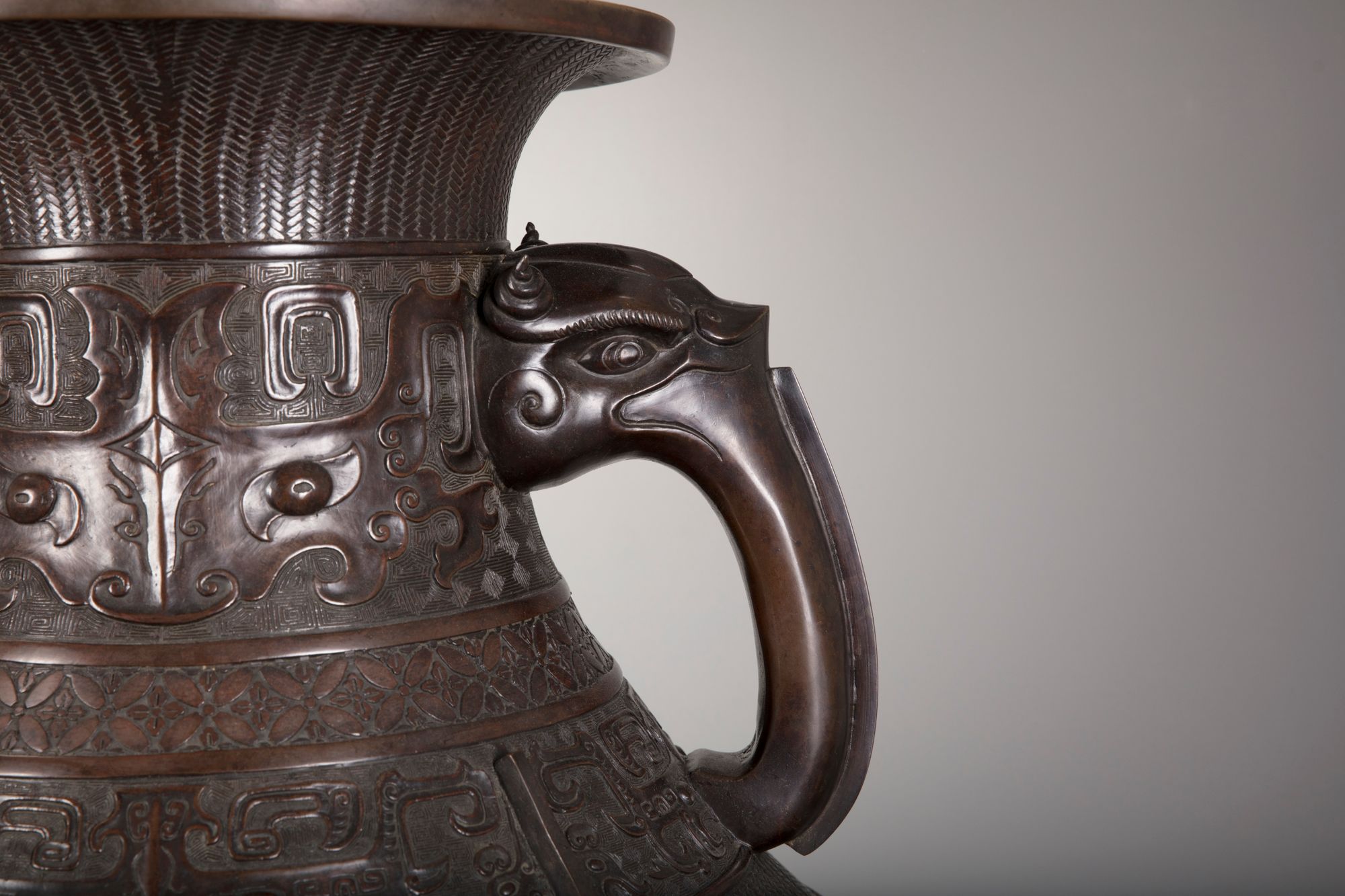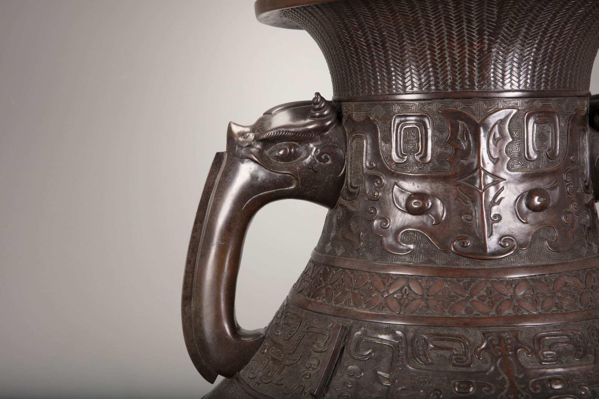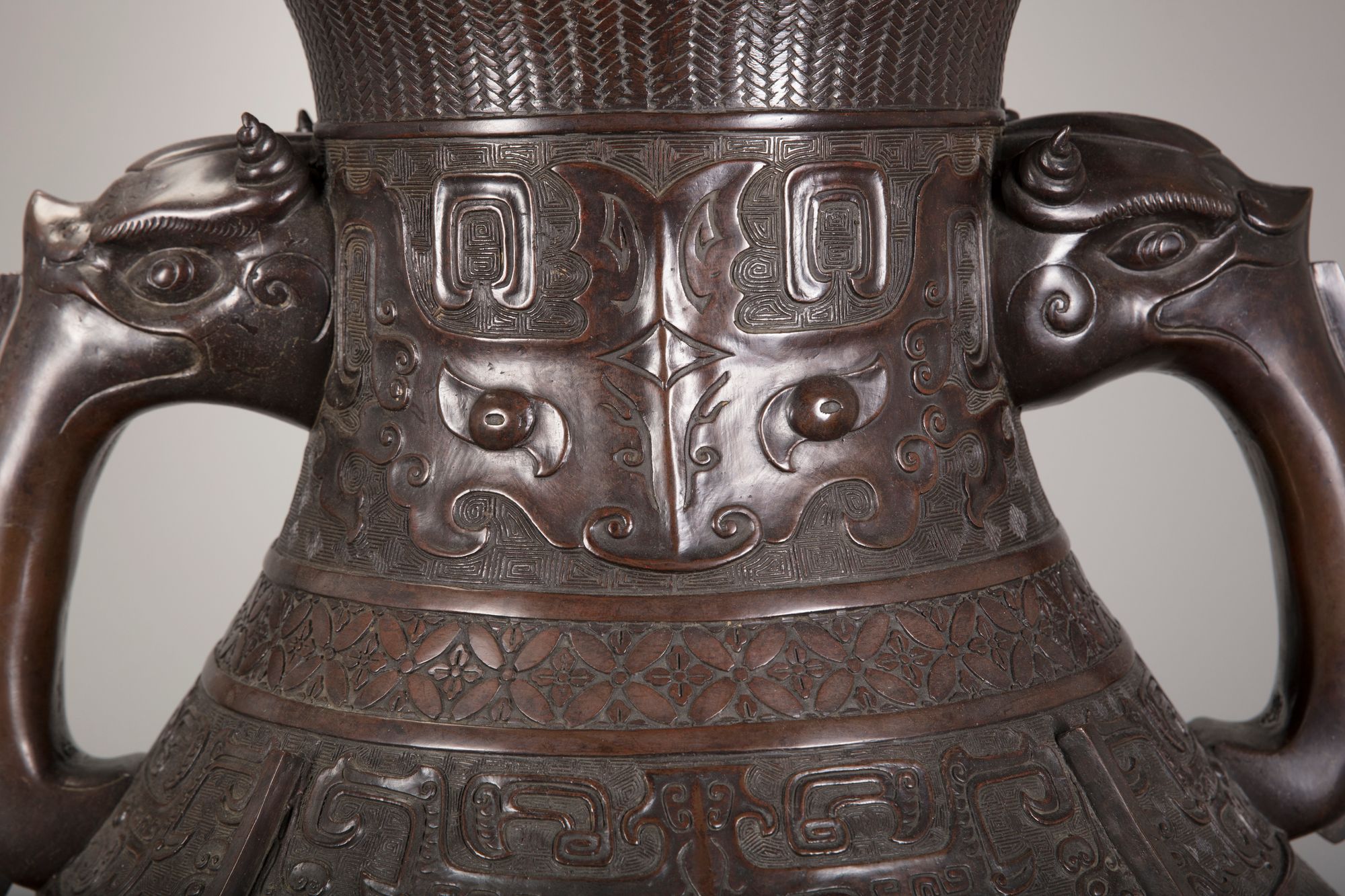 A heavy cast pear-shaped bronze archaistic style vase on high footring with two beast-head handles, decorated with various bands with Taotie masks and geometric shapes. Marked to the base with a Fangqing Xuantong mark.