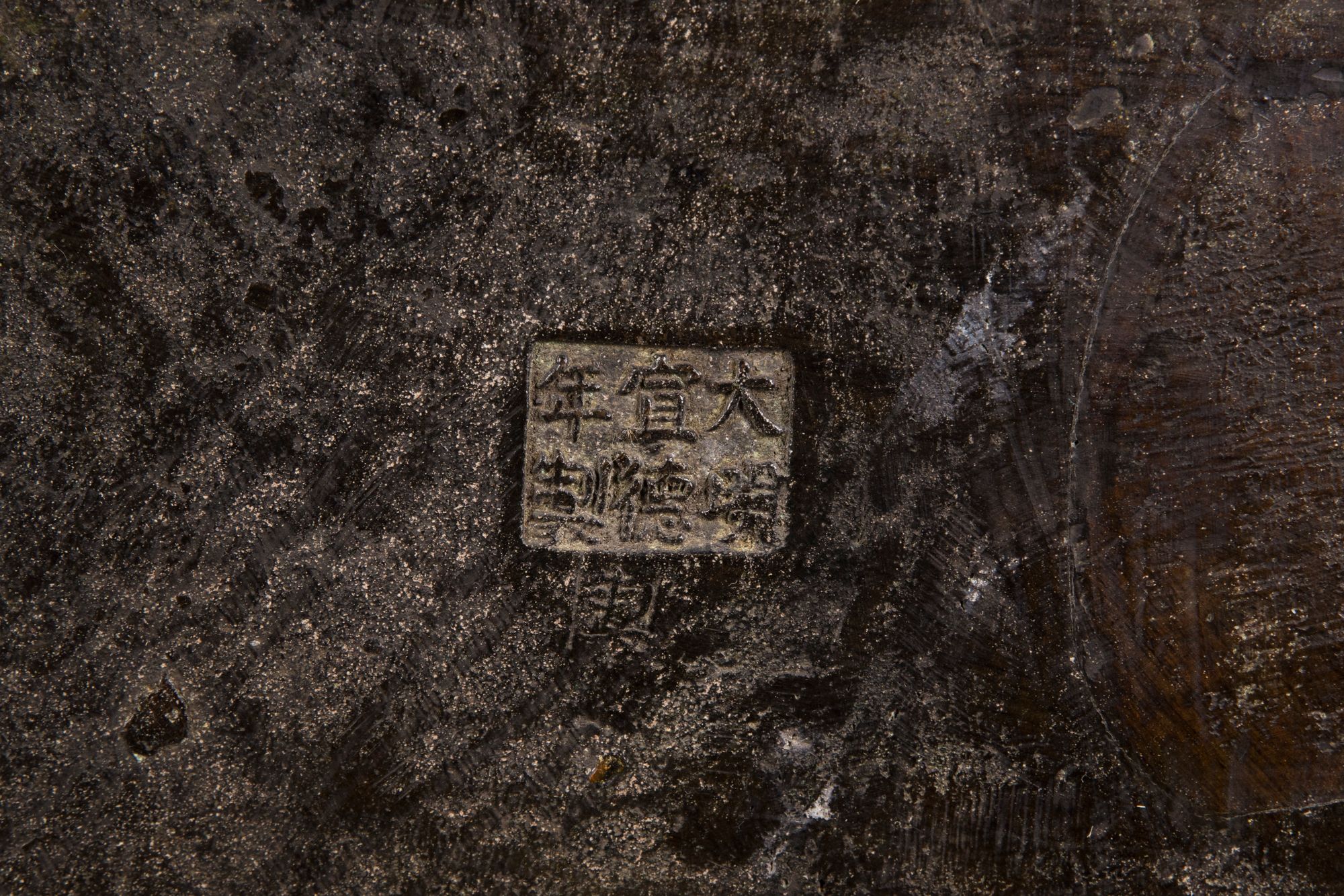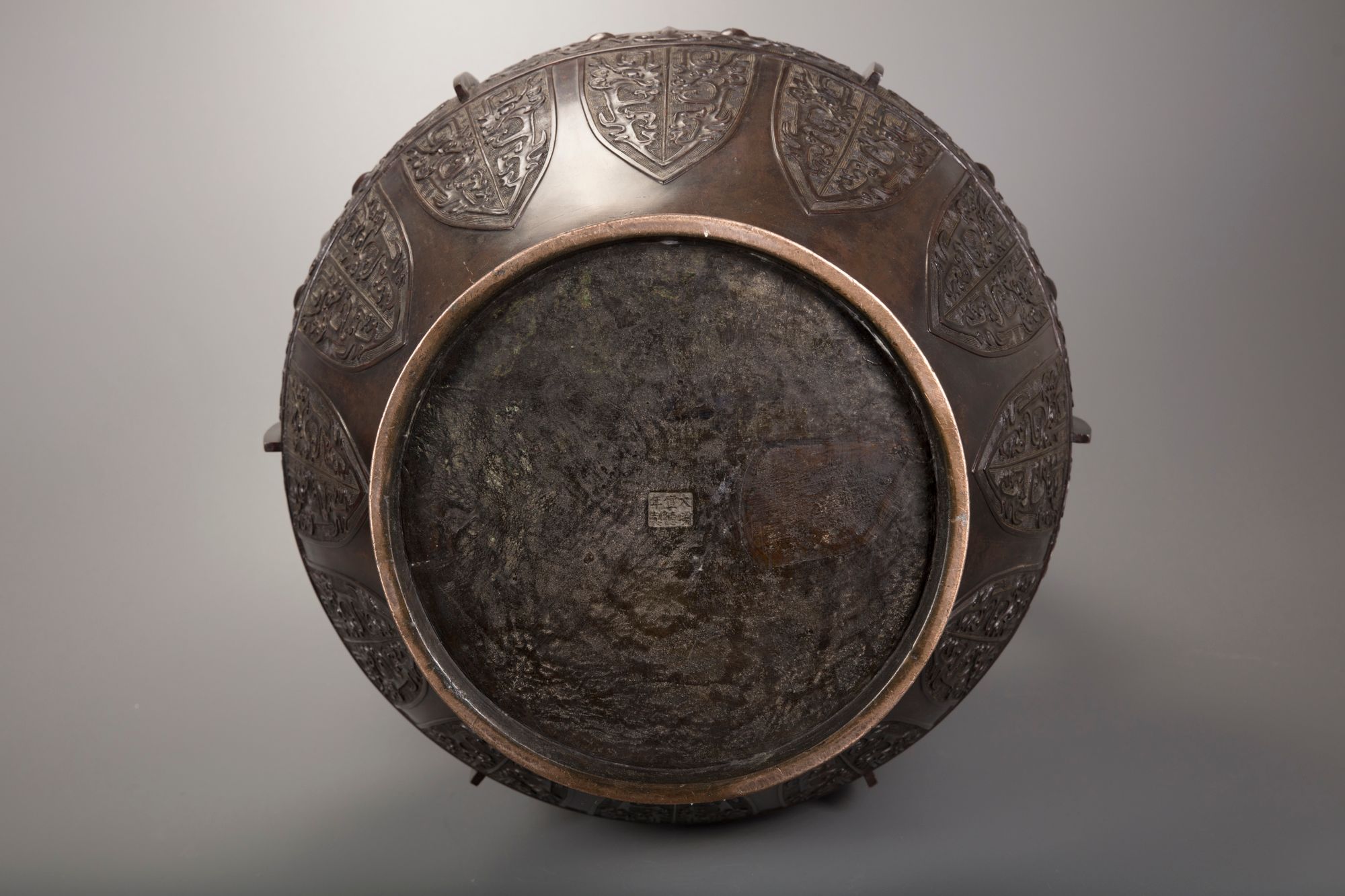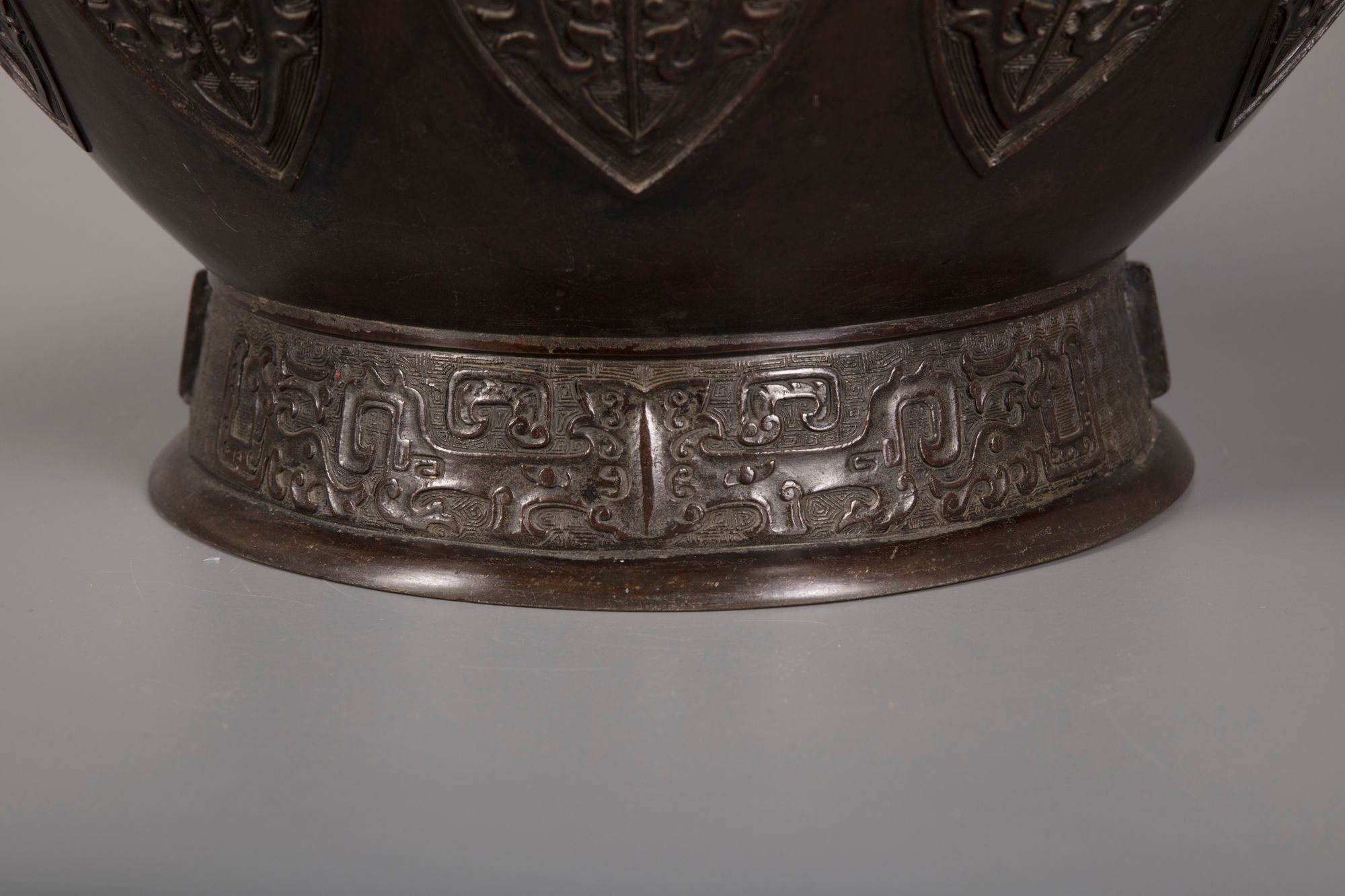 A heavy cast pear-shaped bronze archaistic style vase on high footring with two beast-head handles, decorated with various bands with Taotie masks and geometric shapes. Marked to the base with a Fangqing Xuantong mark.